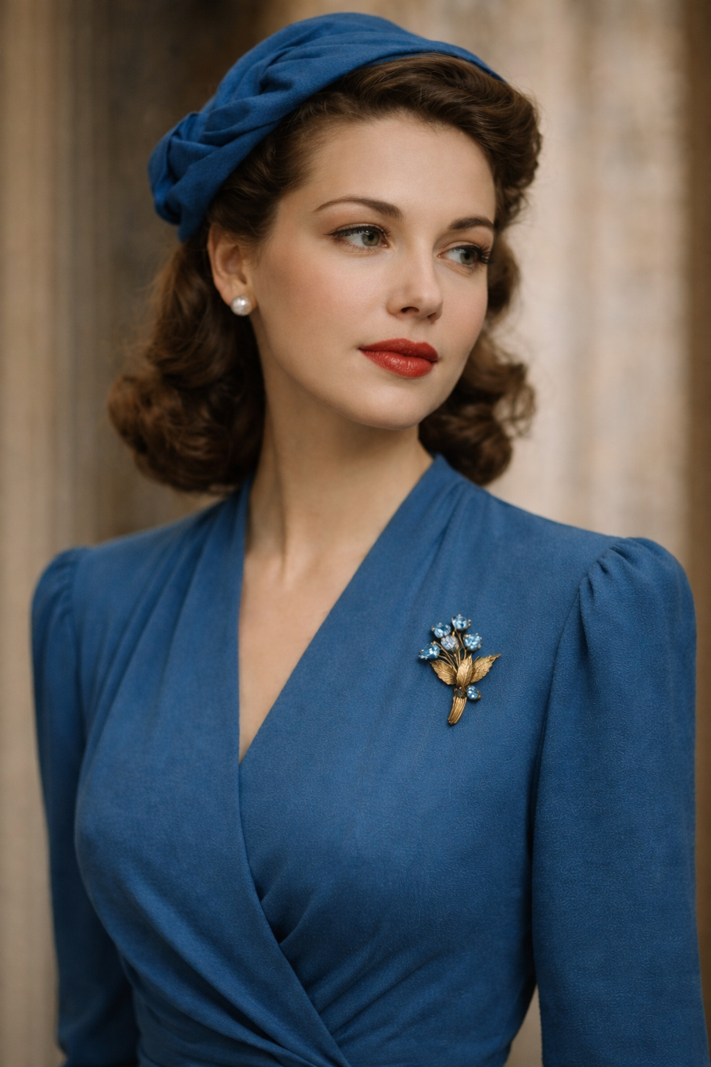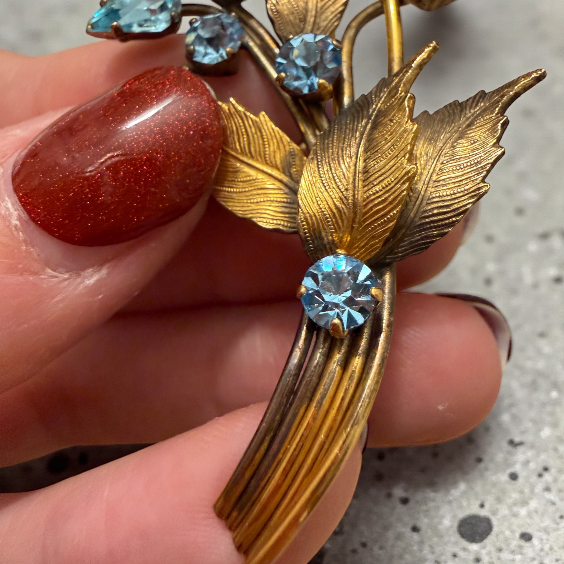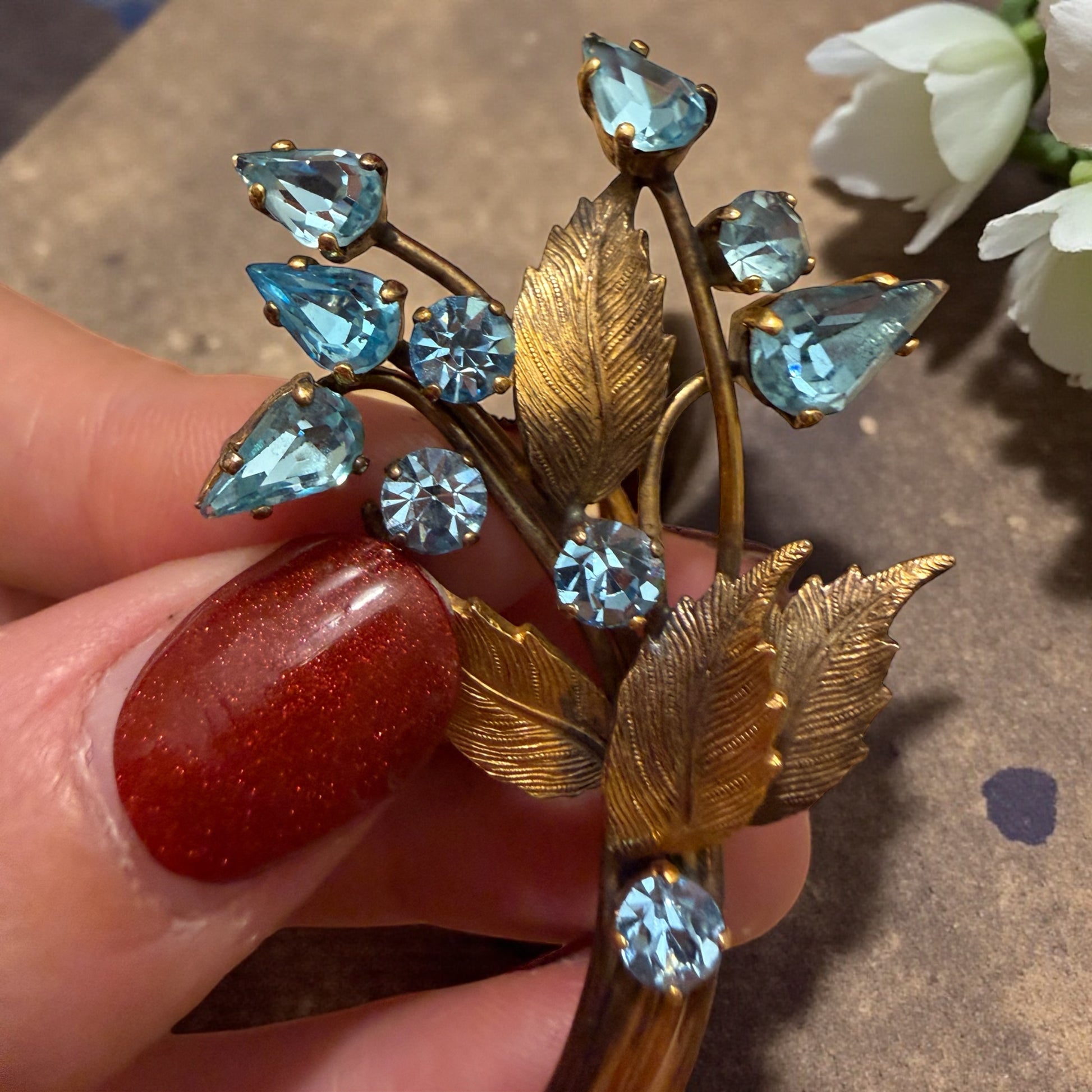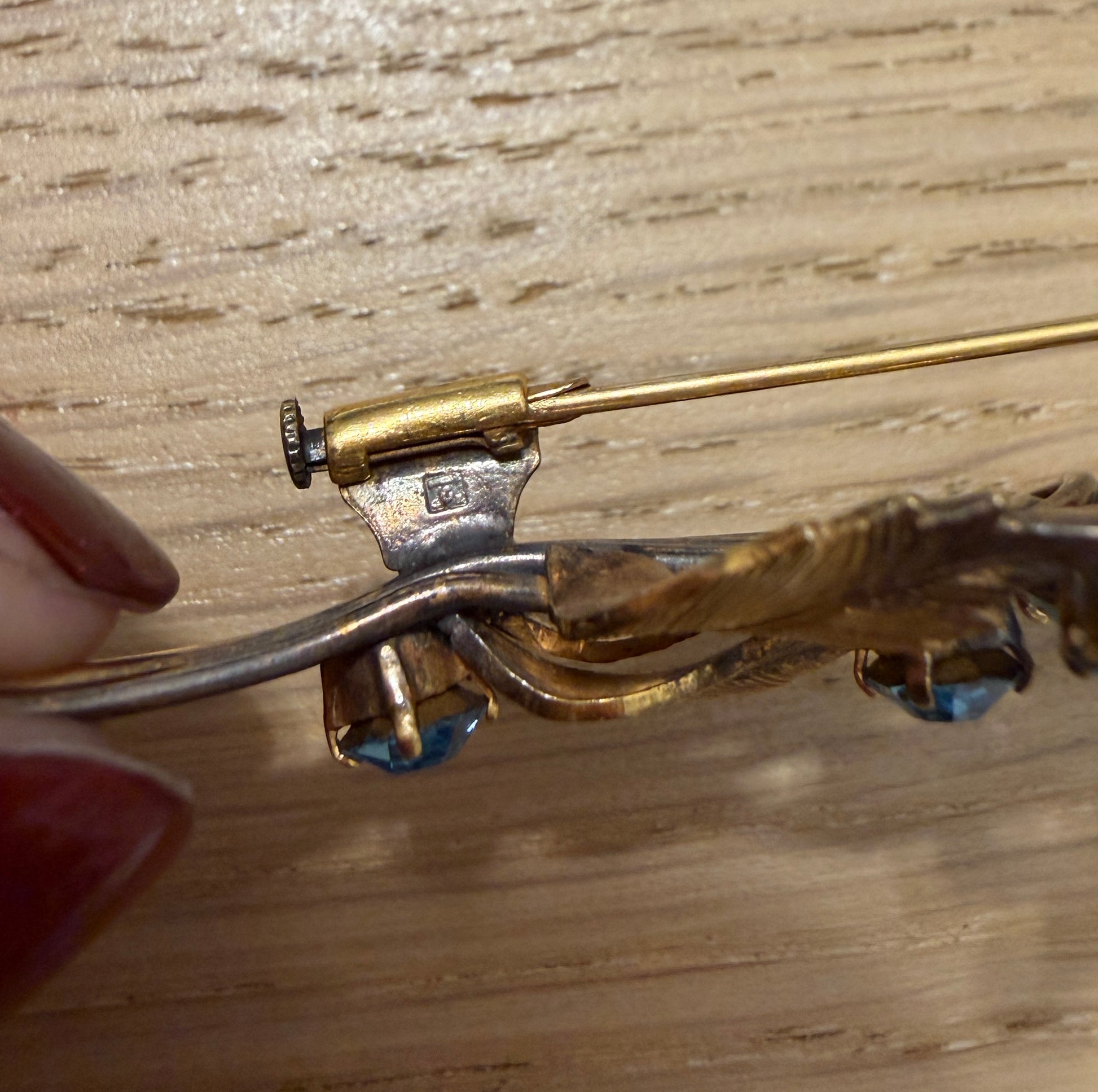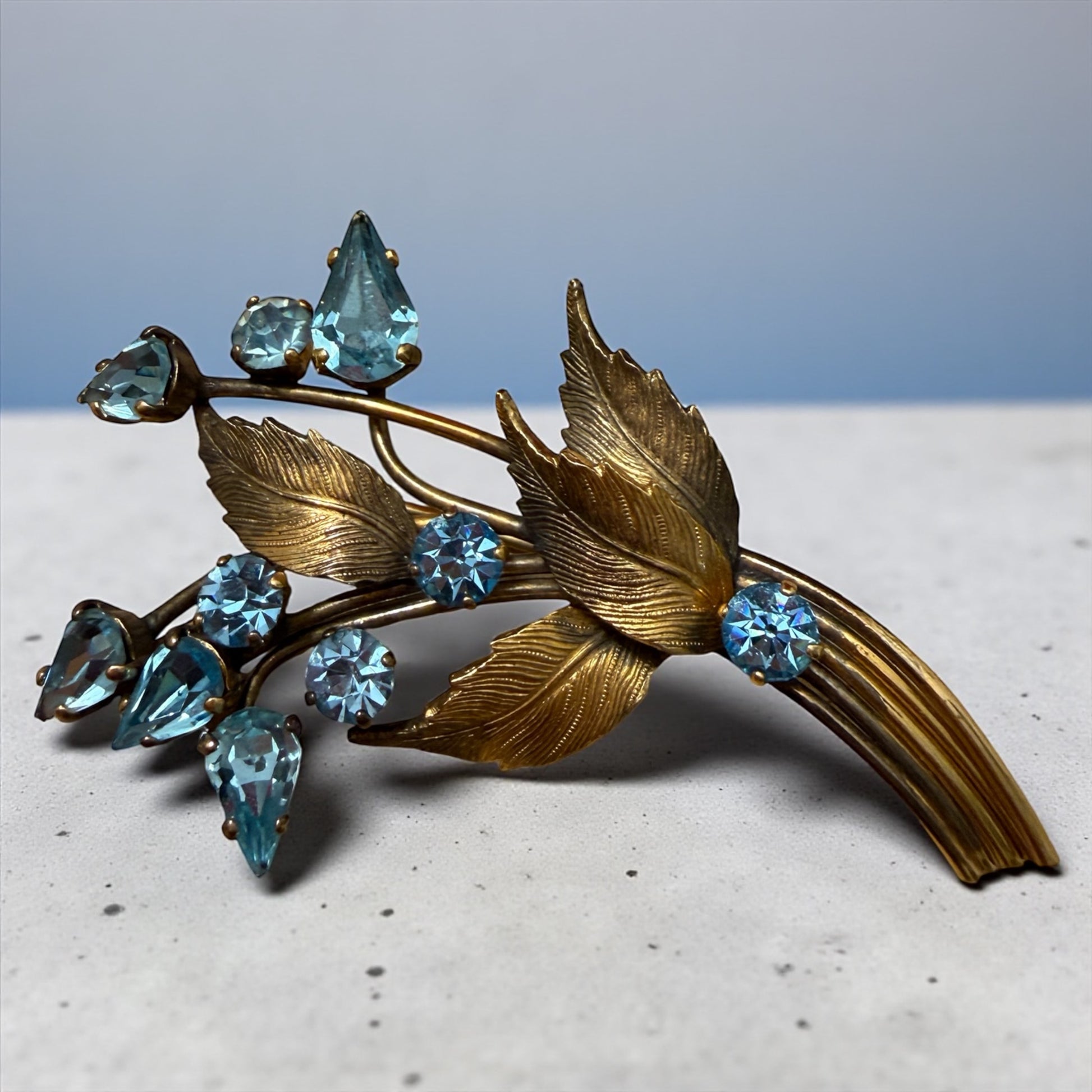 Questa spilla sembra sbocciare sul tessuto, come un piccolo ramo sospeso nel tempo. Le foglie cesellate, leggermente incurvate, accompagnano gocce azzurre luminose che catturano la luce con un riflesso acquamarina delicato, tipico del gusto anni ’40. Ogni pietra è montata a griffe — dettaglio che dona movimento e tridimensionalità — mentre gli steli sinuosi creano una composizione elegante e naturale, mai rigida. Sul retro:
