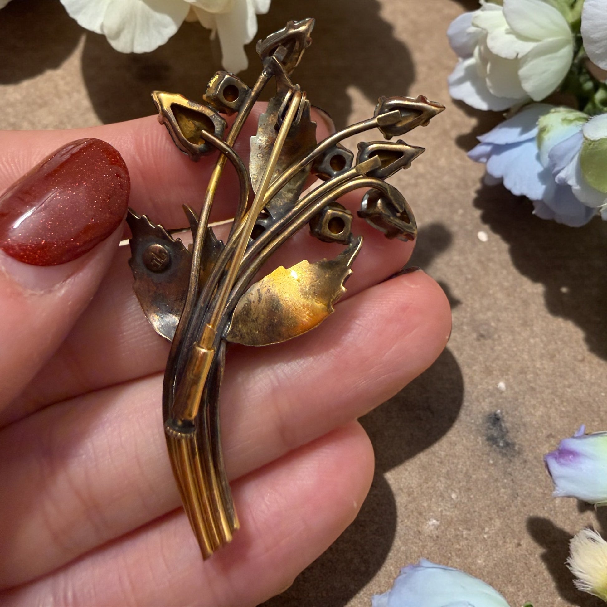 Spilla bouquet floreale anni ‘40 firmata, placcata oro con cristalli azzurri