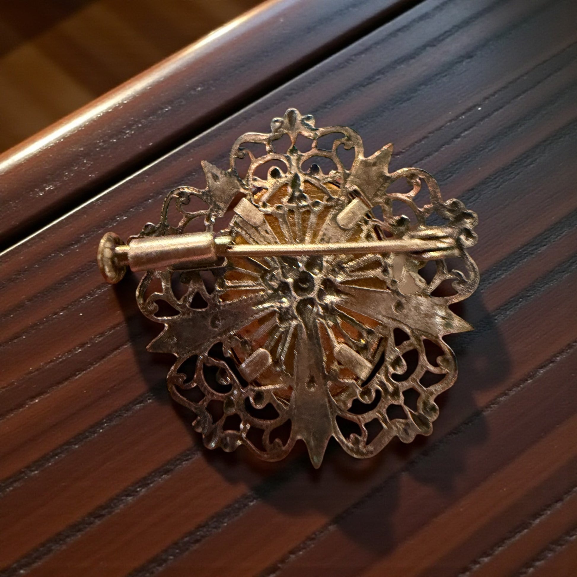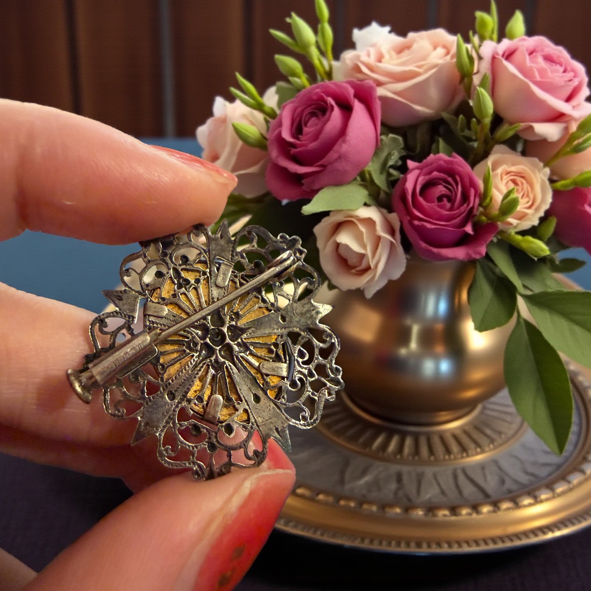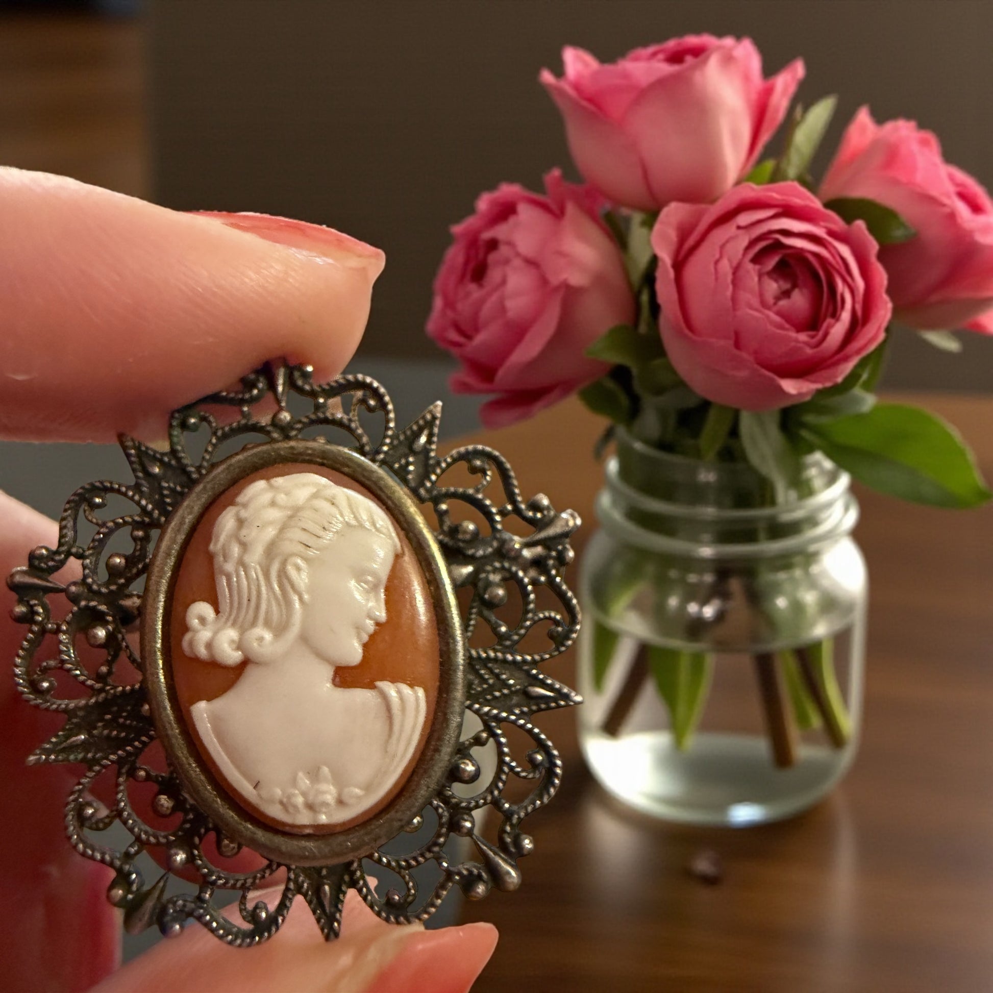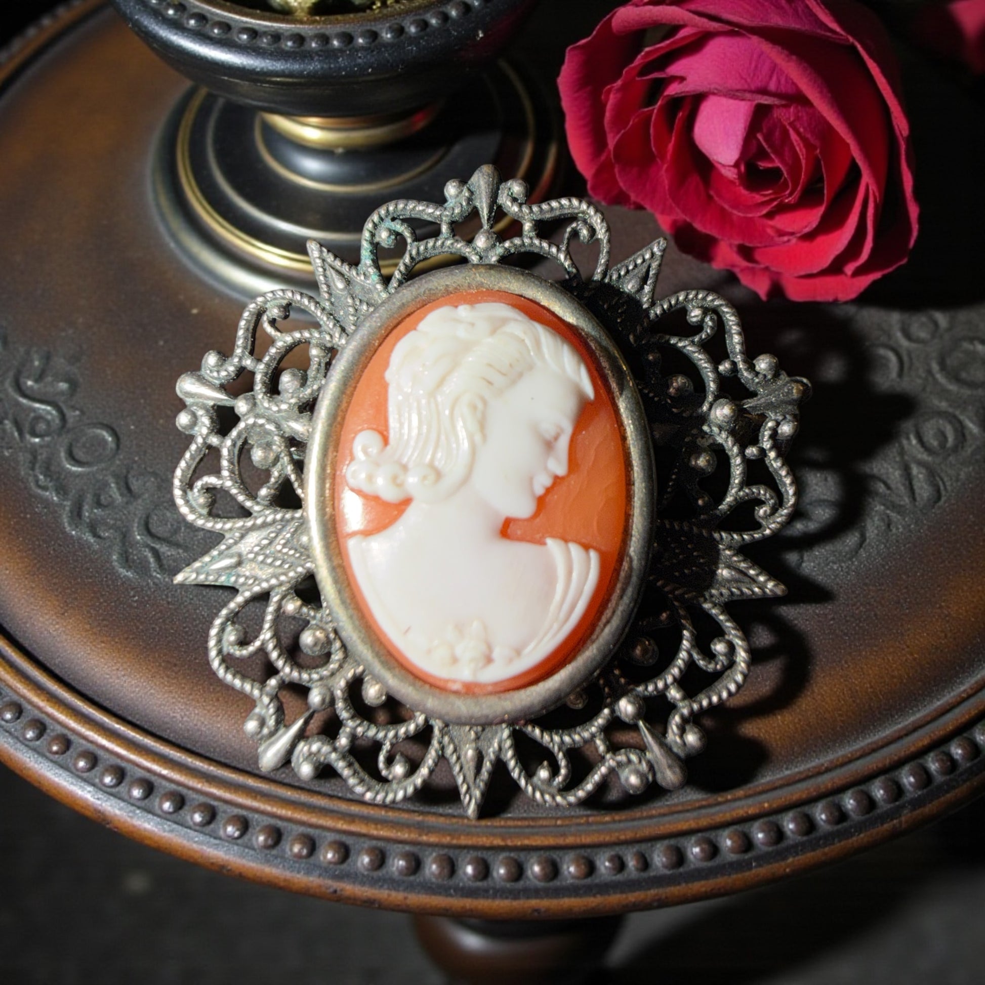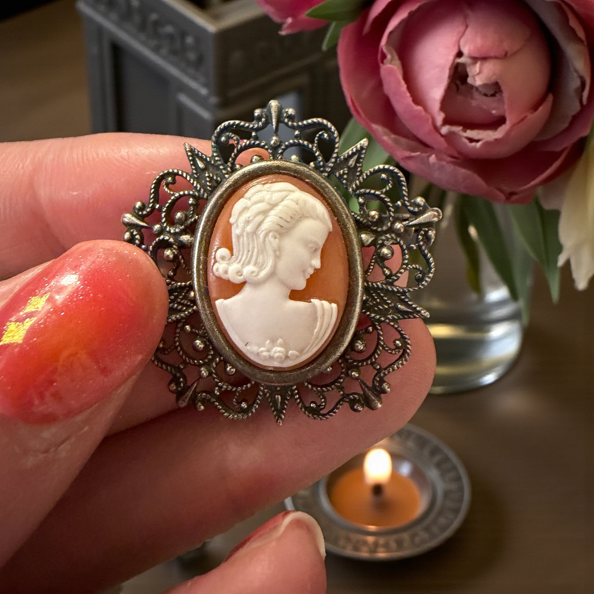 C’è qualcosa di profondamente equilibrato in questa spilla: il cammeo, compatto e silenzioso, sembra custodire una presenza, mentre la filigrana d’argento intorno disegna aria e movimento.
