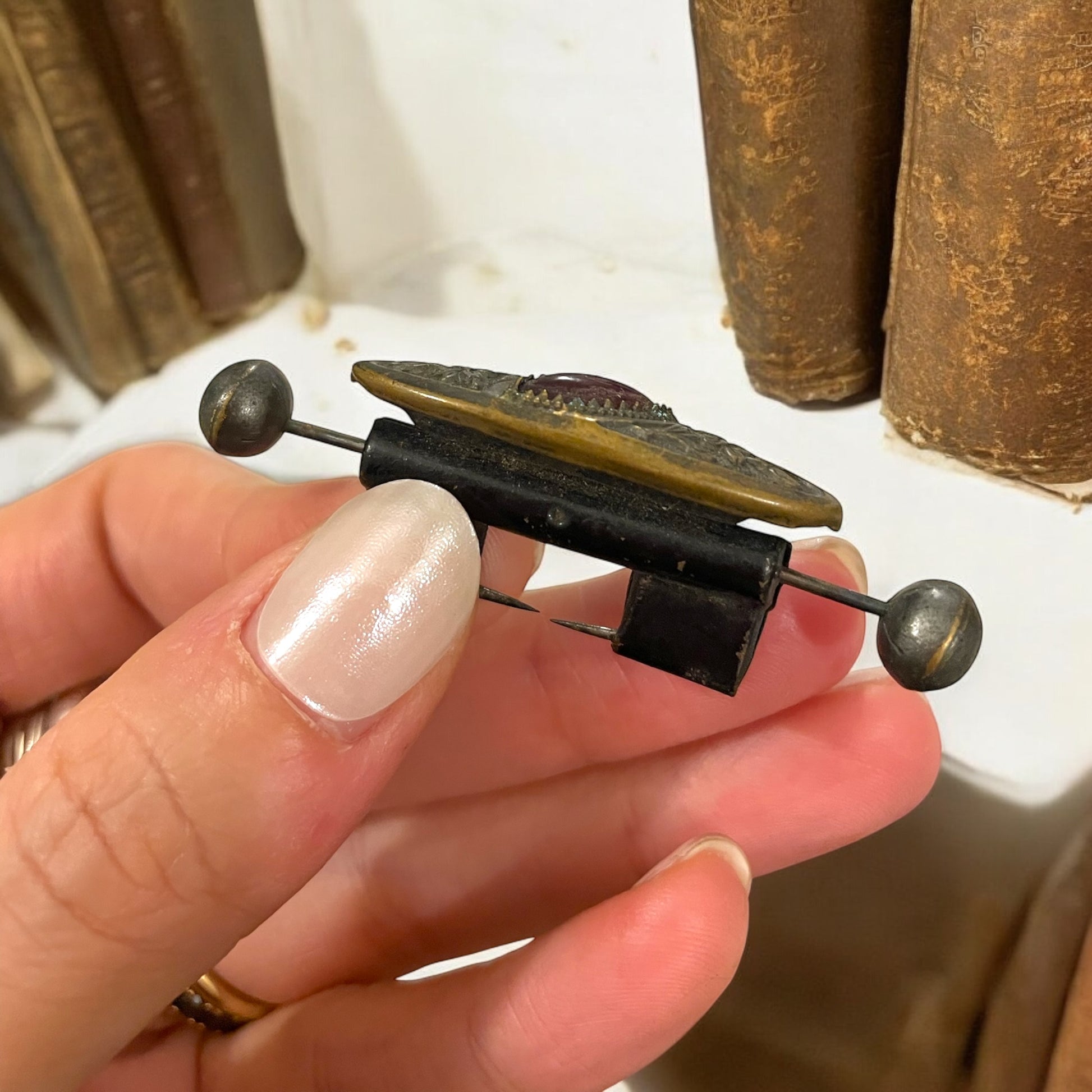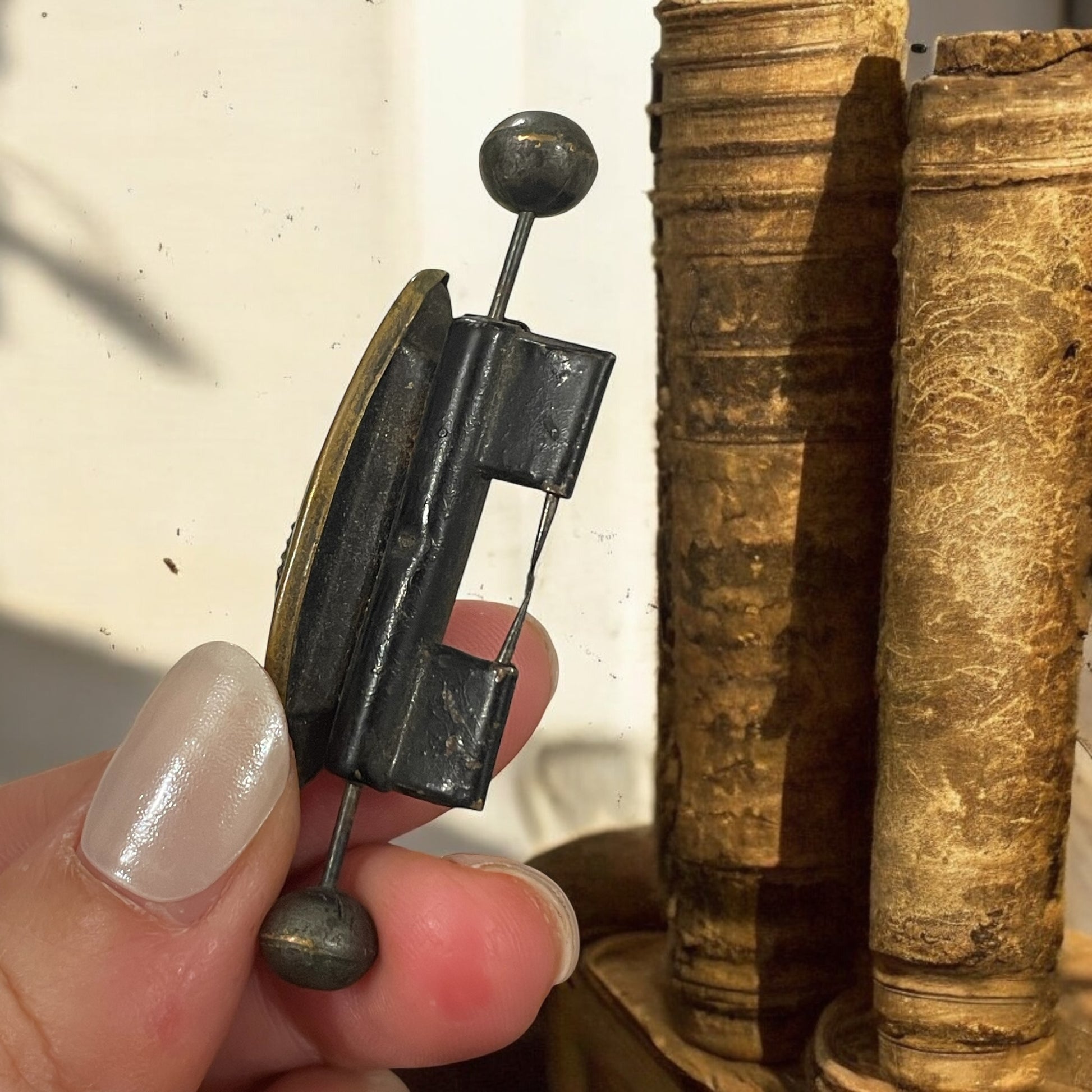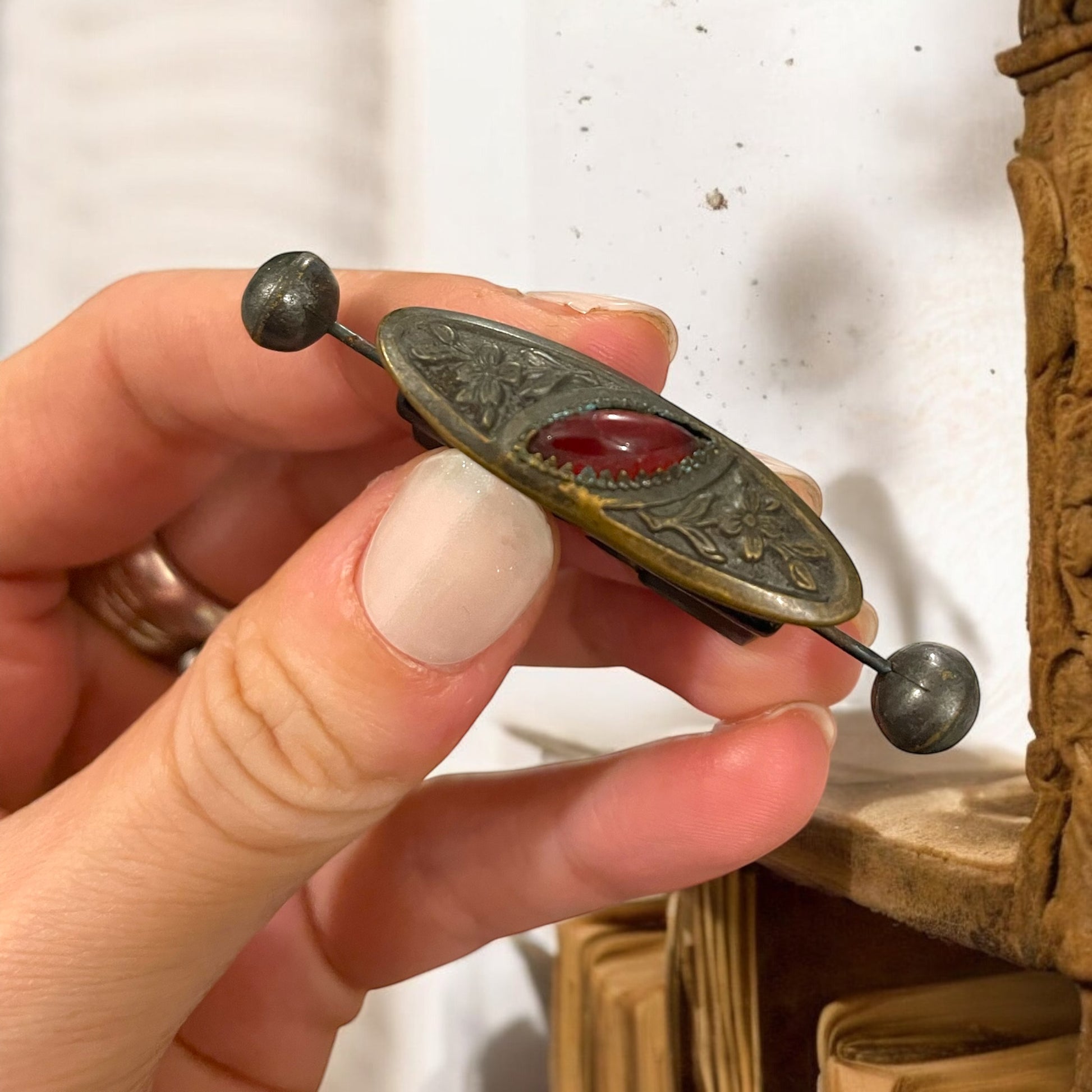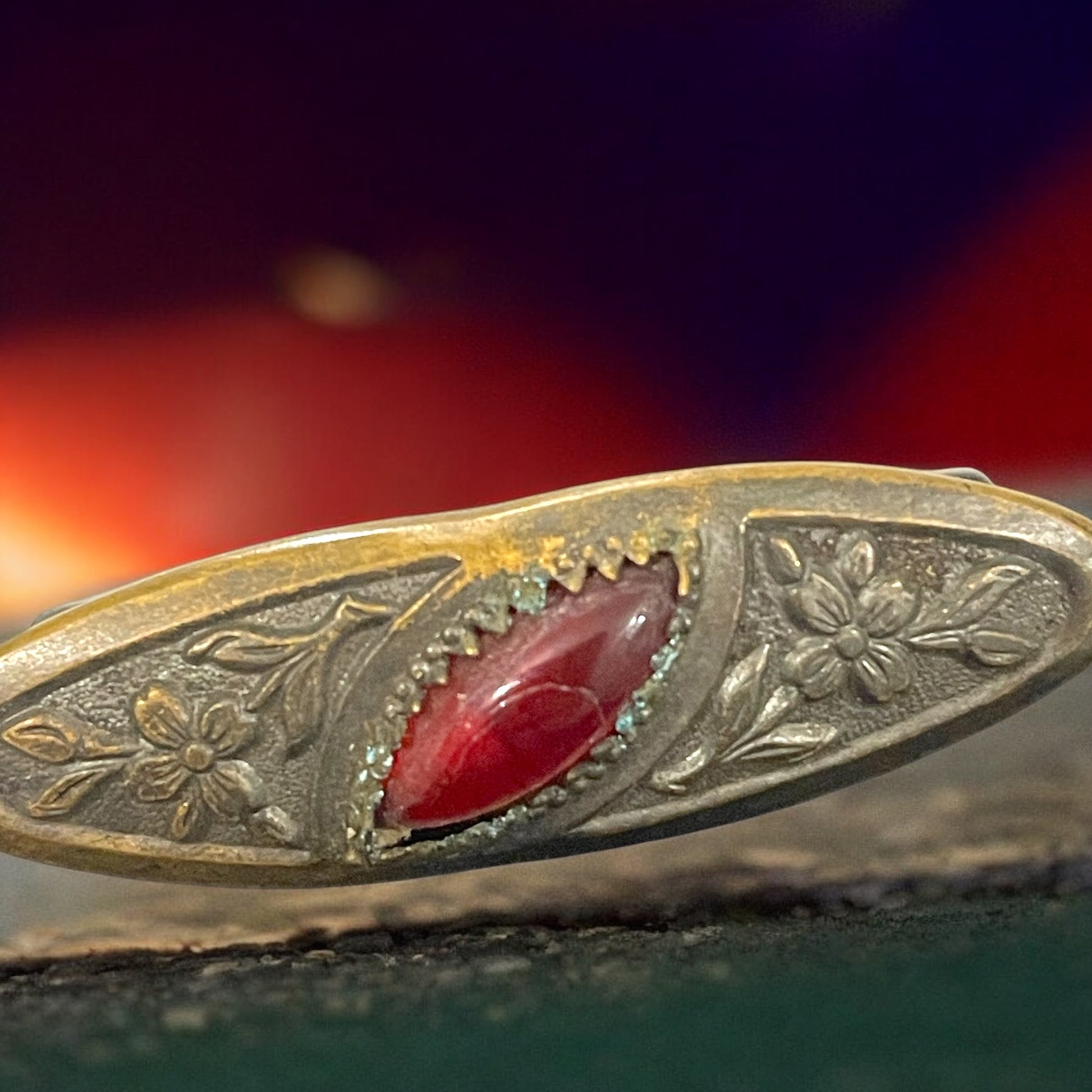 Aprendo il cassetto nascosto di un antico scrittoio, in una soffitta dove il tempo sembrava essersi fermato, ho trovato questa spilla. Era lì, tra vecchie lettere sbiadite dal tempo e un piccolo quaderno con una scrittura quasi illeggibile, come se fosse stata dimenticata insieme a un segreto. Sul metallo brunito la delicatezza di un’epoca lontana: i fiori sembrano raccontare la poesia della natura, un tempo catturata dall’arte delle mani esperte. La doratura oramai sbiadita e, al centro, la pasta di vetro rossa (con una piccola crepa che non ne toglie bellezza) che brilla come un piccolo fuoco. Sembra una piccola scintilla questo gioiello, che forse ha decorato una mantella durante una fredda sera d’inverno o una passeggiata sotto i lampioni a gas. È lunga circa centimetri 5, premendo contemporaneamente i due pomoli si ritraggono i dentini permettendo di fissarla sul tessuto. Si tratta di un oggetto molto antico e con molta poesia; più da conservare che da indossare.