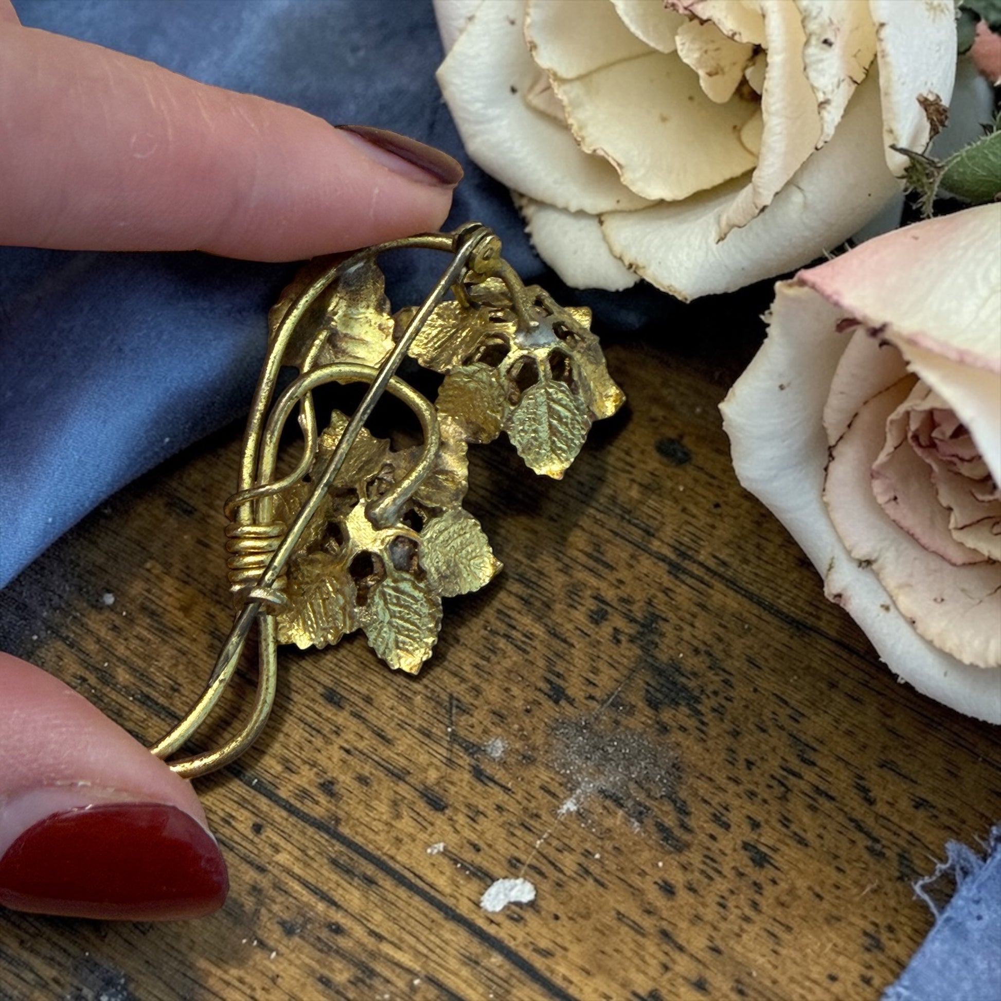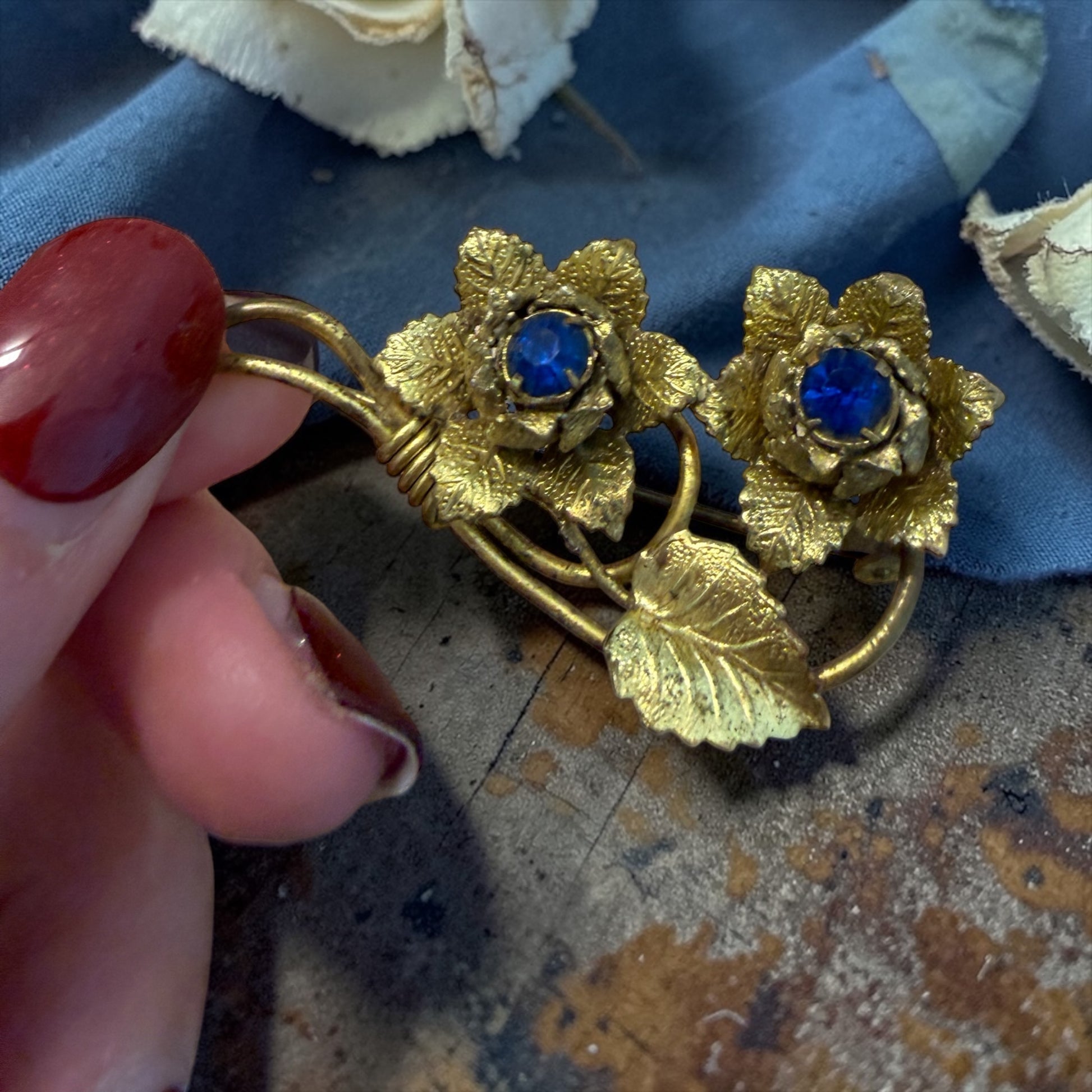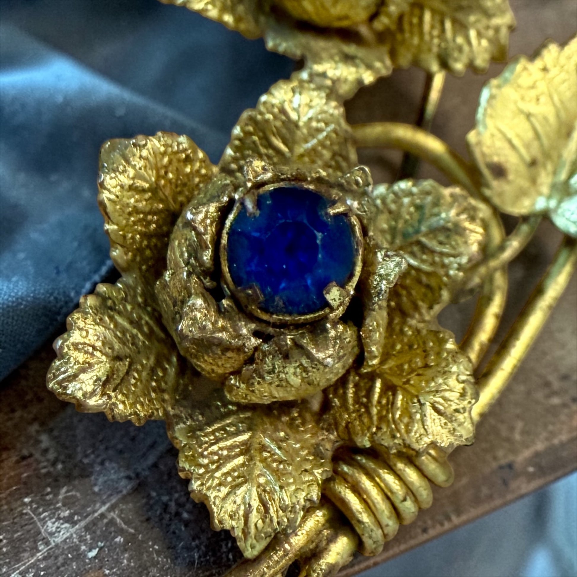 È una spilla che racconta il dopoguerra, quando la femminilità tornava a fiorire dopo anni difficili. Non ostentazione, ma grazia. Non ricchezza, ma presenza. Le pietre sono in vetro sfaccettato color zaffiro; una presenta una lieve scheggiatura invisibile indossata. La struttura è in lega dorata con chiusura ad anello semplice, tipica delle produzioni tra anni ’40 e primi ’50.