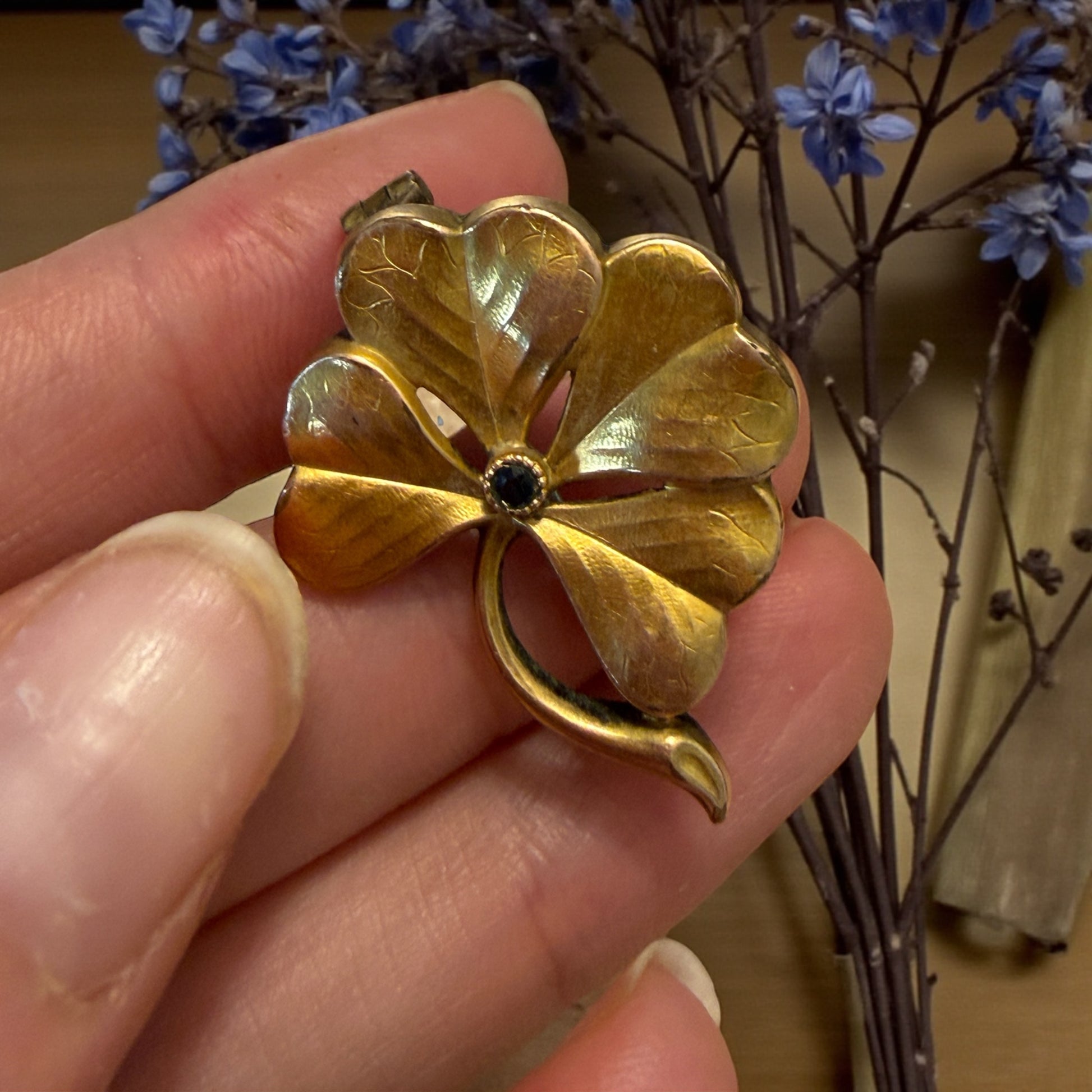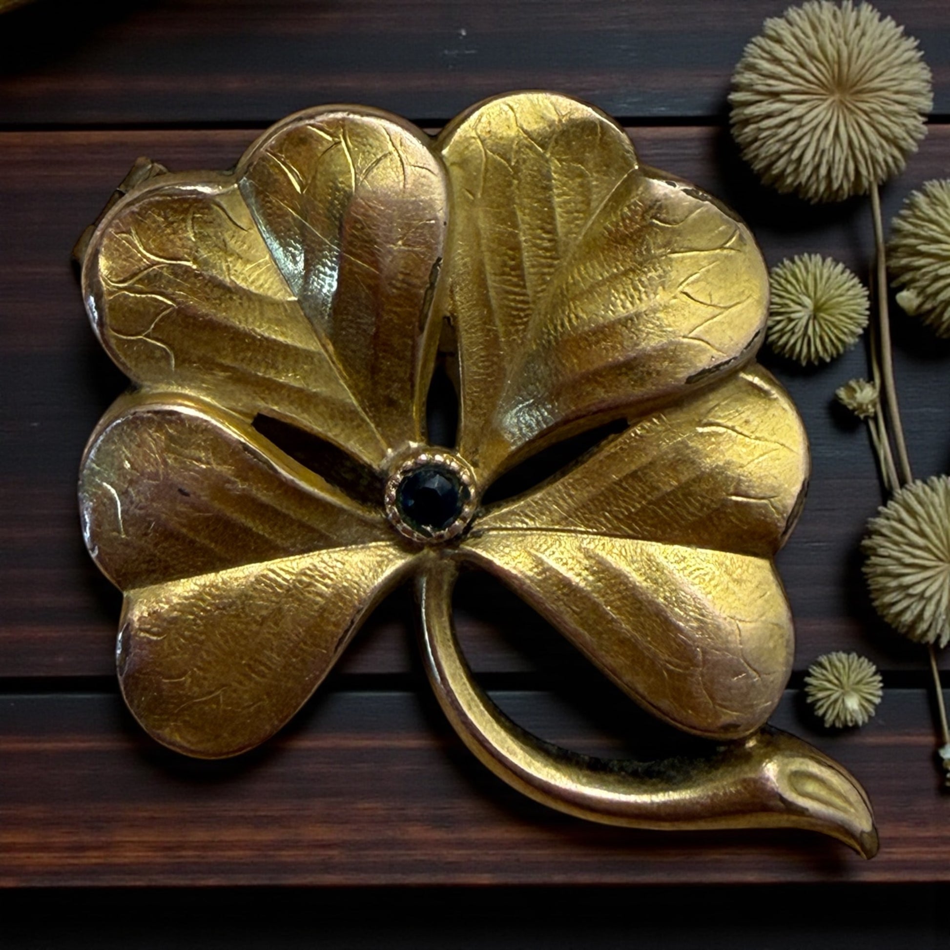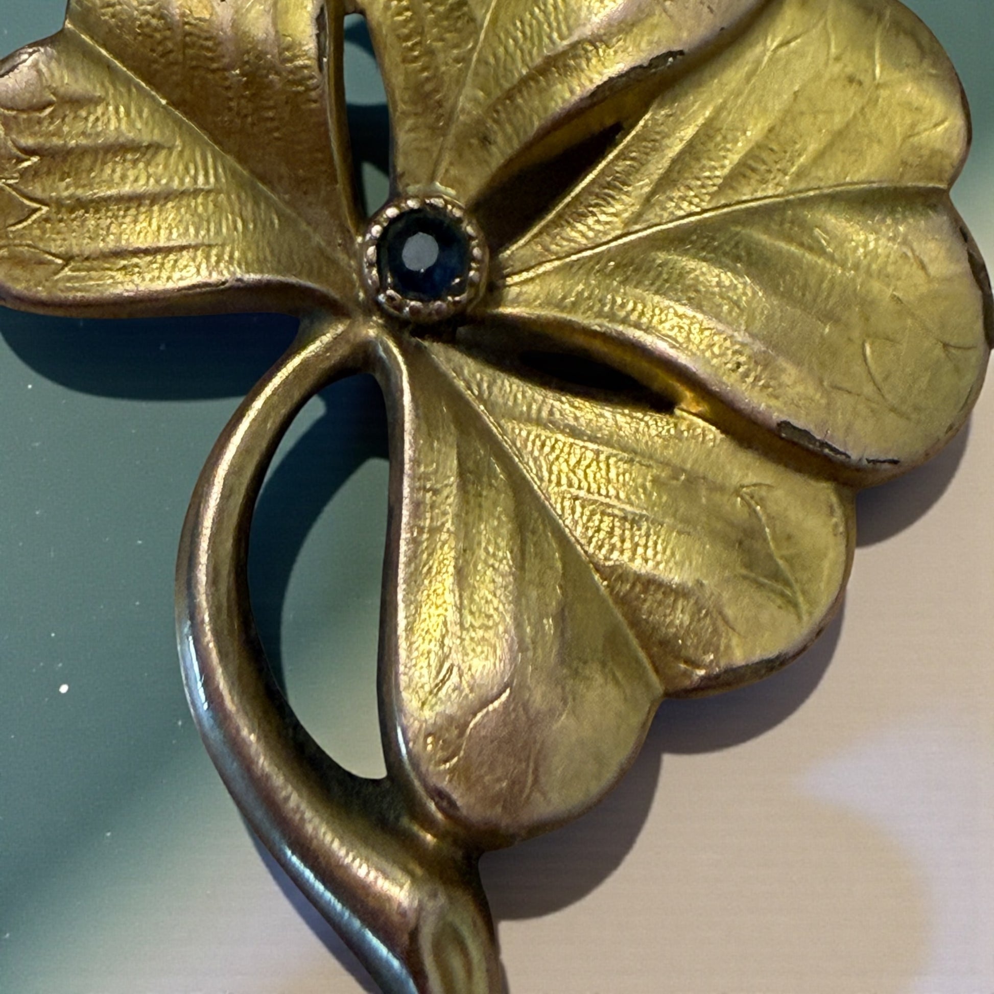 Un quadrifoglio placcato oro, pensato per essere portato addosso come un gesto di fiducia. Le sue foglie sottili mostrano nervature incise una a una, leggere e imperfette, come se fossero state modellate per accompagnare una persona in silenzio. Al centro, una piccola pietra scura trattiene la luce senza rifletterla del tutto, discreta, quasi protettiva. Questa spilla nasce nei primi anni del Novecento, quando anche un accessorio poteva avere un significato preciso: essere un segno, un augurio, qualcosa da appuntare prima di uscire di casa o da ricevere in dono in un momento importante. Sul retro compare la punzonatura FIX, marchio che identifica una placcatura in oro su metallo, tipica delle produzioni mitteleuropee dell’epoca. La patina è autentica, lasciata intatta, e racconta un tempo lungo e gentile. Un oggetto piccolo, ma denso di senso.