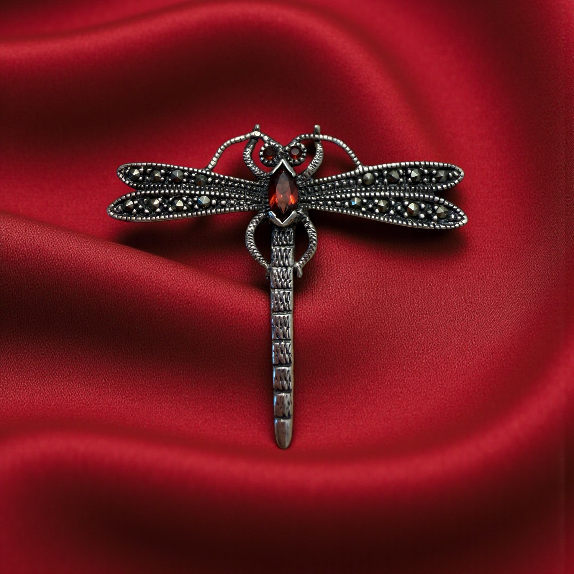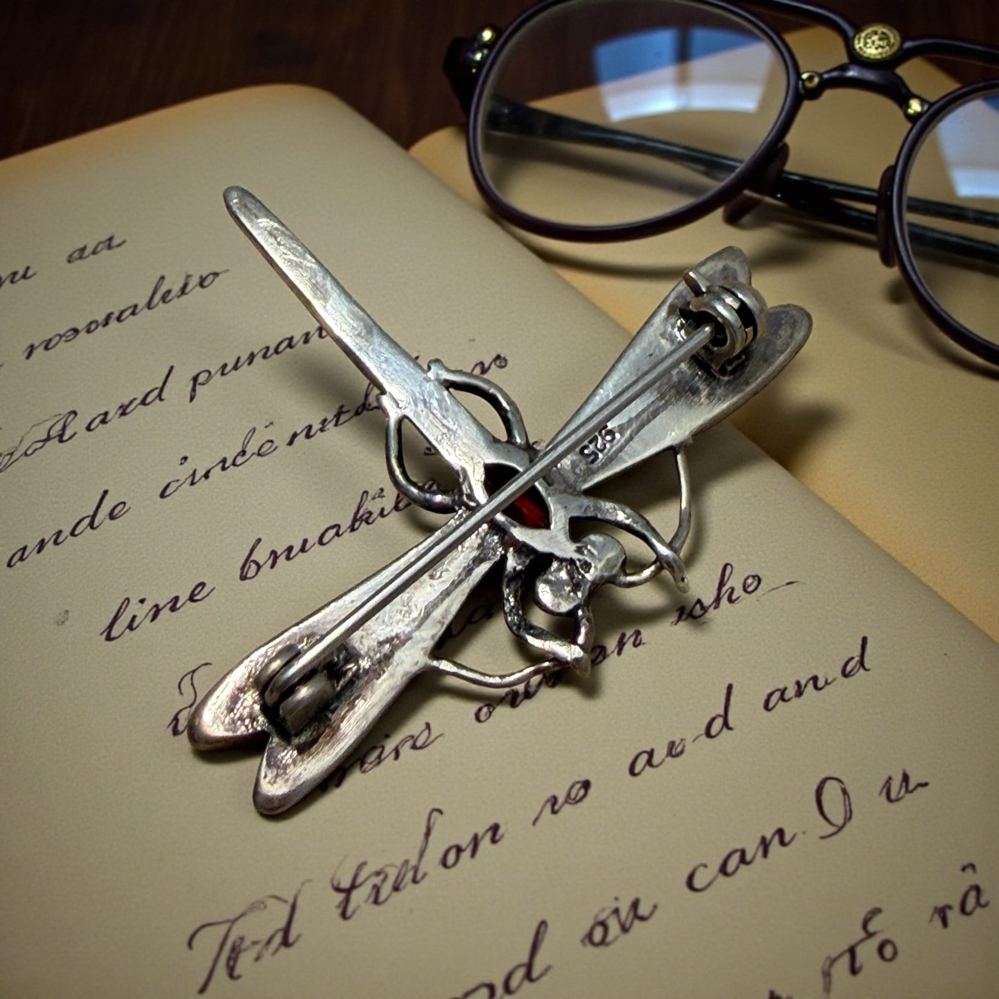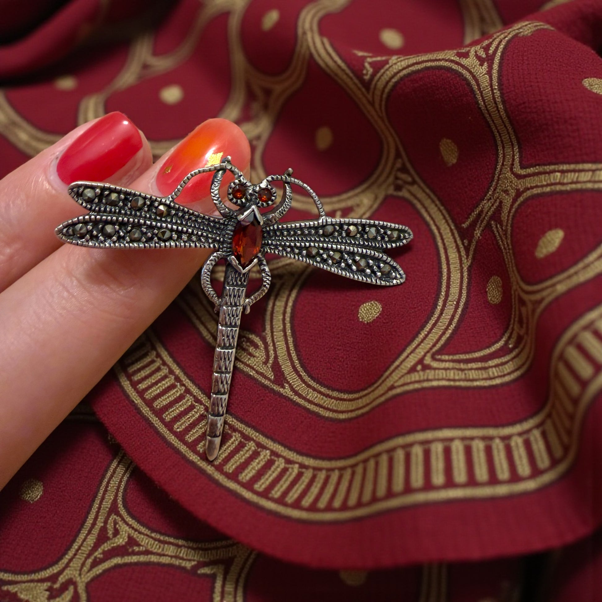 C’è un momento, entrando in una stanza illuminata appena da una finestra, in cui la luce sembra fermarsi su un solo dettaglio. Accade anche qui: su un vecchio scrittoio, la piccola libellula in argento cattura un raggio sottile e lo trasforma in un bagliore caldo, quasi vivo. Le marcasiti punteggiano le ali come minuscole scaglie di notte, pronte a vibrare. Al centro, una pietra rosso-arancio: se la guardi in controluce sembra un rubino liquido, contro luce diventa ambra ardente. È un colore che cambia, respira, si muove. E forse è proprio questo che rende questa libellula così speciale: l’idea che la trasformazione sia una forma di verità. La immagino come un piccolo simbolo di passaggio — un oggetto che sembra appartenere a una donna che ha attraversato molto e ha imparato ad affidarsi alla luce, anche quando è sottile.