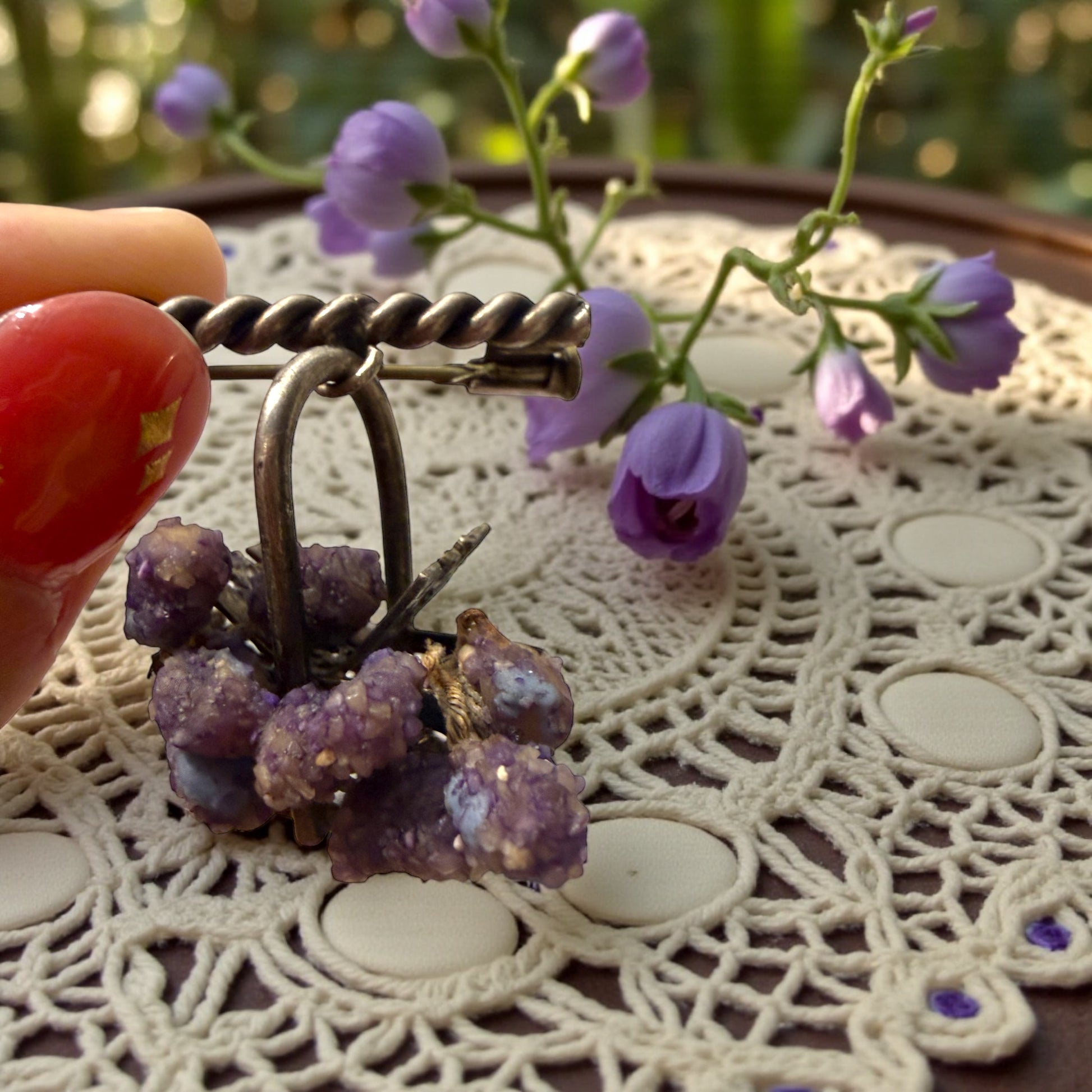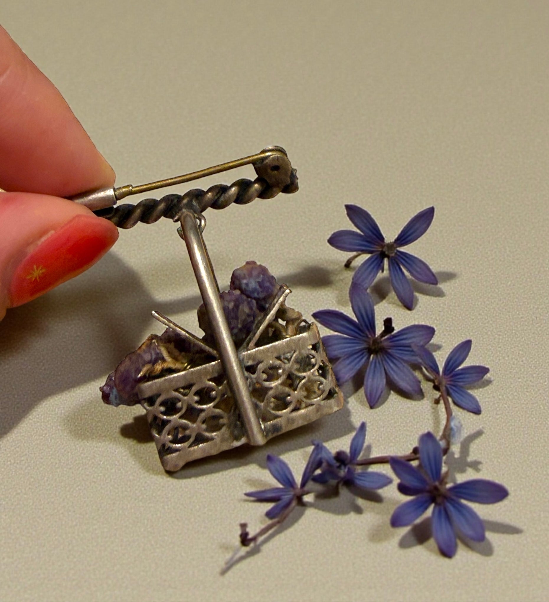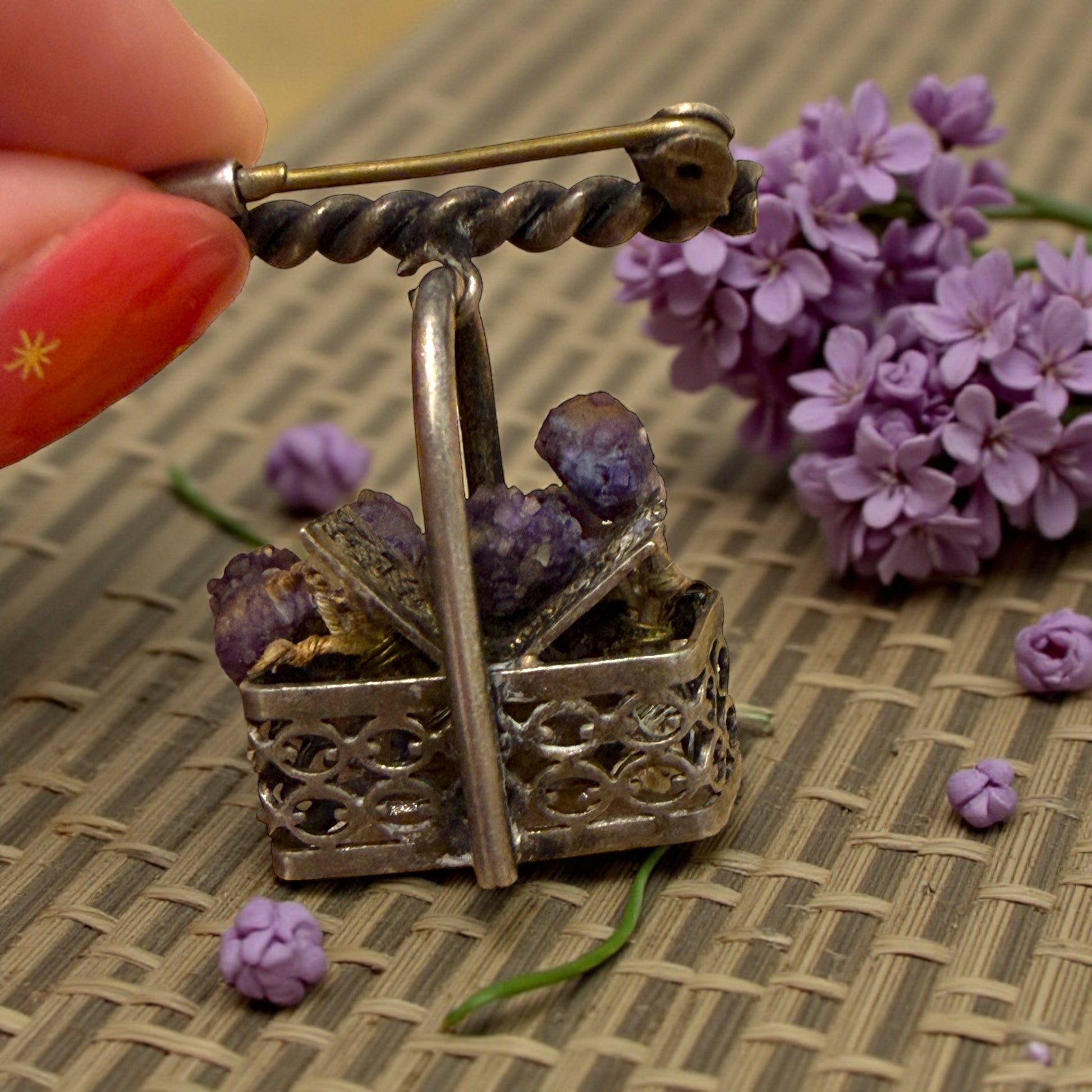 Spilla artigianale āCestino con frutti. Argento e Agata botroidale viola-blu naturale. Peso: 8,5 g. Epoca stimata: 1940ā1960. Stato: Buono, con ossidazione coerente allāetĆ . Chiusura a baionetta funzionante.