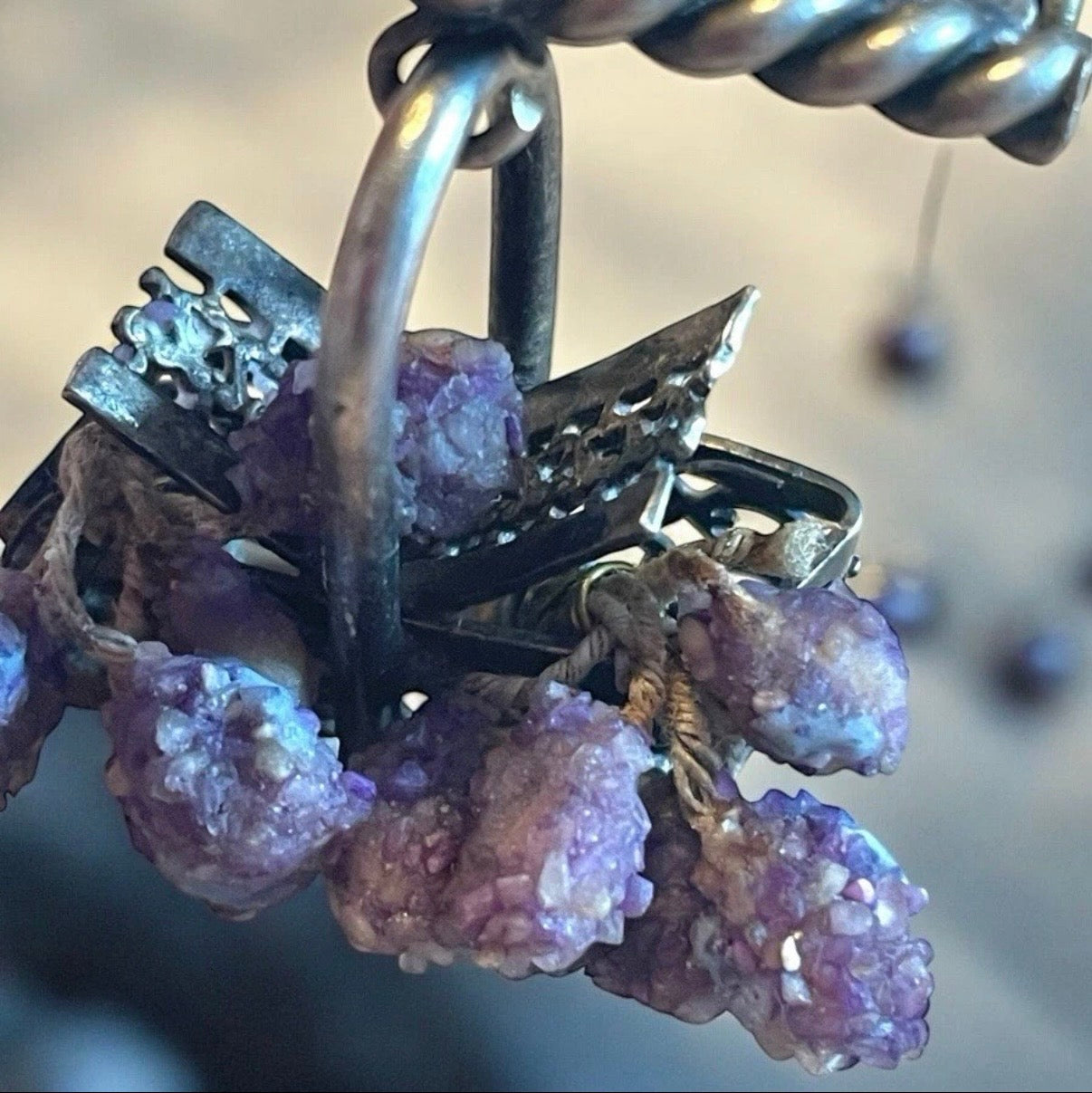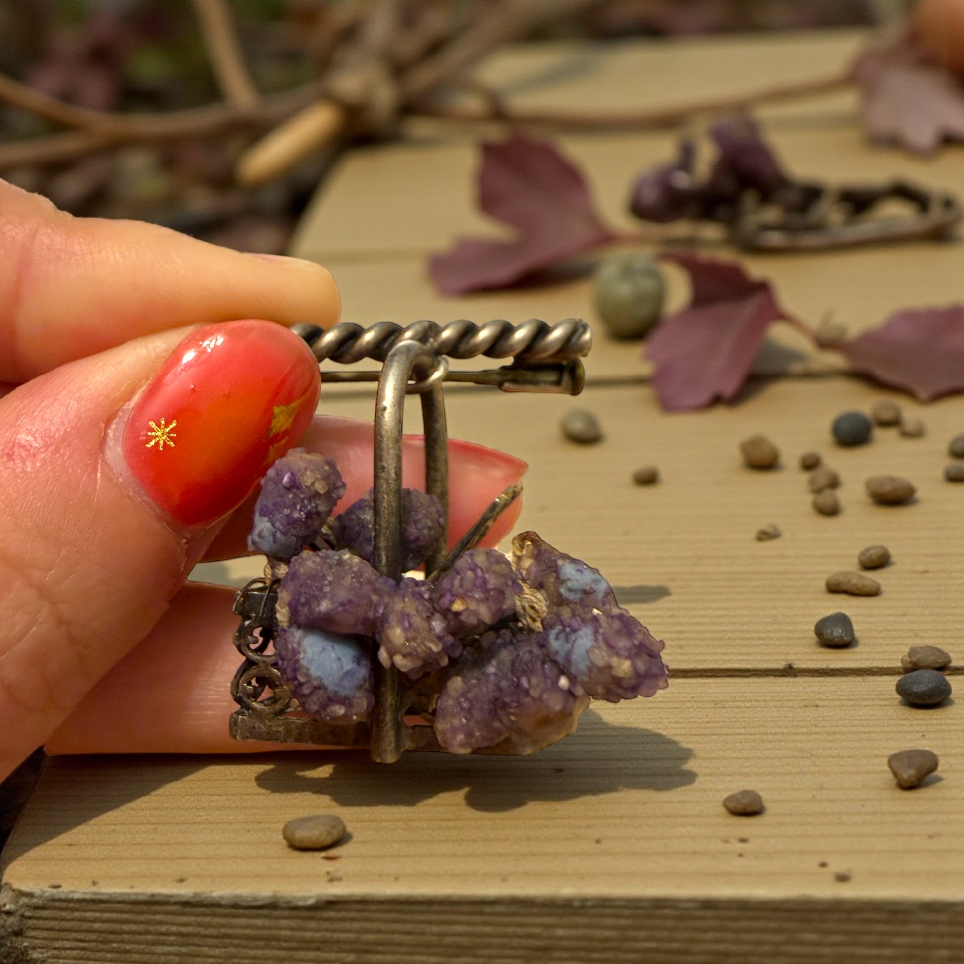 šŖ¶ CāĆØ un piccolo cestino dāargento che sembra trattenere unāeco di quiete antica. La barra torsionata ĆØ una linea forte, si contrappone allāarco sottile che scende a sostenere un traforo che ricorda i merletti delle lavorazioni del Sud. Al suo interno, grappoli viola emergono come frutti dāinverno: agate botroidali, cristalli cresciuti seguendo un ritmo che non appartiene agli esseri umani ma alla pazienza della natura. In questa composizione cāĆØ qualcosa di intimo: la cura delle saldature, le imperfezioni delle pietre, lāargento che si ĆØ scurito con il tempo.