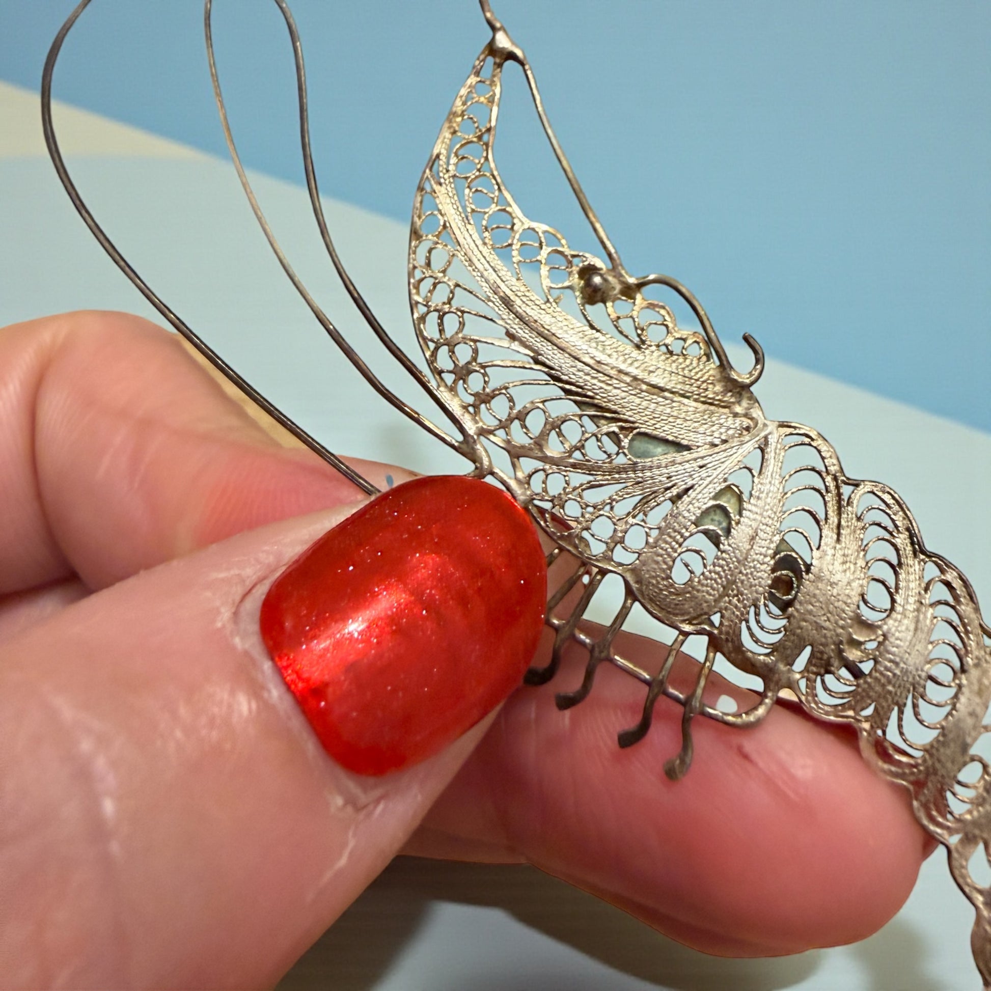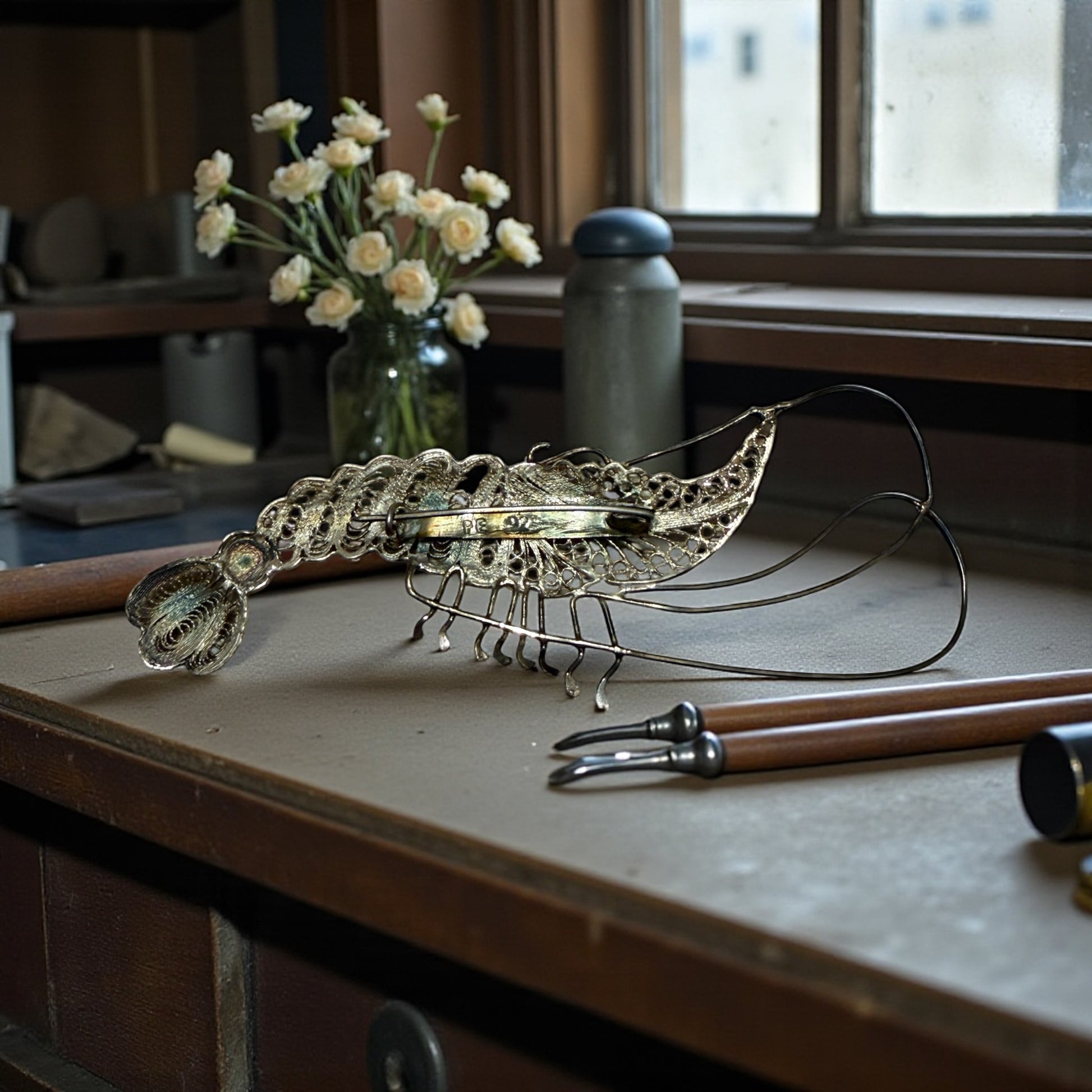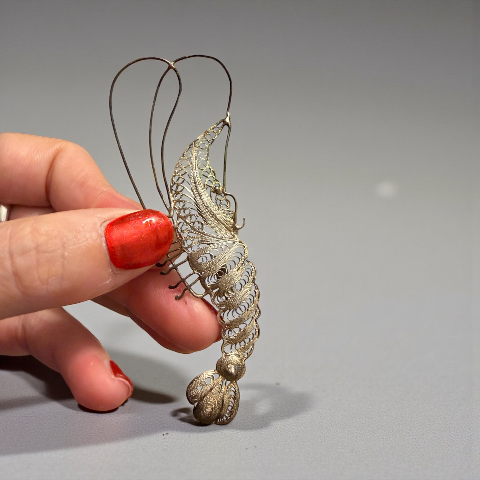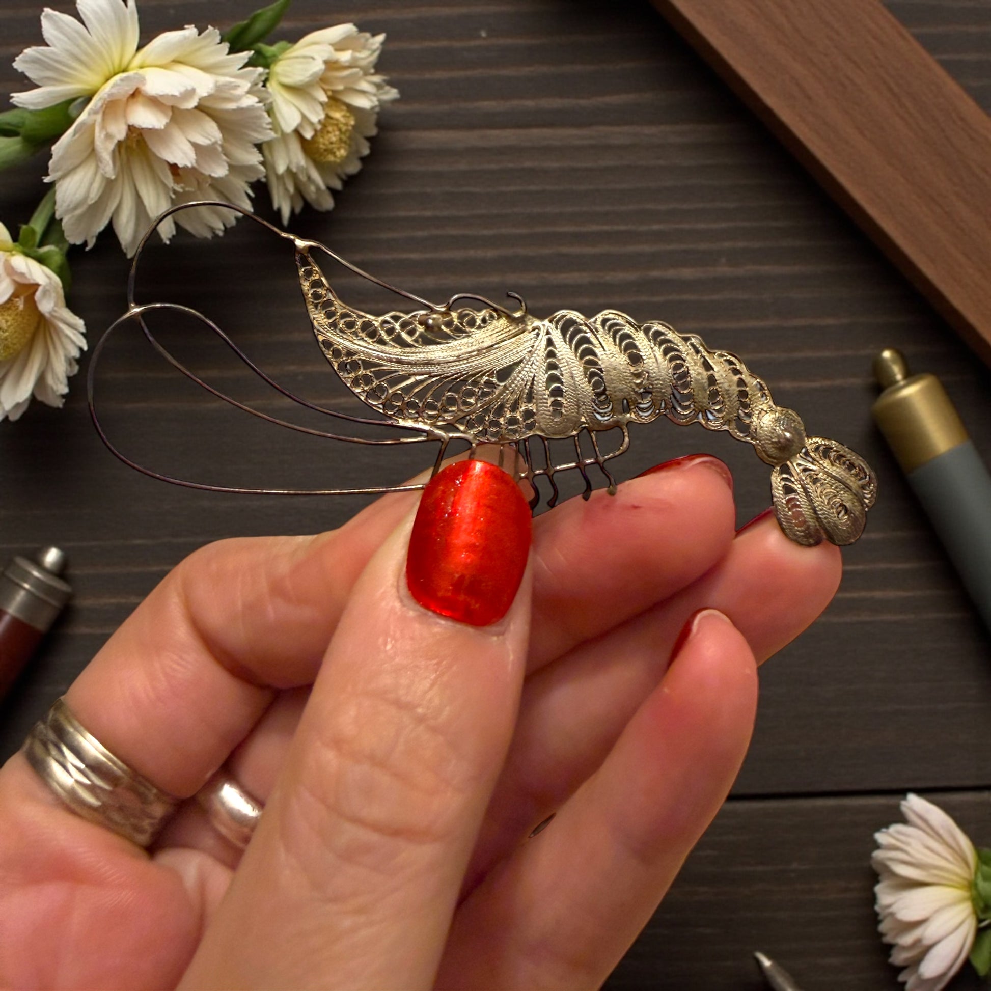 Spesso i gioielli cercano di imitare la natura. Questo, invece, sembra ascoltarla ed incarnarla/ C’è qualcosa di sorprendentemente vivo in questo piccolo gambero d’argento: il modo in cui il corpo si articola, la leggerezza della filigrana, le antenne sottili che disegnano l’aria come se fossero ancora in movimento. È una spilla che non si limita a decorare, ma dialoga con chi la guarda e chi la indossa. È quasi creatura vivente. Realizzata interamente a mano nei primi decenni del Novecento, è il frutto di un sapere paziente, fatto di fili sottilissimi intrecciati uno a uno, senza stampi né scorciatoie. Un gioiello figurativo ironico, elegante, colto — di quelli che oggi non si fanno più. Indossarla significa scegliere qualcosa di diverso: un dettaglio inatteso, capace di raccontare gusto, curiosità e personalità senza bisogno di parole. Ti sei mai accorta di quanto un oggetto così piccolo possa farsi ricordare?