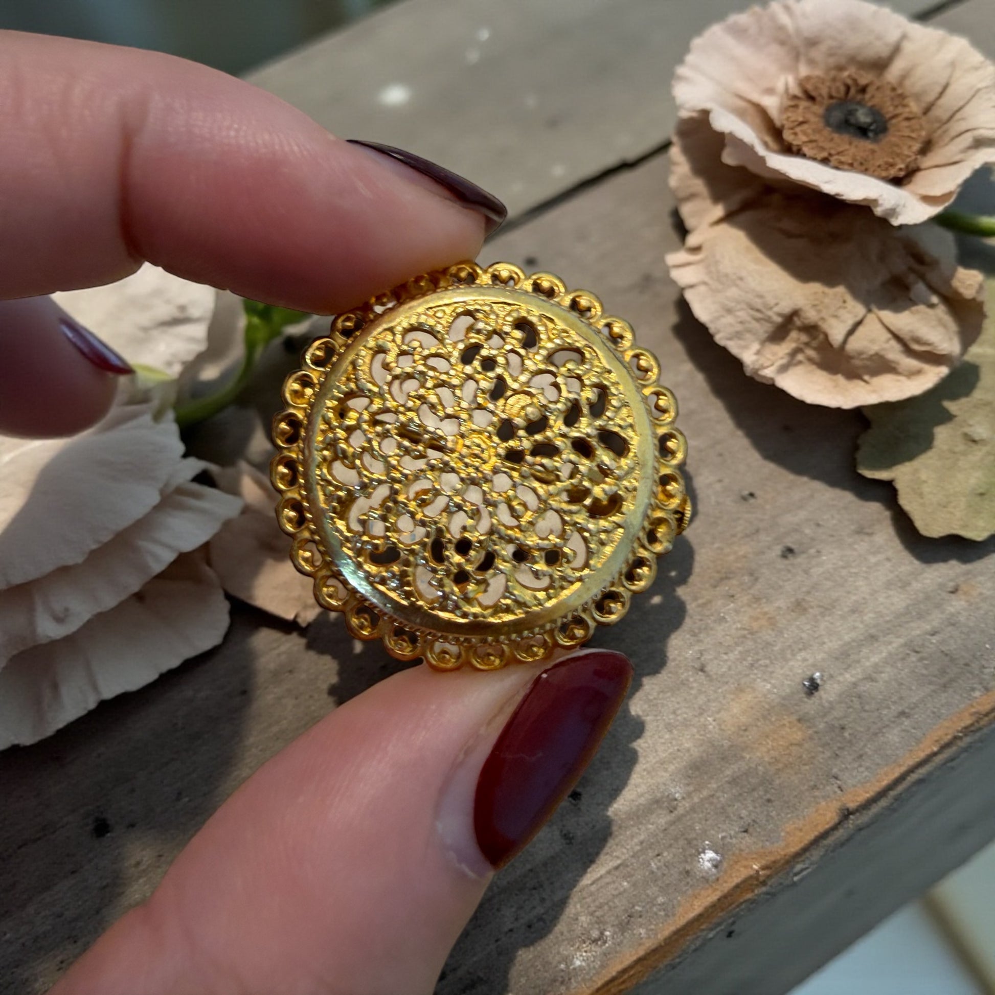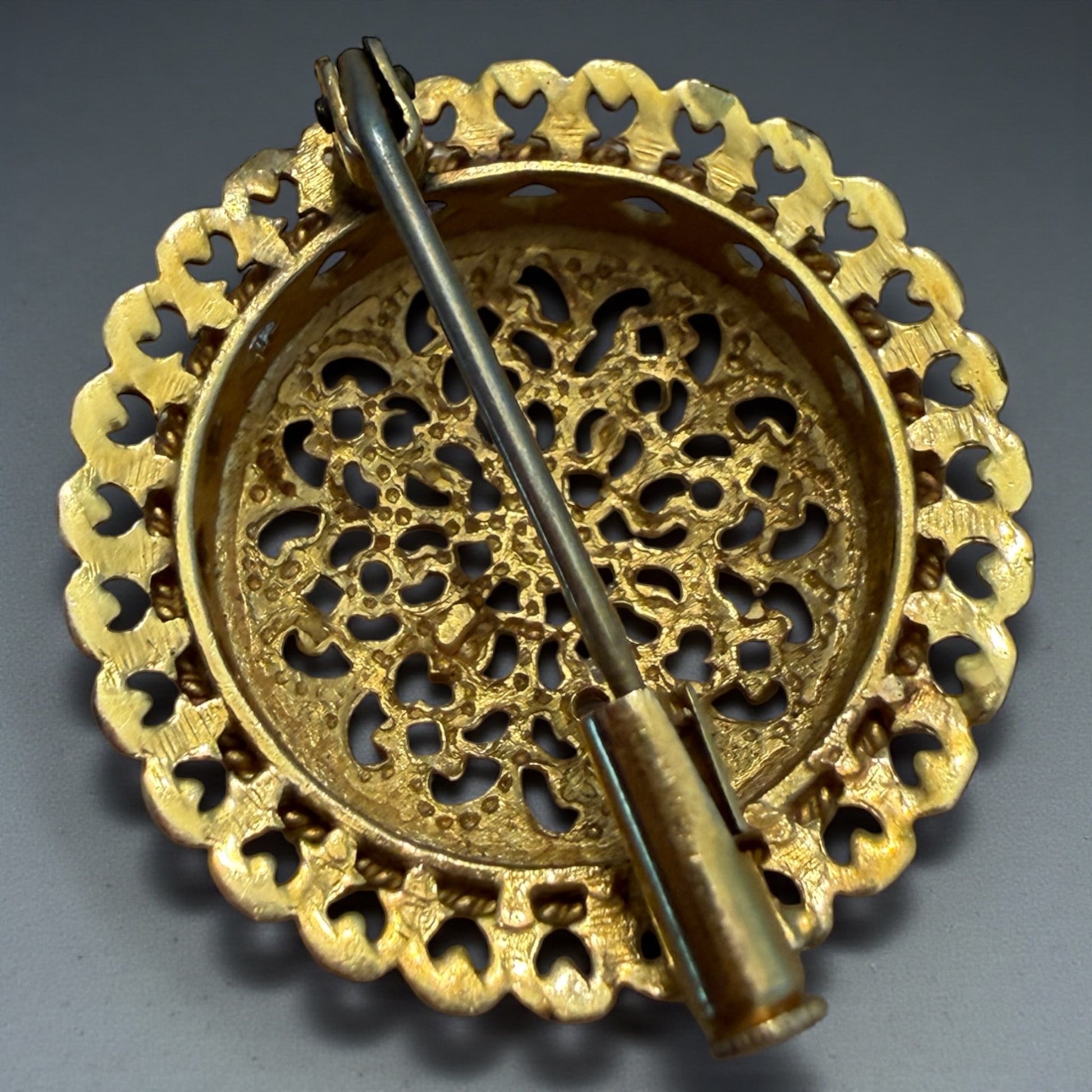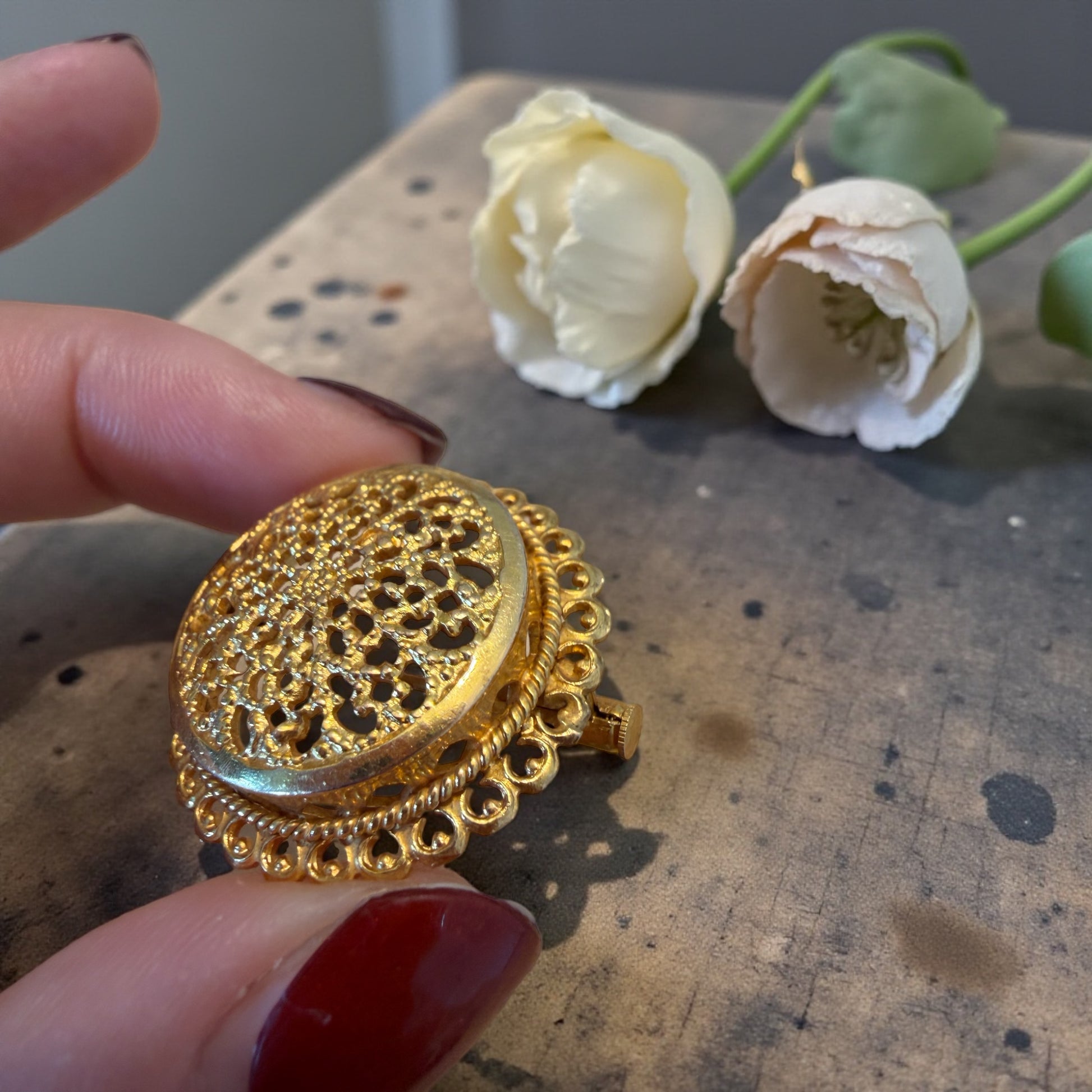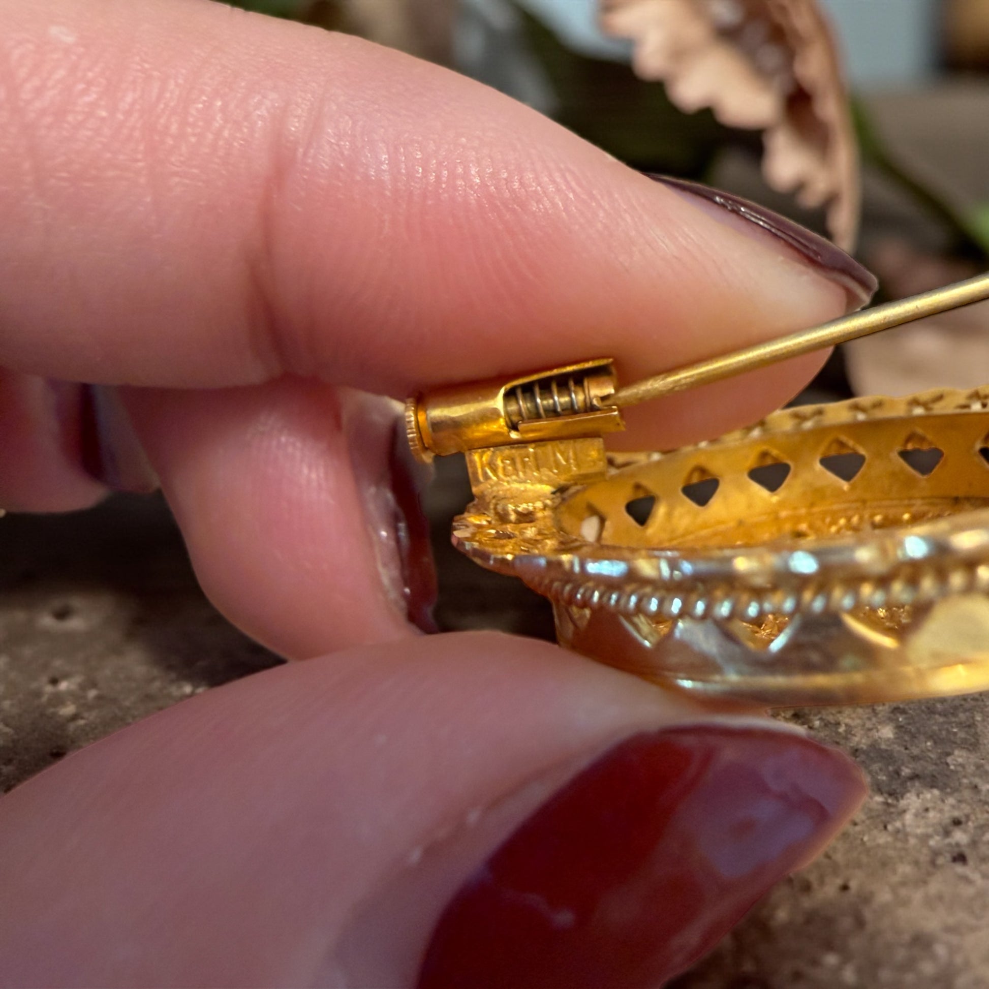Questa spilla tedesca anni ’60 firmata Karl M nasce come accessorio da giacca — e lo fa con classe. Il rosone traforato centrale, fitto come un piccolo merletto in metallo dorato, cattura la luce e la restituisce con eleganza misurata. Intorno, una cornice ritmata da piccoli motivi a cuore crea una silhouette romantica ma solida. La placcatura oro dona calore senza eccessi. La chiusura a trombone è originale e perfettamente funzionante — dettaglio tipico della produzione mitteleuropea del periodo. Ma c’è un dettaglio che la rende ancora più interessante.