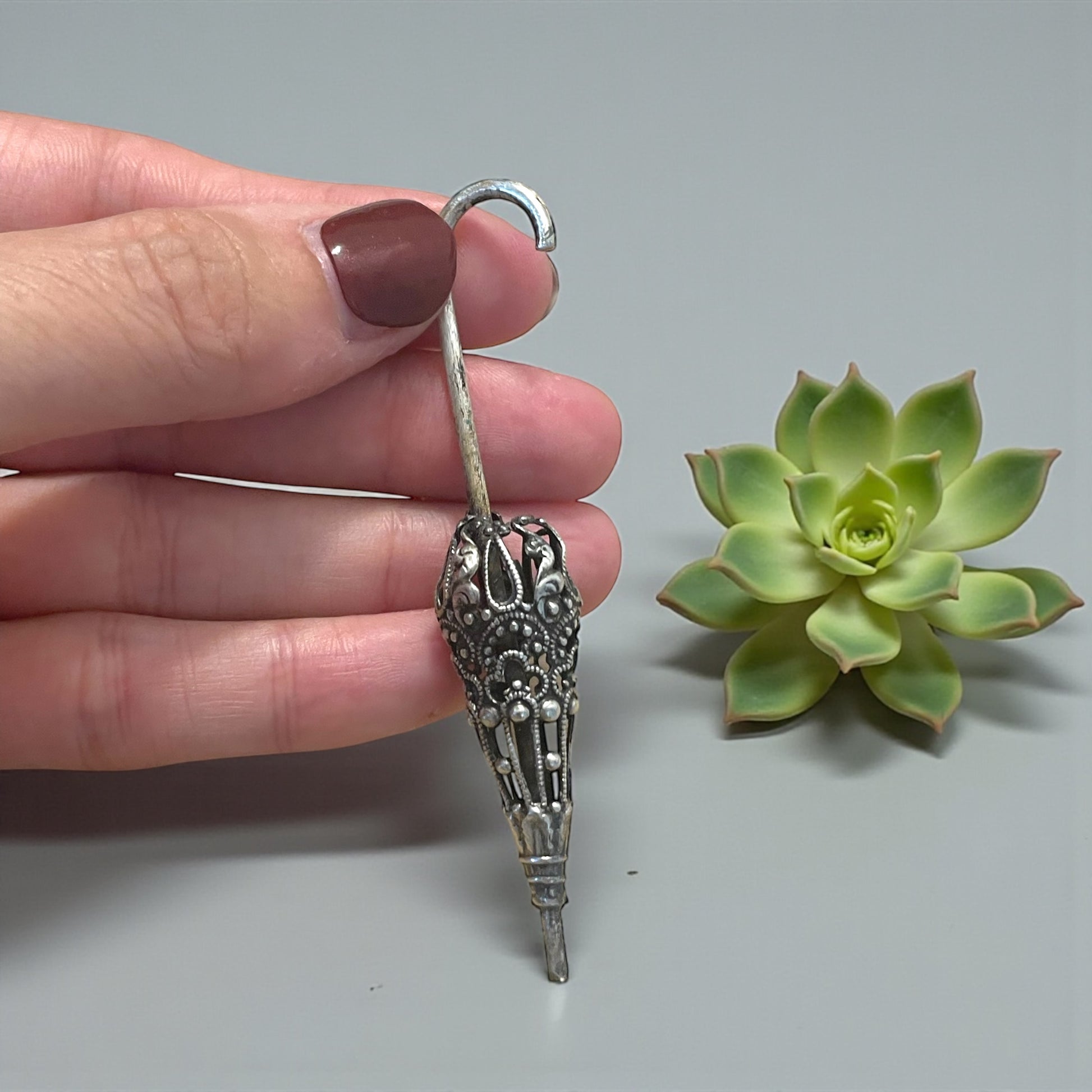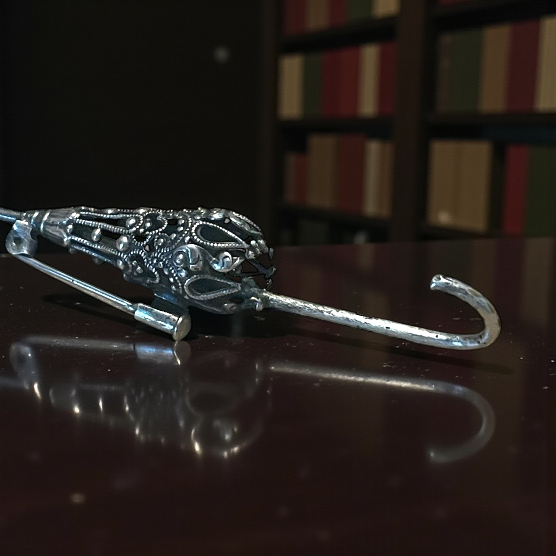 Questa deliziosa spilla in argento a forma di ombrellino chiuso misura appena 7,5 cm di lunghezza, ma racchiude in sé tutta la grazia di un’epoca. Realizzata in argento traforato e cesellato, lavorato a filigrana e granulazione, presenta un’infinità di minuscoli rilievi e archi floreali che sembrano ricamati sul metallo. La chiusura a baionetta è perfettamente funzionante, segno di un’ottima conservazione, e testimonia una produzione di inizio Novecento, quando questa tipologia di fermaglio cominciava a diffondersi nei laboratori orafi italiani. Non reca punzoni, ma è stata testata con reagente risultando in argento autentico; l’unica parte non in argento è l’ago, in metallo più duro, come spesso accadeva per garantire resistenza all’uso. Sottile, elegante, luminosa: un piccolo omaggio alla femminilità liberty, quando un ombrellino chiuso evocava la donna capace di svelarsi solo… poco a poco.