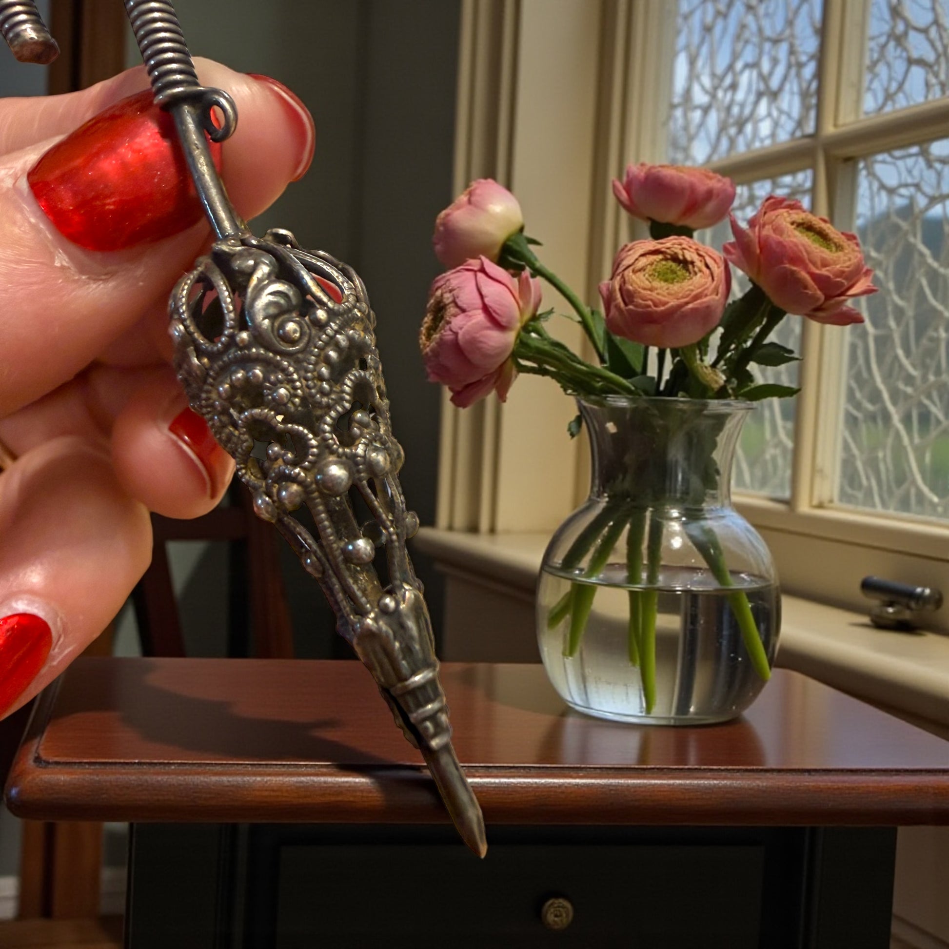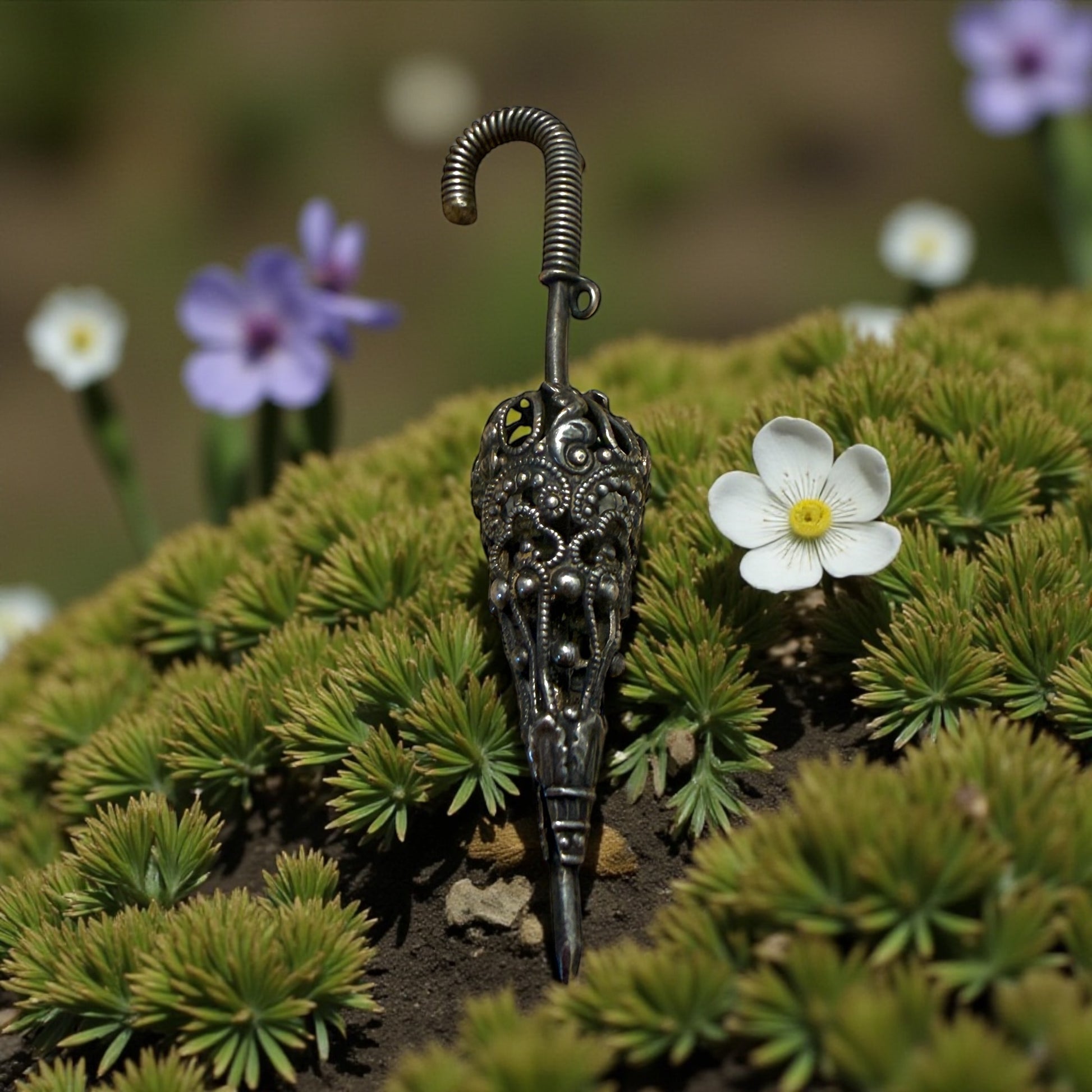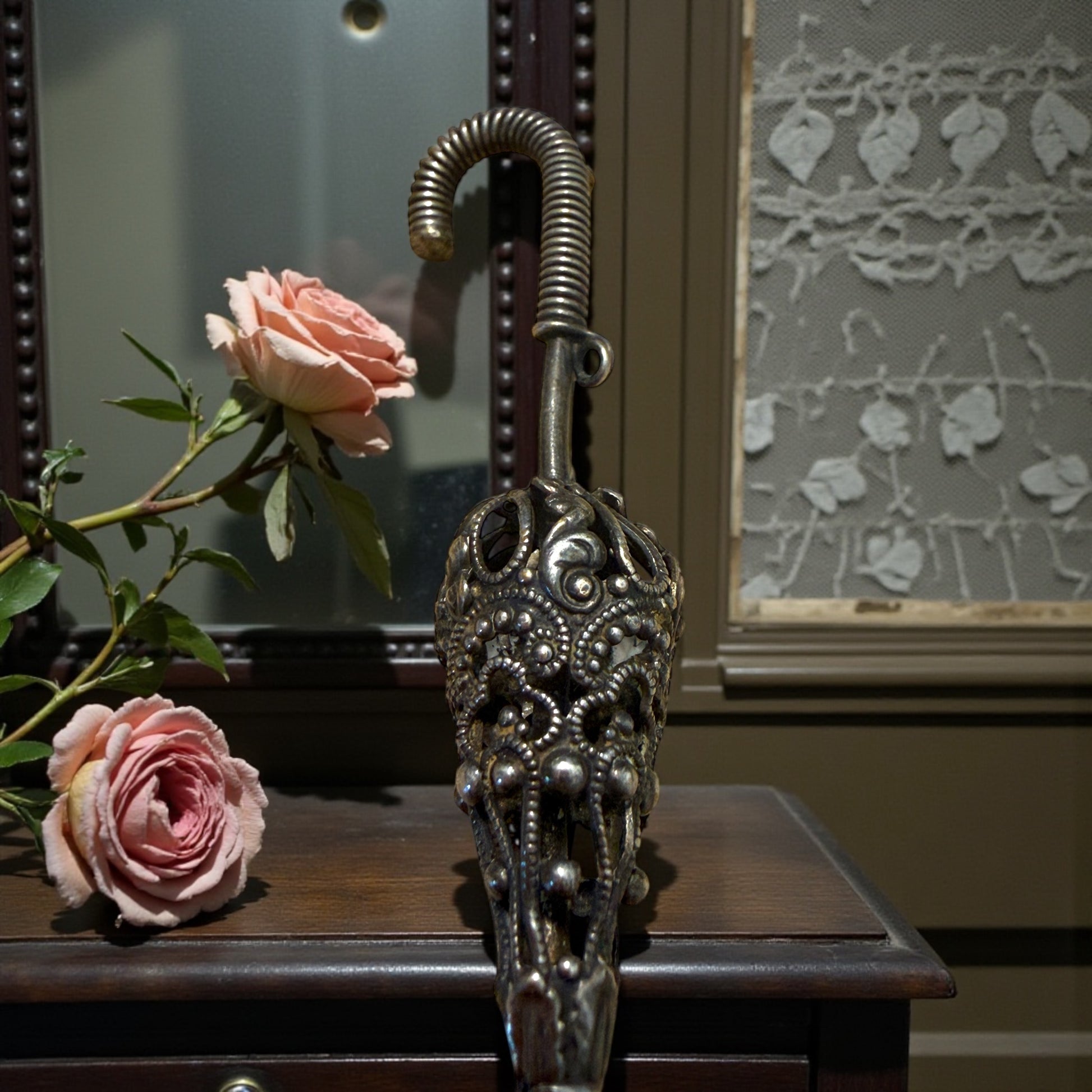 Non è una spilla qualunque: è un piccolo gesto teatrale da appuntare o lasciare scendere sul petto, leggermente inclinato, come se stesse seguendo il movimento di chi lo indossa. L’ombrellino in argento si apre in una trama fittissima di filigrana, un lavoro paziente e raffinato che cattura lo sguardo e invita ad avvicinarsi. Ogni dettaglio sembra pensato per essere scoperto poco alla volta, come accade con gli oggetti che non amano essere frettolosamente guardati. Indossata come spilla racconta eleganza e ironia; come pendente, grazie all’anellino superiore, crea un effetto obliquo sorprendente, quasi un movimento sospeso. Un gioiello memorabile che rappresenta un accessorio da sempre elegante e fascinoso nell’immaginario della donna tra fine ‘800 e primo ‘900.
