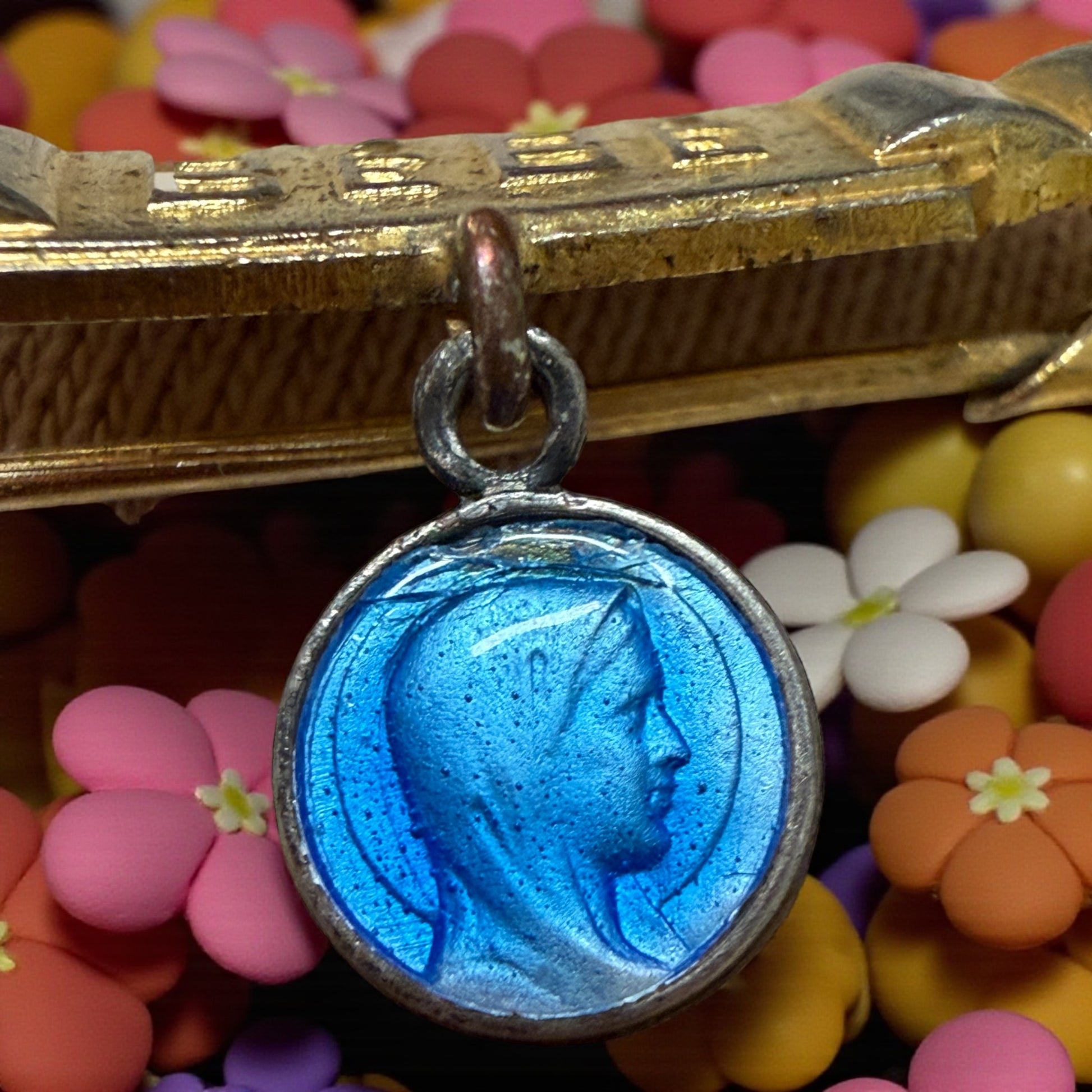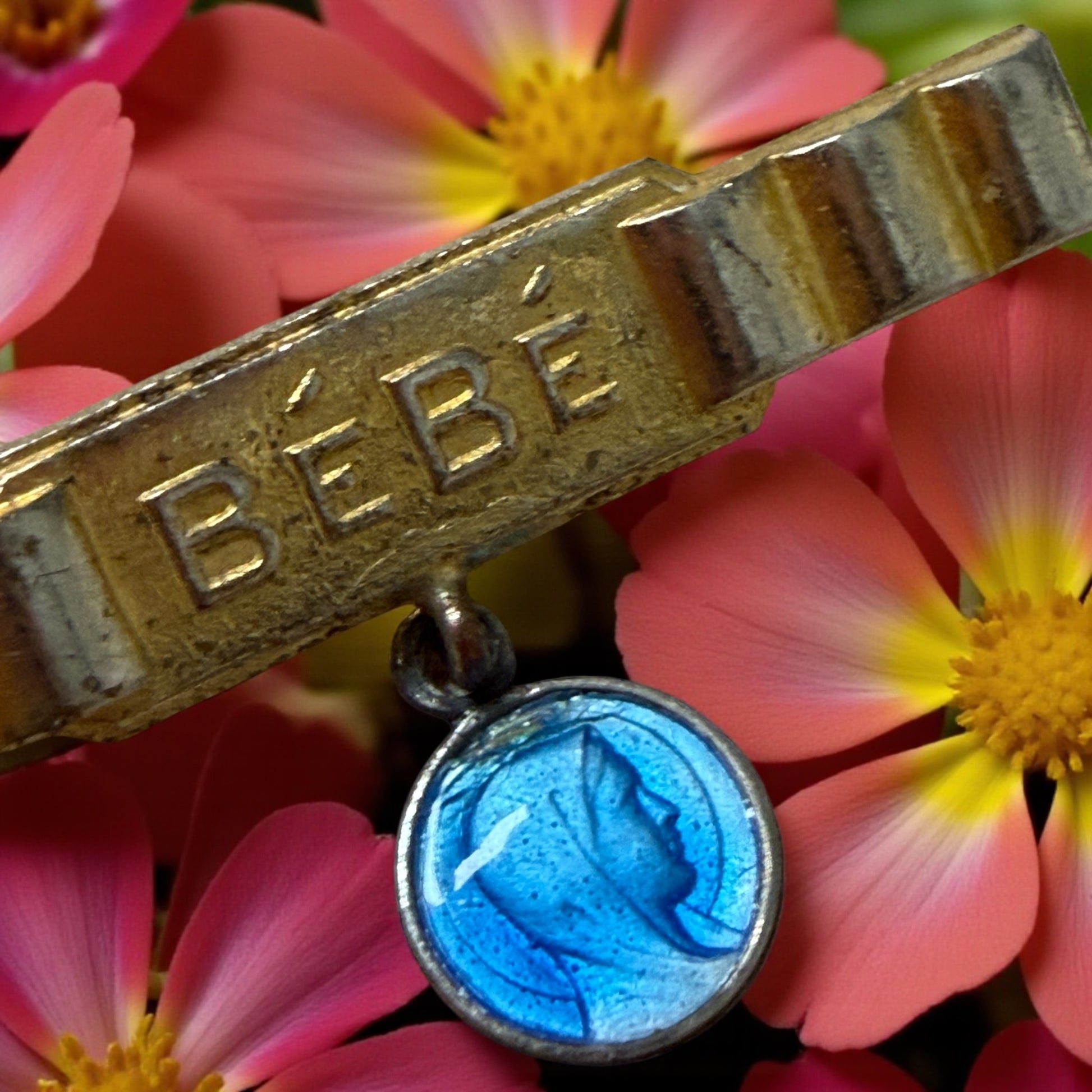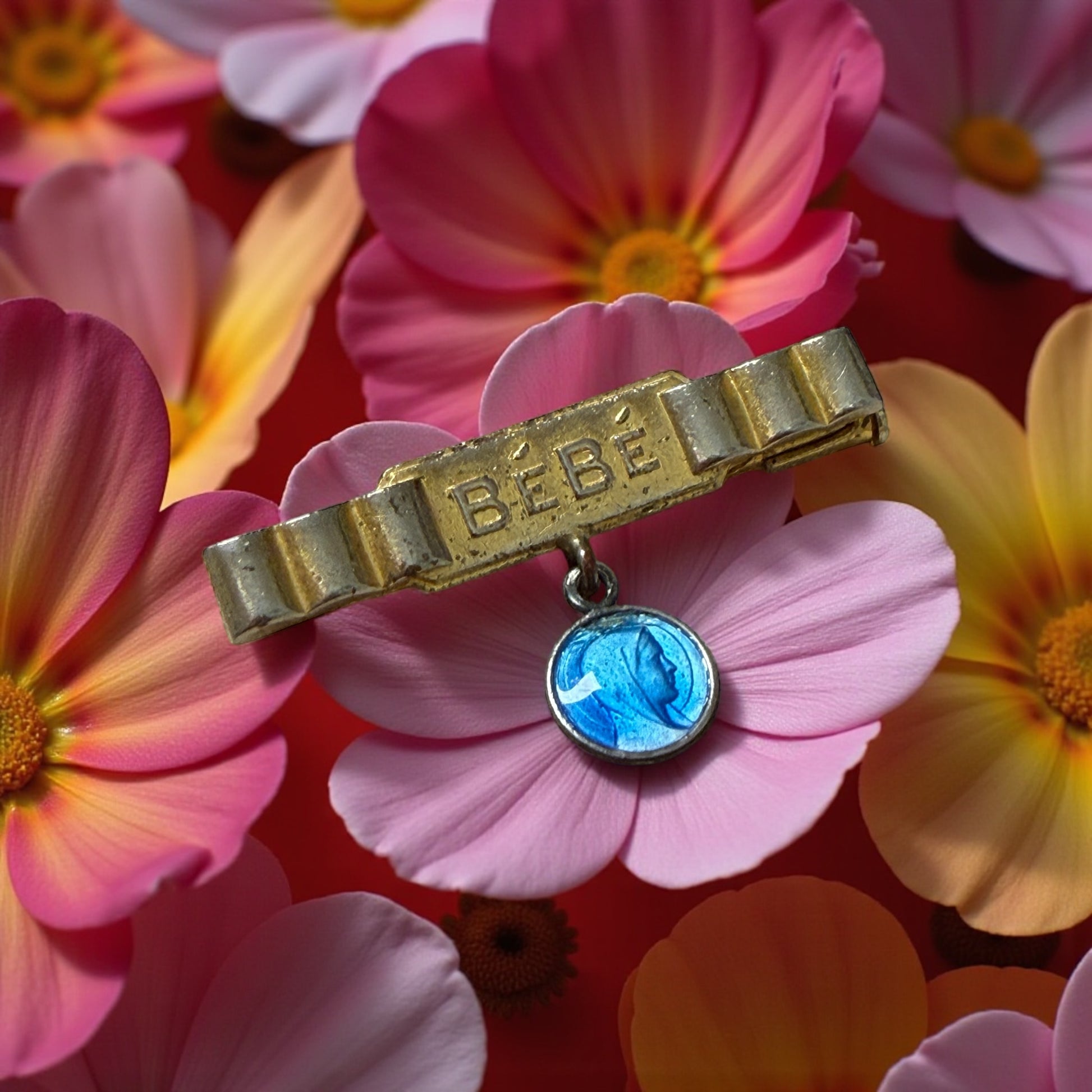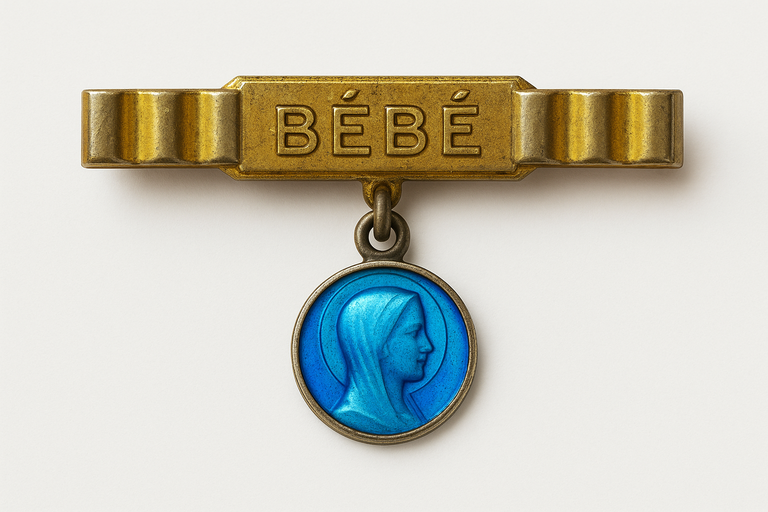 Ogni creatura nasce due volte: quando viene al mondo e quando qualcuno la affida alla protezione di un gesto d’amore. Questa piccola spilla francese degli anni ’30–’40 appartiene a quel mondo di riti domestici, semplici e potentissimi, in cui una madrina, una nonna o una giovane madre appuntavano sul corredino del neonato un segno di buon auspicio. La barretta in metallo dorato porta la scritta BÉBÉ incisa in caratteri netti e moderni, custodita tra due eleganti motivi geometrici “a gradoni”: una firma autentica dello stile Art Déco francese, che negli anni tra le due guerre univa rigore, simmetria e la nuova estetica della modernità. È una linea precisa e armonica, capace di catturare la luce in modo sorprendente per un oggetto popolare. Sotto la barretta, sospesa da un piccolo anello ossidato dal tempo, brilla una medaglietta smaltata in azzurro cattedrale, realizzata con la tecnica dello smalto a fuoco su metallo inciso. È una tecnica ormai quasi scomparsa: richiedeva mani esperte, più passaggi di forno, colori traslucidi e un sottile strato finale detto fondant che, una volta fuso, creava quella lucentezza vetrosa che oggi riconosciamo subito come artigianato d’epoca. Dentro l’azzurro profondo emerge il profilo della Vergine, disegnato con quella linea essenziale tipica dell’Art Déco sacro: puro, protettivo, infinitamente delicato. Era un’immagine pensata proprio per accompagnare i primi giorni di vita di un bambino, per vegliare su di lui. Non è un oggetto prezioso nei materiali: lo è nella mano che l’ha creato, nel simbolo che porta, nella tradizione che rappresenta.
