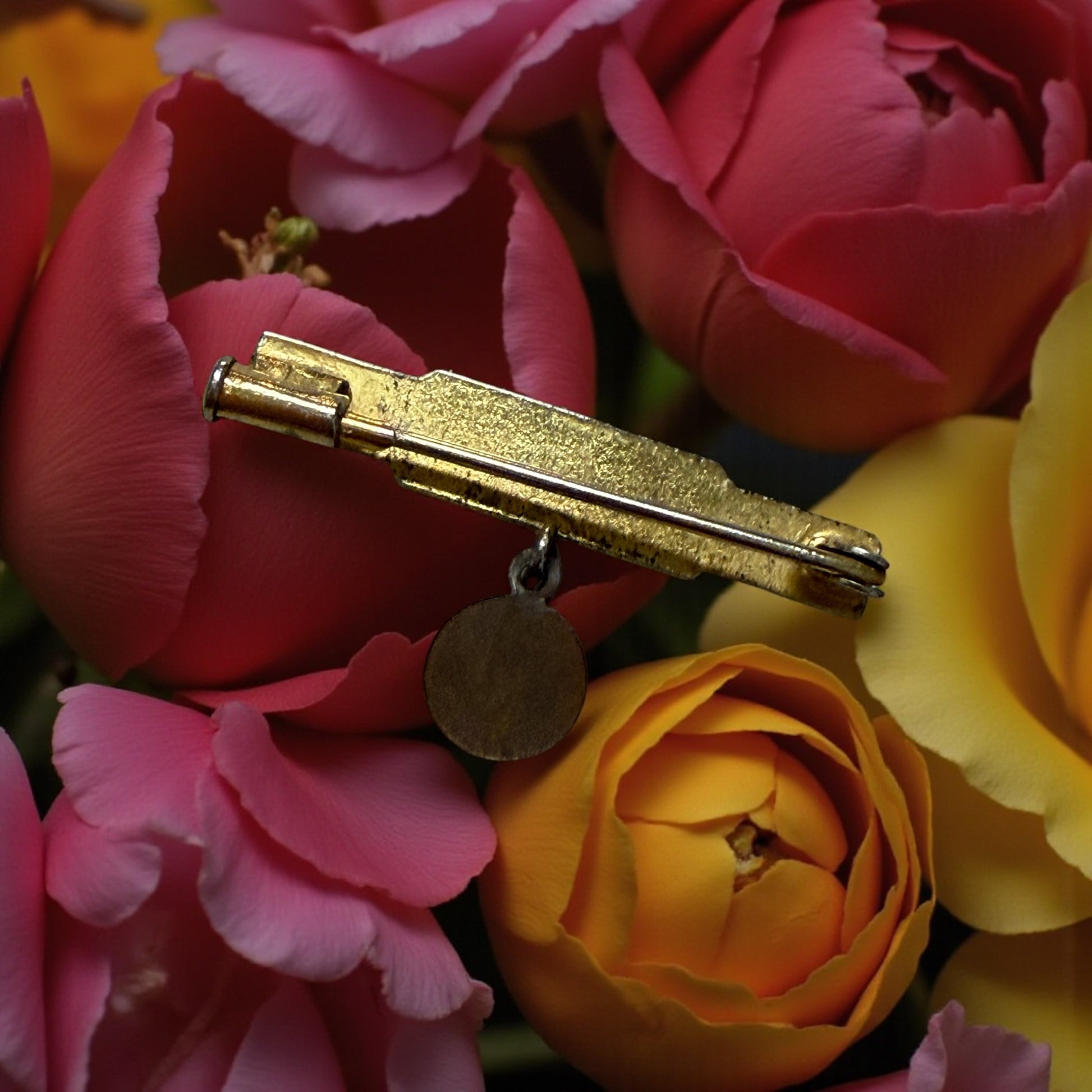 Lunghezza 3,5 cm. Doratura sbiadita sui gradoni. Chiusura a baionetta funzionante d’epoca.