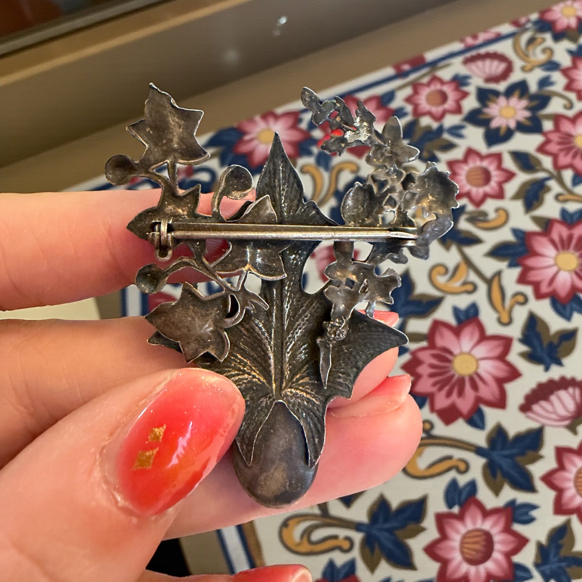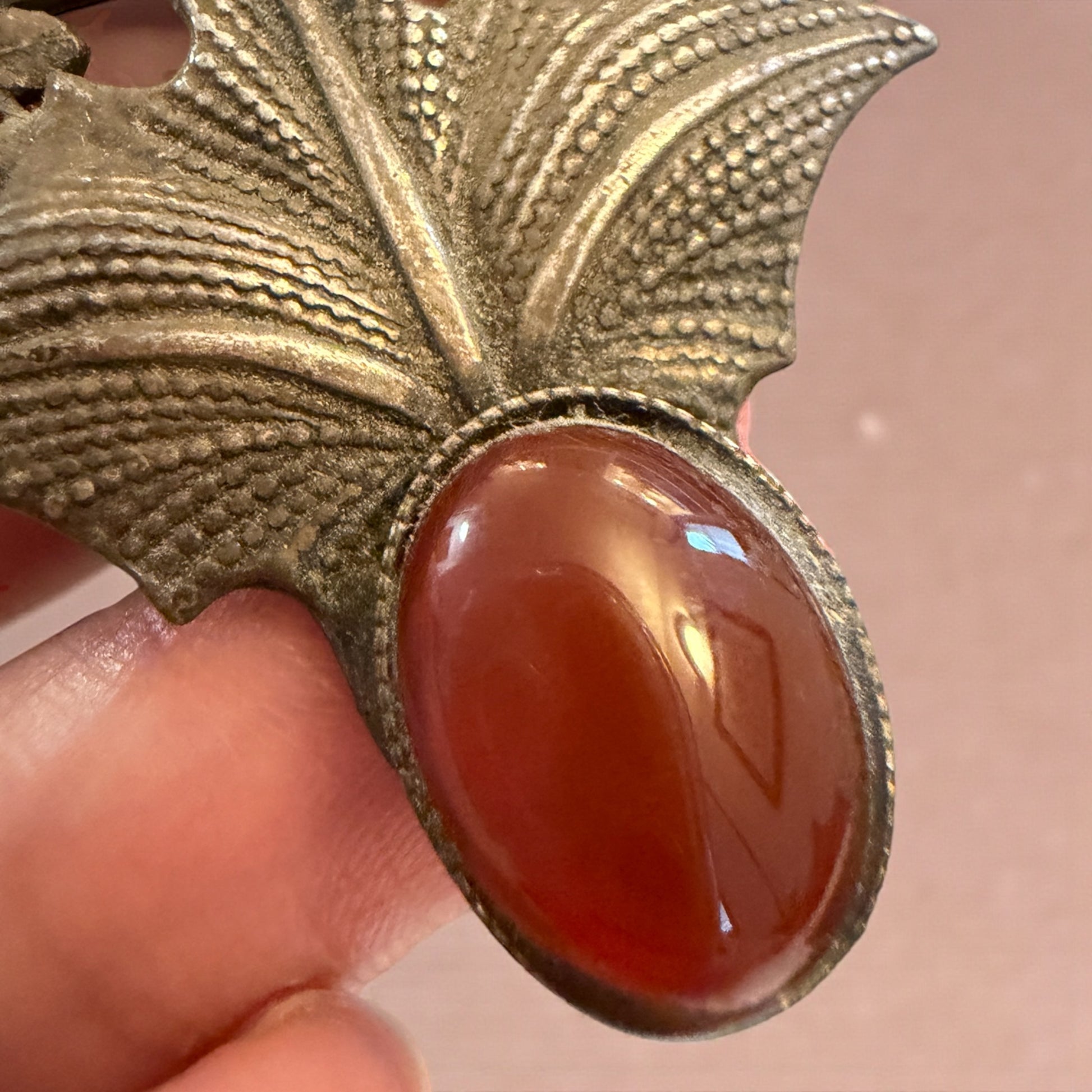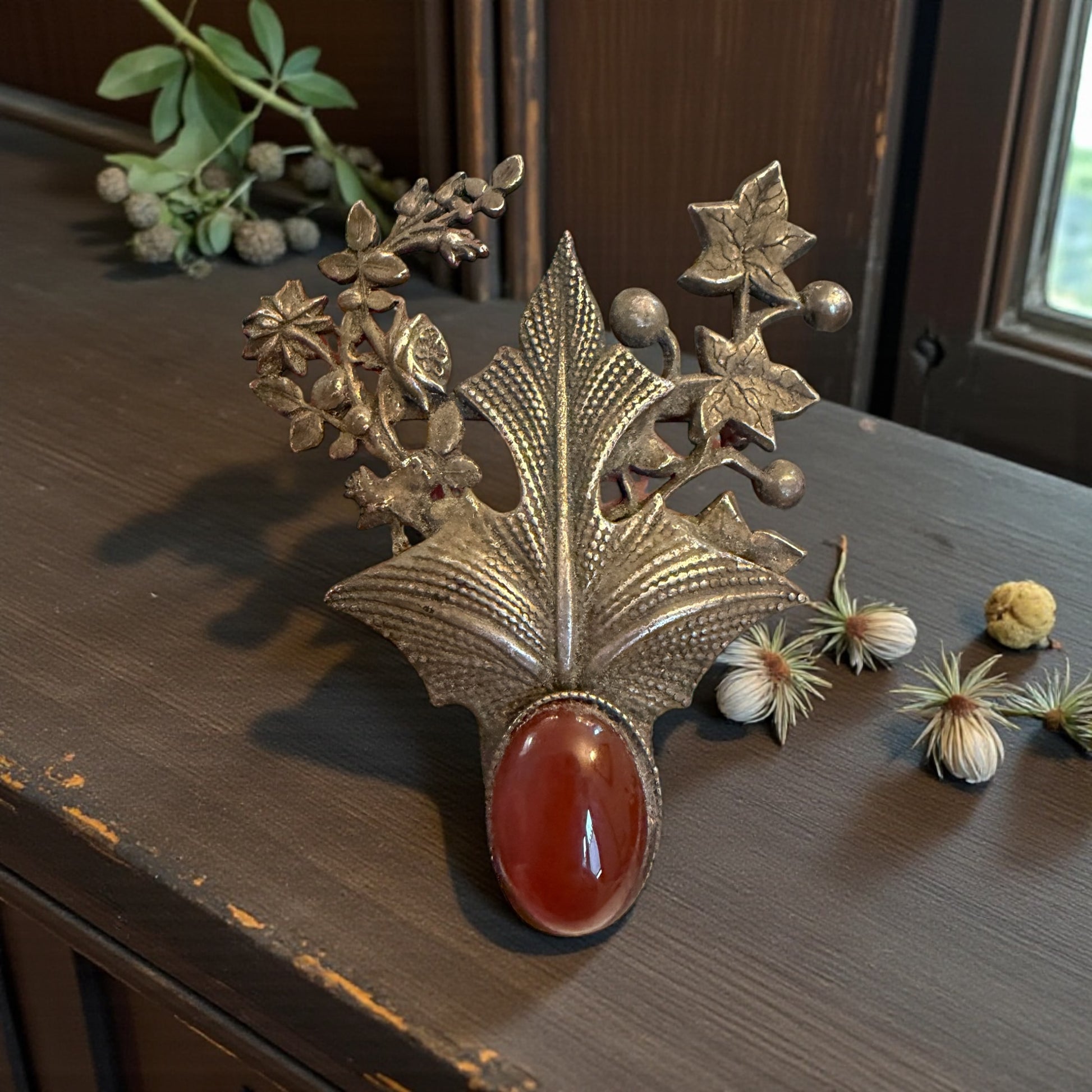Ti accorgi subito che questa spilla non è nata per stare ferma. È un intreccio vegetale che si muove, che cresce, che avanza con determinazione, come fanno le piante resistenti di montagna. Le foglie d’edera si arrampicano attorno a una cornalina calda, luminosa, quasi pulsante, come se fosse il cuore stesso dell’oggetto. Nata in area alpina francese negli anni Venti, porta con sé una bellezza silenziosa ma disarmante, irresistibile, fatta per durare. L’argento, lasciato parlare senza lucidature aggressive, conserva una patina vissuta, autentica, che racconta il tempo senza nostalgia. È una spilla pensata per accompagnare un gesto, un cappotto, una presenza. Ci parla di calore, memoria, resilienza.