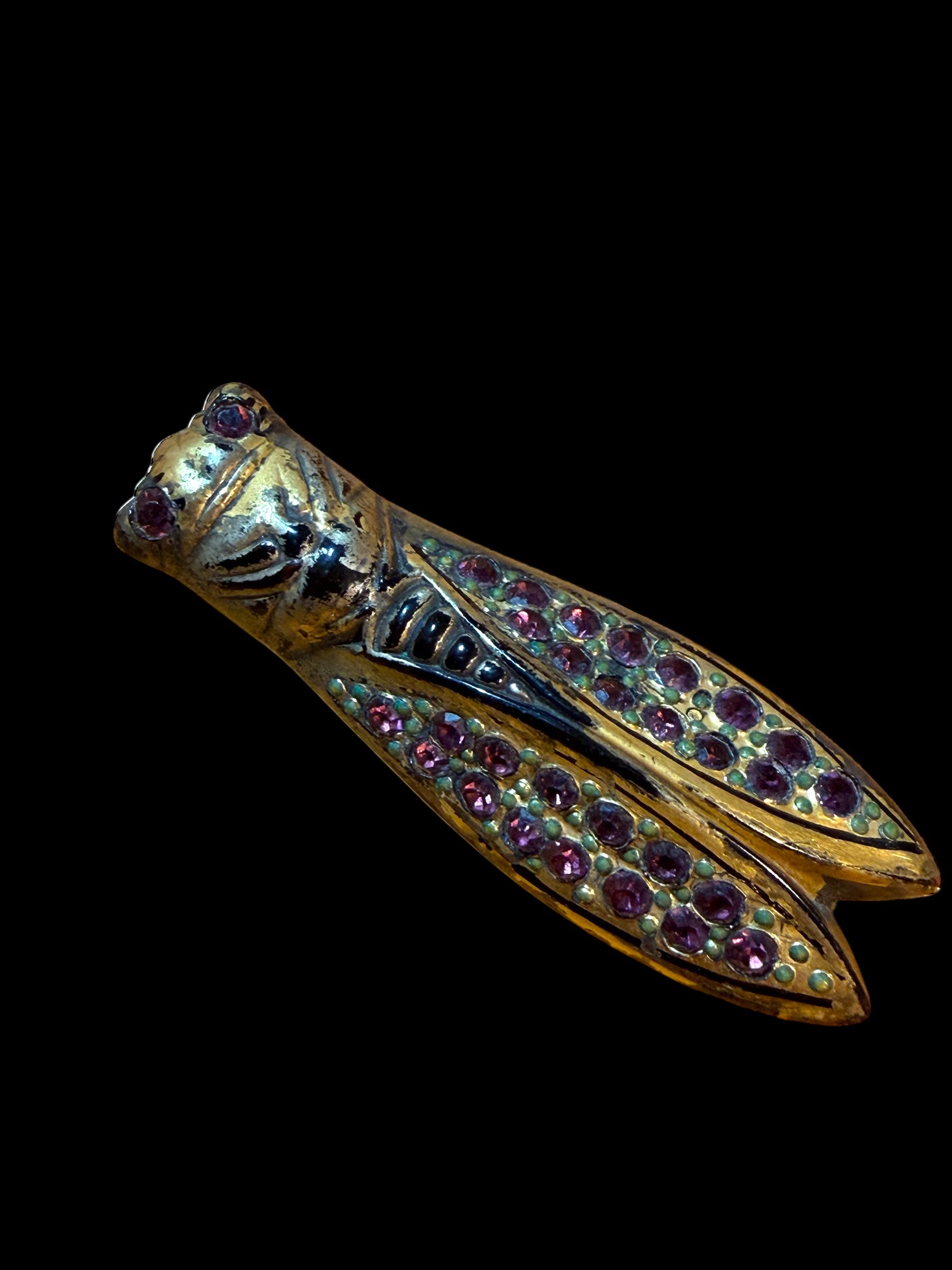 Splendida spilla Liberty a guisa di cicala temepestata di pates de verre color ametista