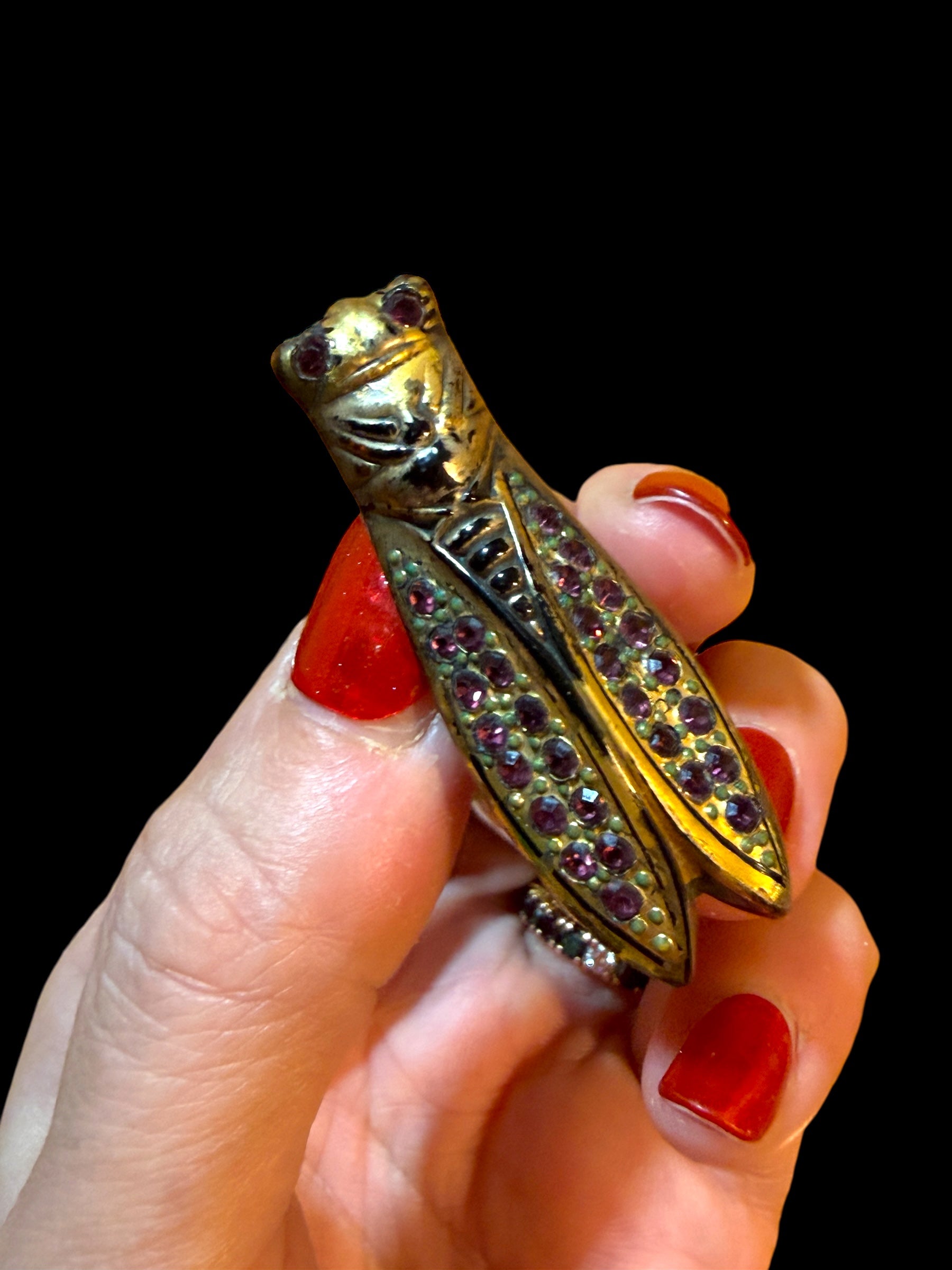 Ci sono oggetti che non chiedono attenzione. Aspettano e poi ci trovano…. E guardate che splendore! Questa cicala sembra proprio così: silenziosa, dorata dal tempo, con le ali ancora cariche di luce violacea. Nata nei primi anni del Novecento, quando la natura era un linguaggio e non un ornamento, porta addosso l’estetica Liberty più autentica: insetti, cicli, metamorfosi. La cicala è simbolo di attesa, rinascita e tempo interiore. Vive nascosta per anni, poi emerge, canta, e scompare di nuovo. Non ha fretta. Conosce il momento giusto. Le sue ali sono punteggiate da pietre color ametista, ancora tutte presenti, come piccoli frammenti di voce. La doratura a tratti consumata non è una mancanza: è la prova che questa spilla ha attraversato mani, abiti, stagioni. Sul retro, una chiusura a trombone con scritta déposé — racconta un’epoca in cui la bigiotteria era pensata per durare, era gioiello a tutti gli effetti. Non è un gioiello da vetrina…. Sarebbe persino da catalogo! È un talismano per chi sa aspettare il proprio canto.