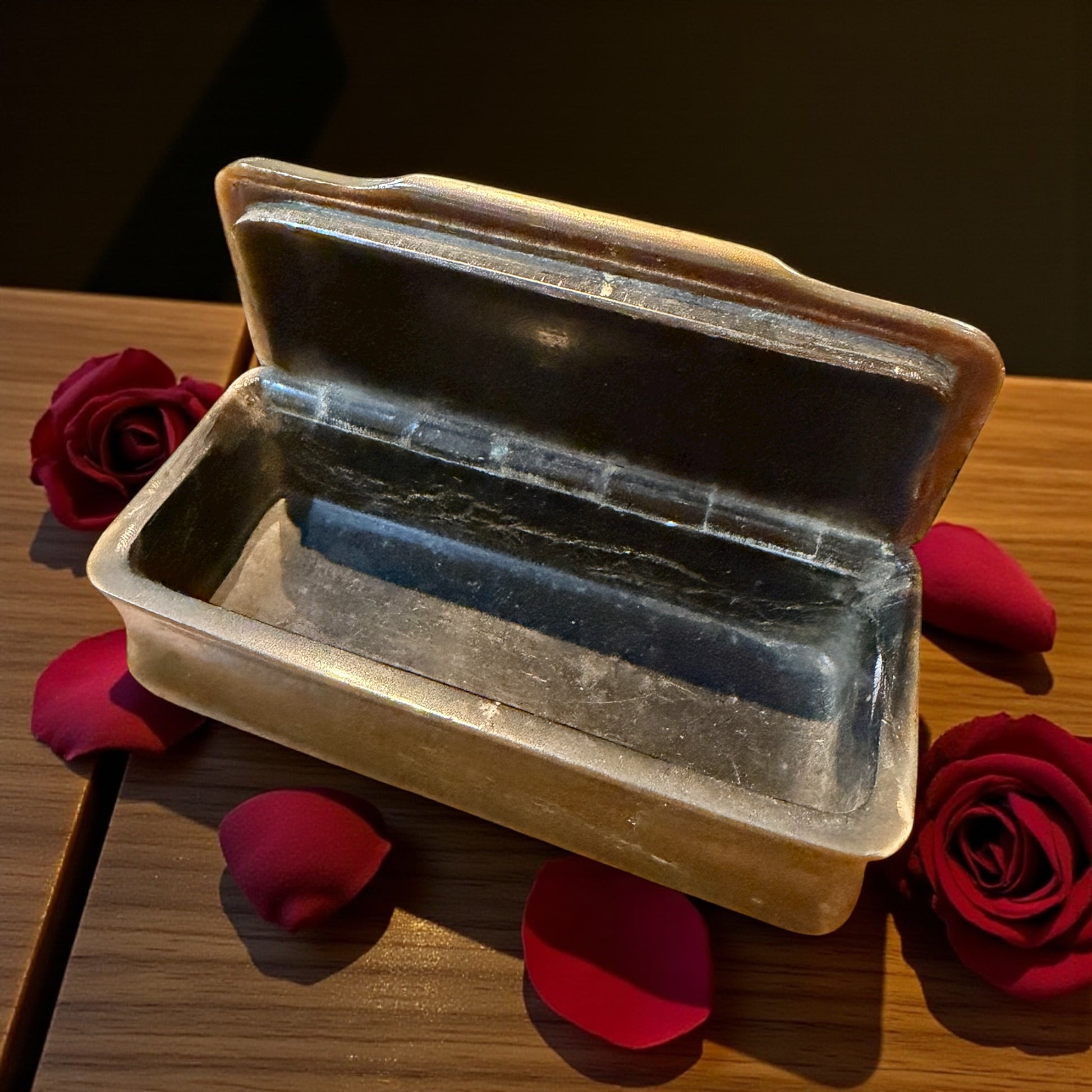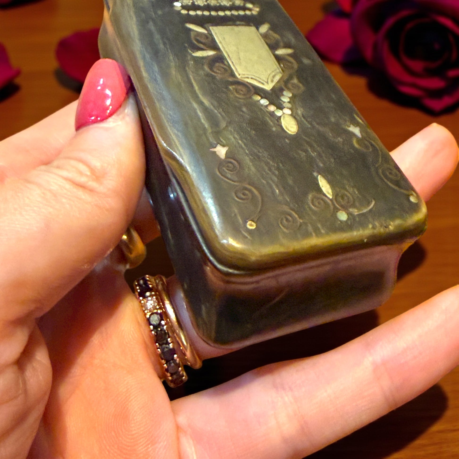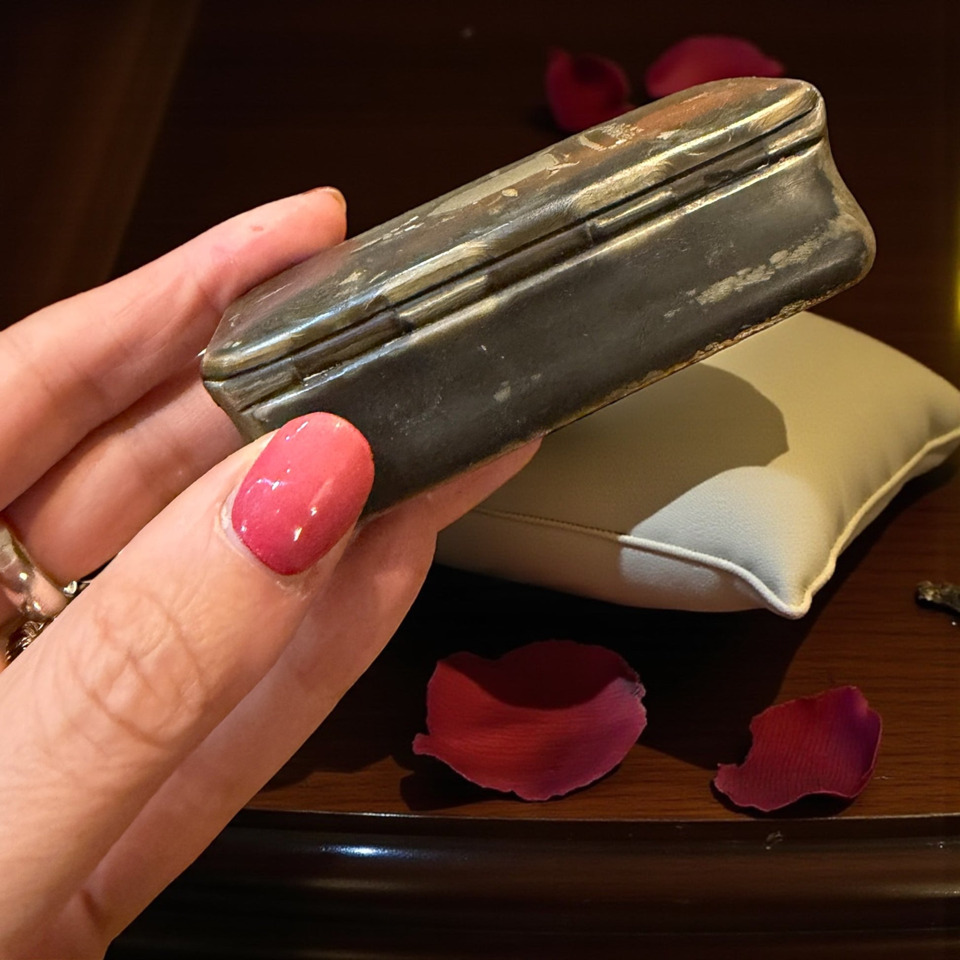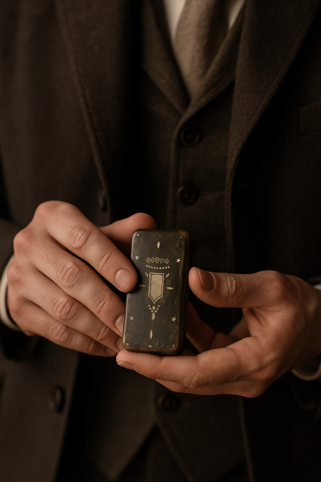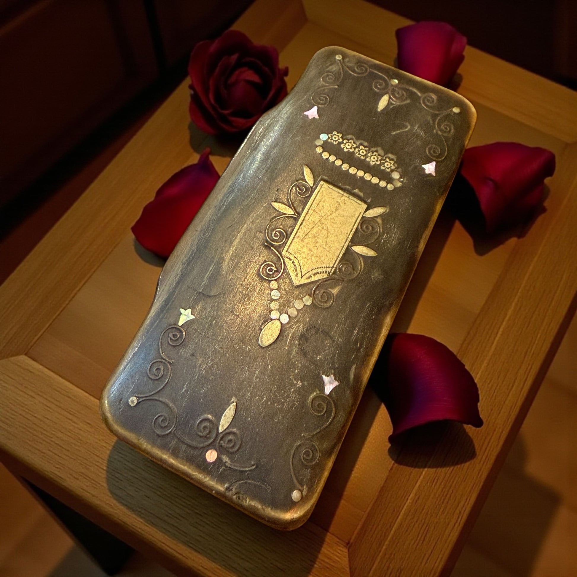 A volte gli oggetti sembrano respirare ancora. Questa piccola tabacchiera in corno, liscia e pesante come una pietra calda, porta con sé il segreto di mani antiche che la scolpirono a lume di candela. Sul coperchio, una corona di madreperla brilla come una promessa, mentre i fili d’argento disegnano arabeschi intorno a uno stemma ormai muto: forse l’emblema di un gentiluomo, o di una donna che amava il profumo del tabacco fine? Oggi può accogliere le tue iniziali incise o quelle di chi ami. Se la si osserva da vicino, sembra quasi di percepire il sussurro del tempo, il tintinnio di un portasigari, il fruscio di un abito in velluto. È un frammento di vita sospeso, una custode silenziosa di gesti dimenticati. Ed ha decoro così fini che non si può che definirla gioiello. Oggi, posata su una scrivania o in una vetrina, restituisce un’eleganza antica e una luce che non si spegne mai.