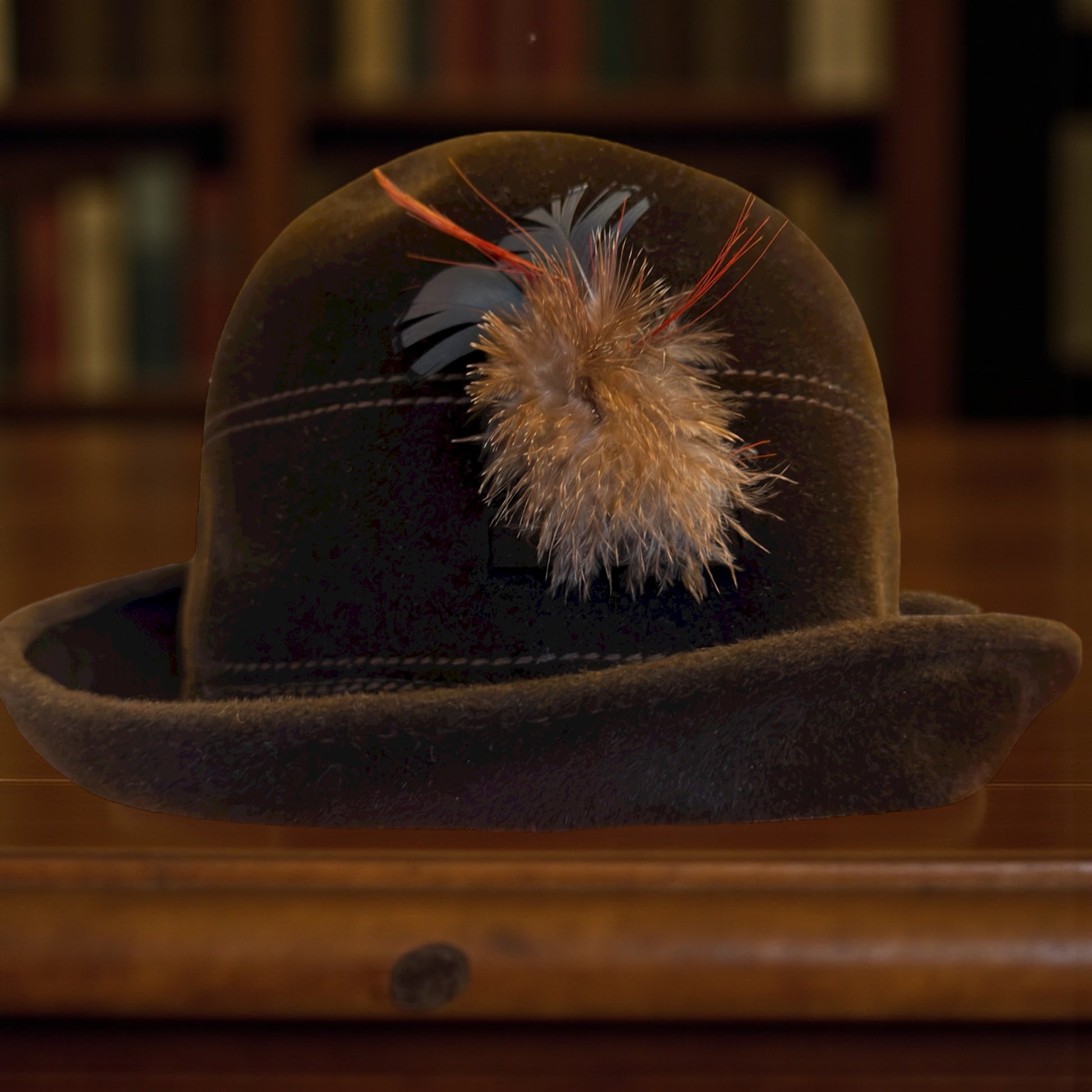 Splendido cappellino vintage in feltro di lana marrone con piuma di gallo cedrone
