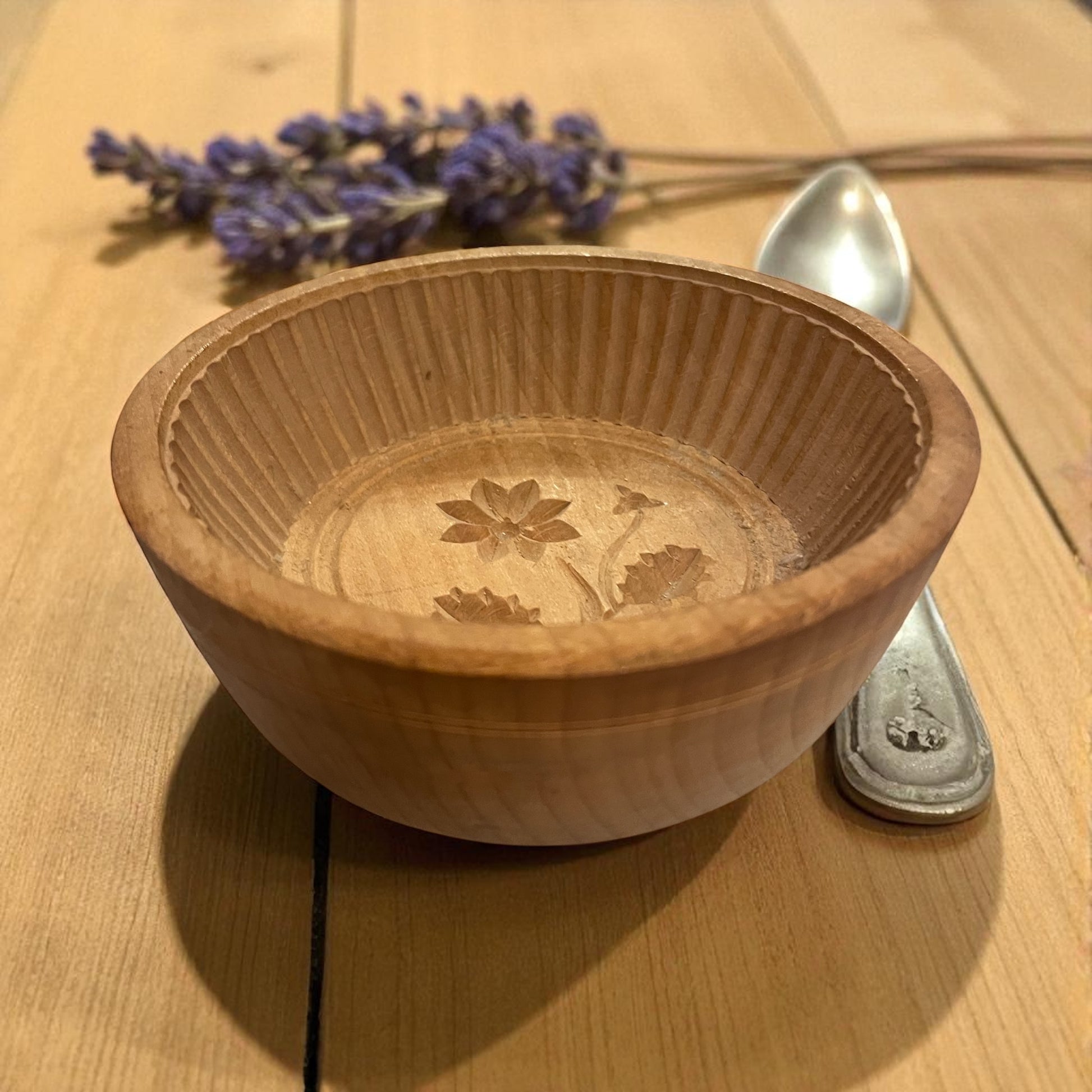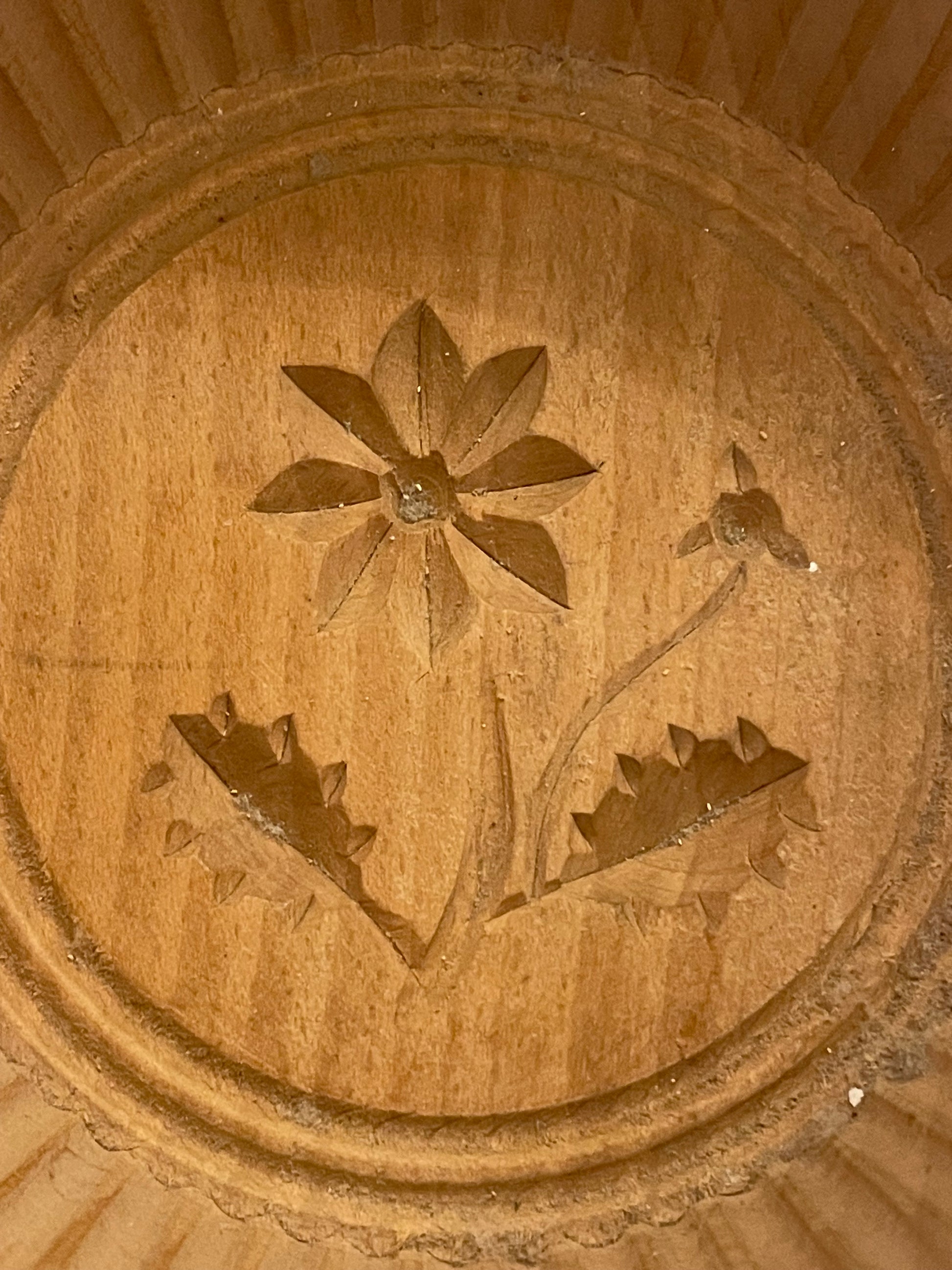 Nelle cucine alpine di primo ‘900 il burro non era solo alimento ma dono prezioso, da portare in tavola nei giorni di festa. Per questo veniva modellato con stampi in legno come questo, tornito a mano e inciso con un fiore stilizzato: un segno di bellezza semplice, nato tra le montagne. Ogni scanalatura racconta la pazienza dei gesti quotidiani, ogni venatura di legno custodisce il profumo delle case contadine alpine. Oggi resta un oggetto autentico, capace di evocare il calore e la poesia della vita rurale. Può arricchirà la tavola della vostra casa o essere un tocco speciale in un relais o in una dimora di charme. Ottime le condizioni.