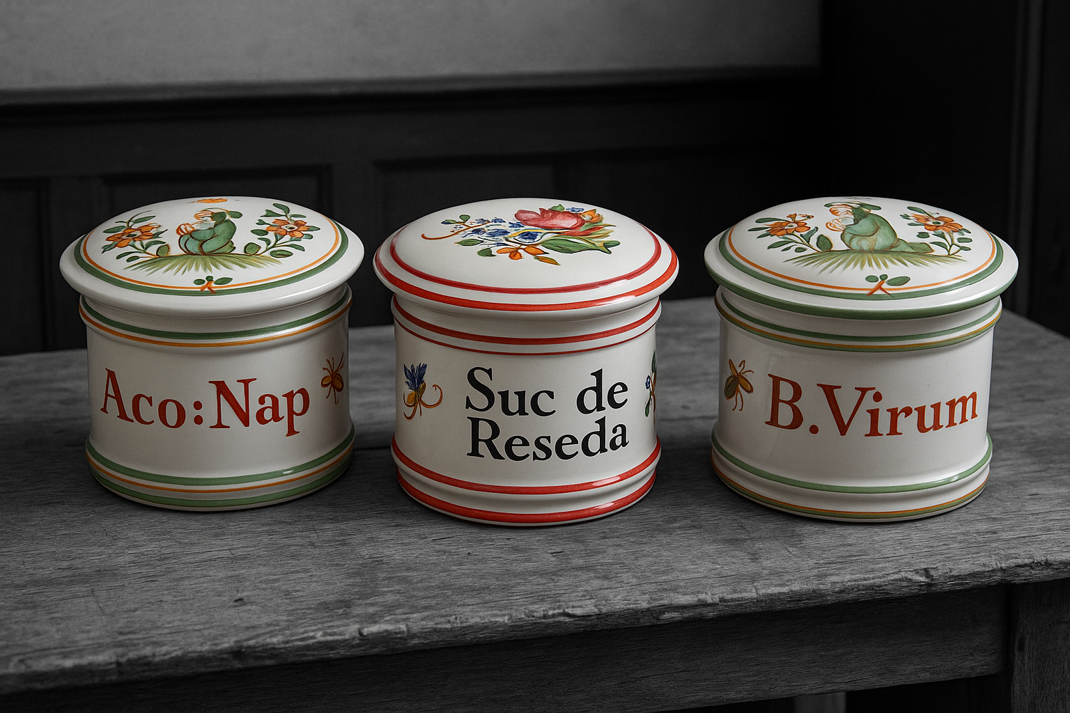 Un tempo le spezierie custodivano vasi di ceramica come questi, scrigni silenziosi che portavano incisi nomi misteriosi.