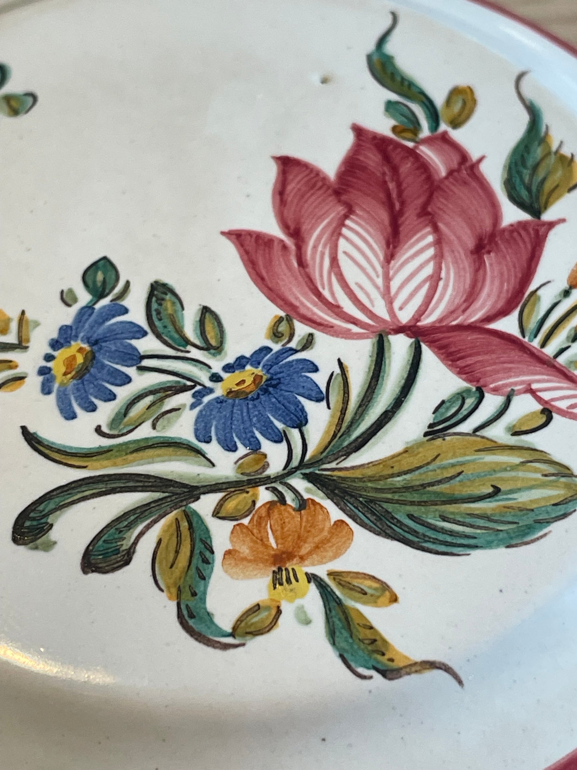 Set di 3 vasi da farmacia in ceramica vintage italiana. Decorazioni dipinte a mano, con motivi floreali e figure. Coperchi a battuta. Ottime condizioni complessive.