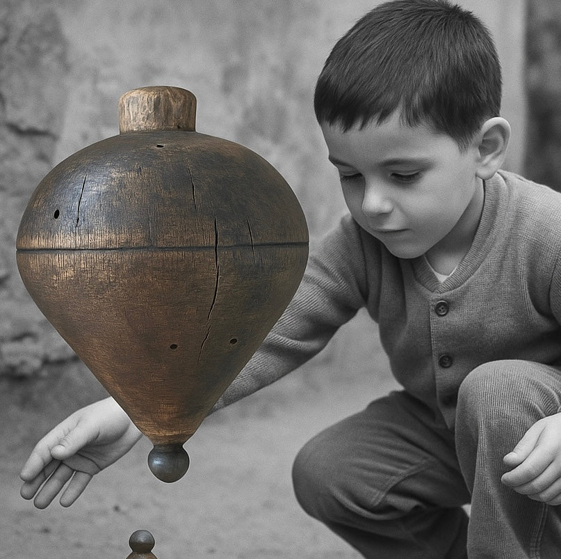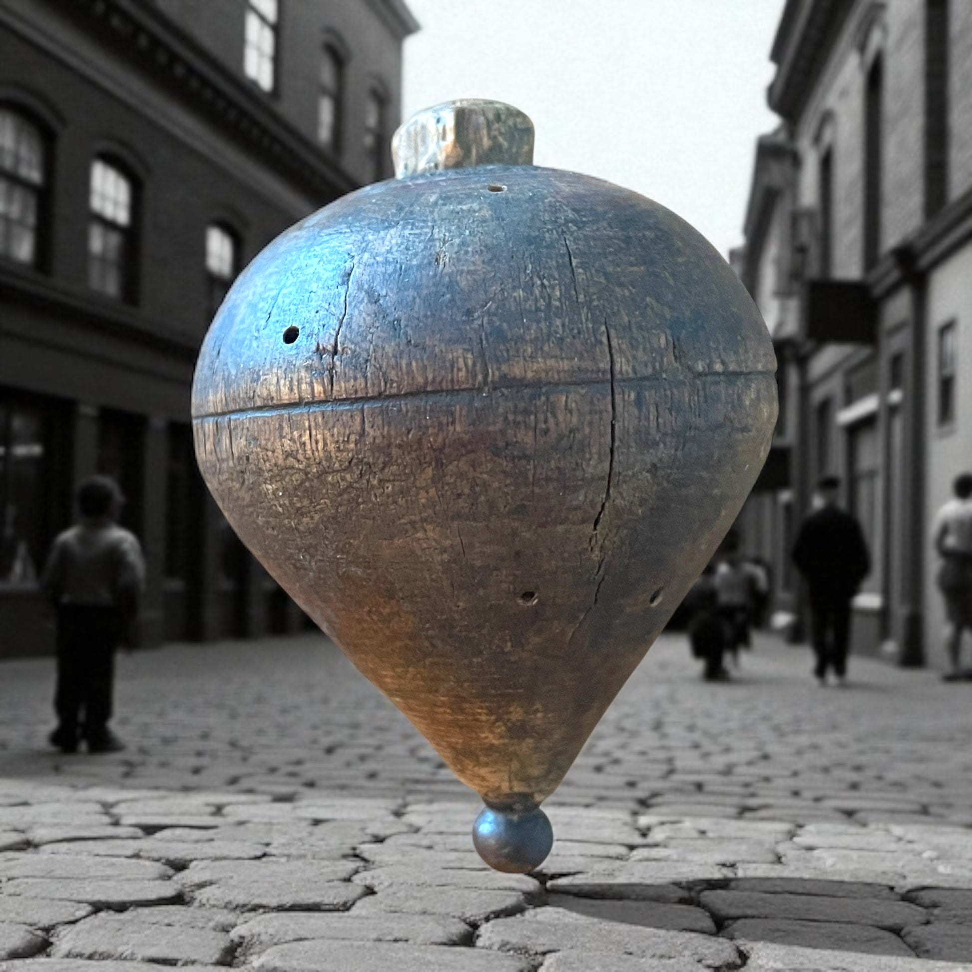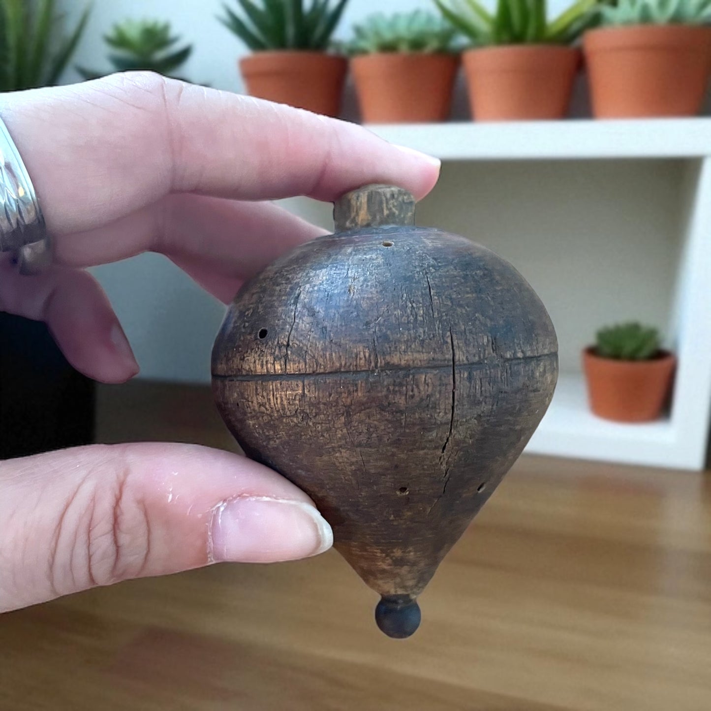 Questa antica trottola in legno, risalente con ogni probabilità alla fine dell’Ottocento, reca su di sé i segni autentici del tempo: crepe, piccoli fori da tarlo (già trattati con antitarlo) e una patina profonda che racconta storie di cortili polverosi e mani infantili. Realizzata a mano, con tornitura artigianale e punta in ferro arrotondata, non aveva bisogno di spigoli per girare: bastava lanciarla con precisione e prendeva vita. Si avvolgeva la cordicella tutta intorno al corpo della trottola, la si teneva tra le dita e, con un gesto secco ma sapiente, si liberava la forza e si guardava la magia. Nel gioco dei bambini di un tempo — quelli senza schermo e senza plastica — questa trottola era una sfida tra amici, ma anche un esercizio di equilibrio e concentrazione. Talvolta si giocava a “scalzarla”, facendo urtare le trottole avversarie per vedere quale restava in piedi più a lungo. Oggi conserva un senso raro di movimento fermo nel tempo, e porta con sé il profumo di legno antico e polvere di quella buona, quella che si posa sopra le infanzie felici.