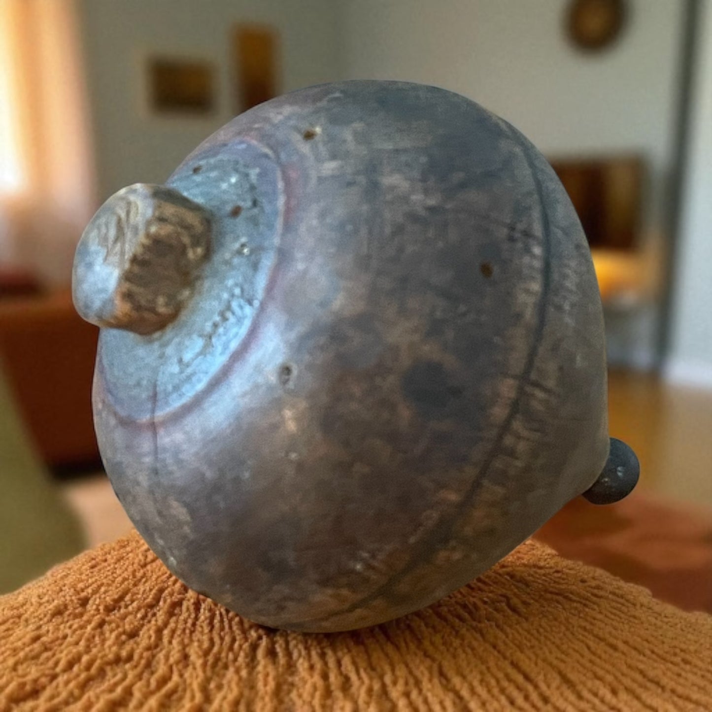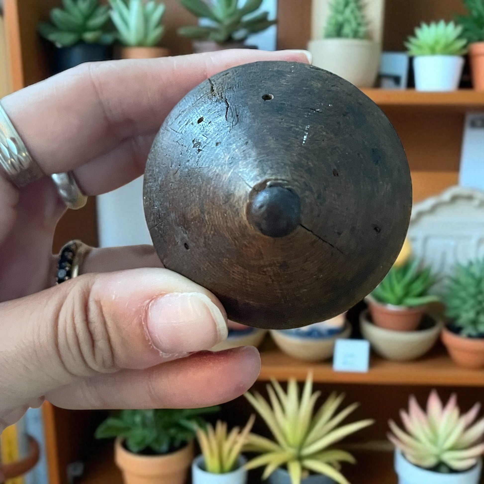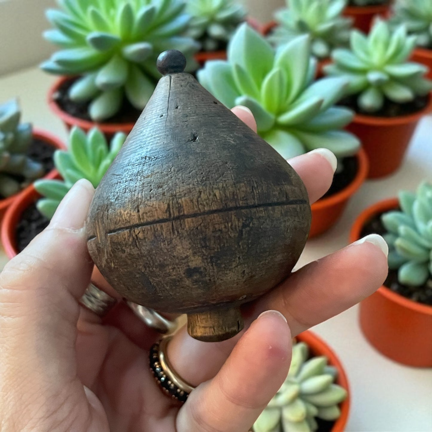 Questa antica trottola in legno, risalente con ogni probabilità alla fine dell’Ottocento, reca su di sé i segni autentici del tempo: crepe, piccoli fori da tarlo (già trattati con antitarlo) e una patina profonda che racconta storie di cortili polverosi e mani infantili. Realizzata a mano, con tornitura artigianale e punta in ferro arrotondata, non aveva bisogno di spigoli per girare: bastava lanciarla con precisione e prendeva vita. Si avvolgeva la cordicella tutta intorno al corpo della trottola, la si teneva tra le dita e, con un gesto secco ma sapiente, si liberava la forza e si guardava la magia. Nel gioco dei bambini di un tempo — quelli senza schermo e senza plastica — questa trottola era una sfida tra amici, ma anche un esercizio di equilibrio e concentrazione. Talvolta si giocava a “scalzarla”, facendo urtare le trottole avversarie per vedere quale restava in piedi più a lungo. Oggi conserva un senso raro di movimento fermo nel tempo, e porta con sé il profumo di legno antico e polvere di quella buona, quella che si posa sopra le infanzie felici.