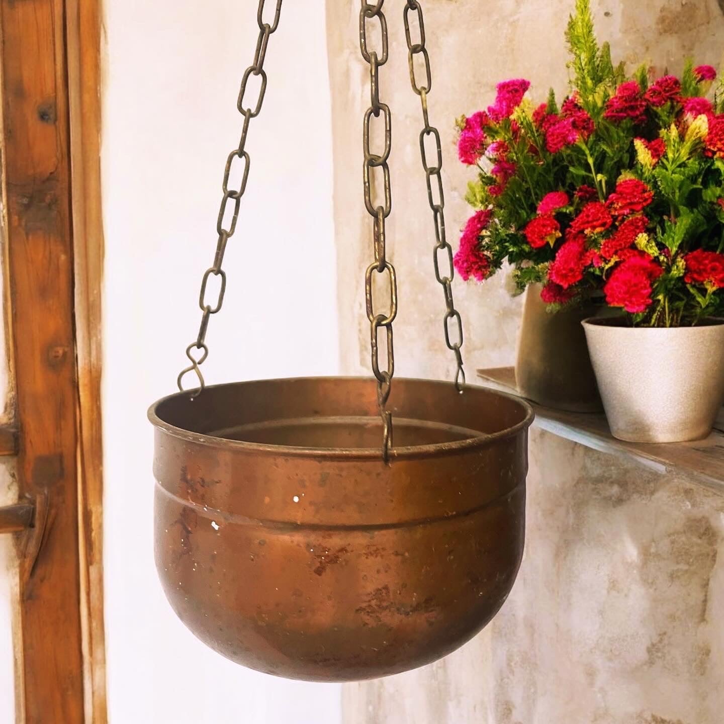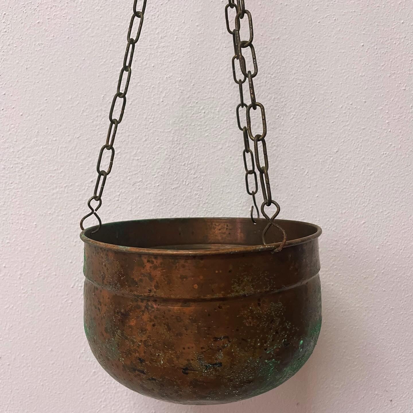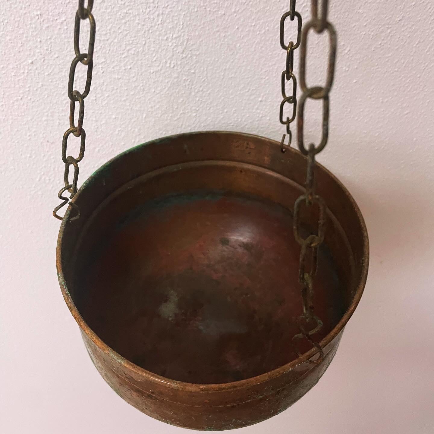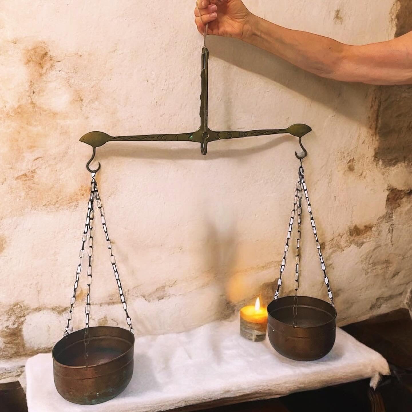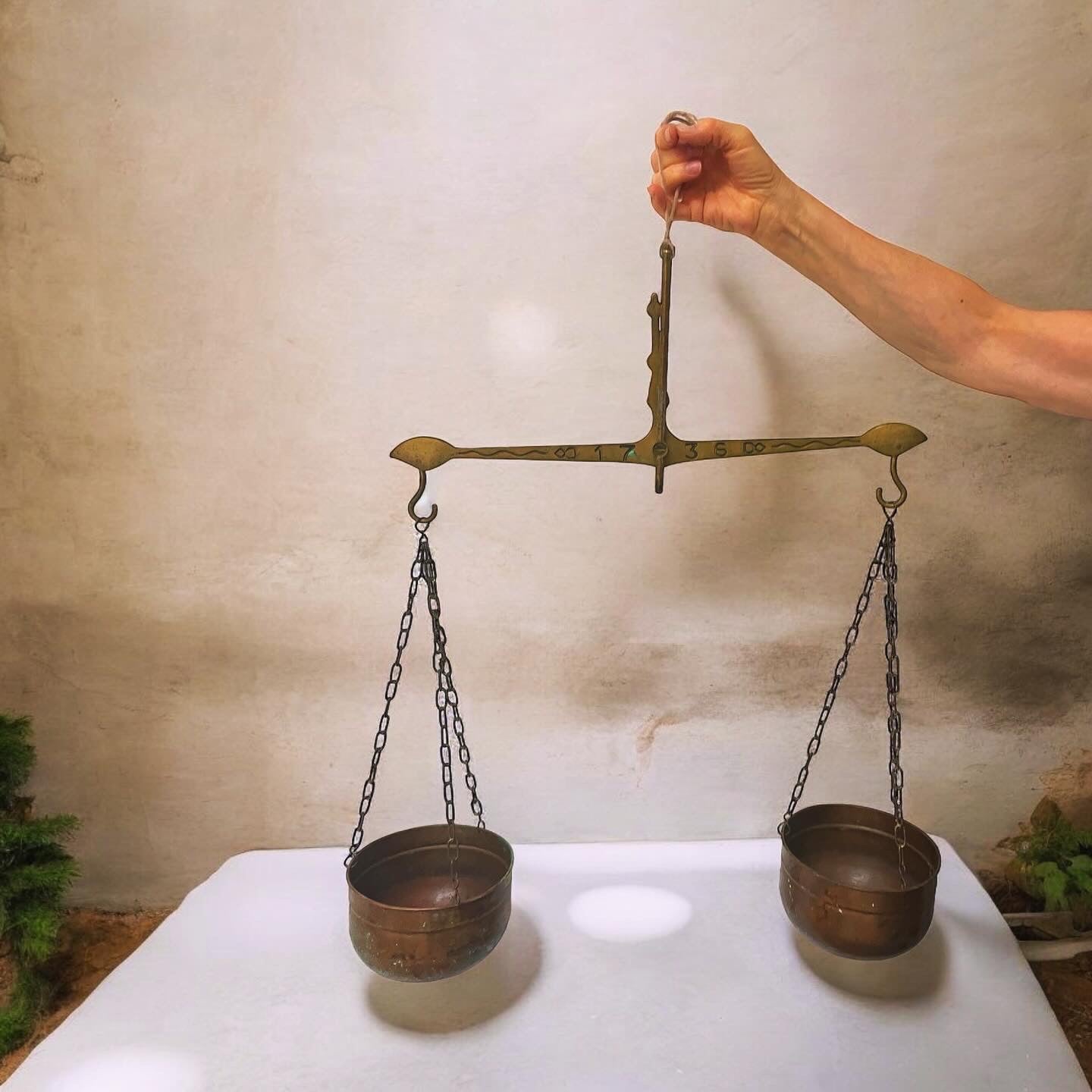 La grande vecchia bilancia, due piatti a coppa in rame e asta in ottone, ideale per essere appesa sia a parete che a soffitto. Può essere lasciata in mostra di per sé stessa oppure essere rivisitata - noi vi abbiamo messo frutta e verdura, uno spettacolo. Ideale nella vostra cucina dei sogni. L’altezza complessiva è di cm 75, in diametro delle coppe è di cm 17 e la lunghezza dell’asta cm 52.