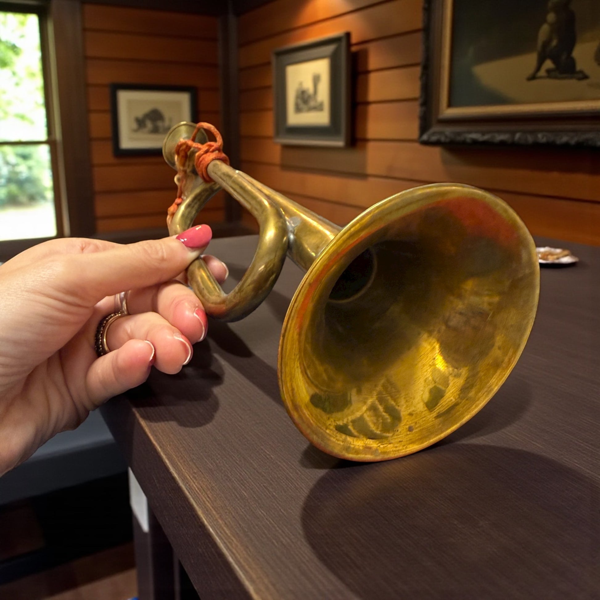 C’è un suono che non ha bisogno di farsi sentire per evocare memorie: quello del silenzio dopo un richiamo. Questa piccola tromba in ottone, modellata sul design delle antiche bugle militari, porta con sé l’eco di cerimonie e parate lontane. Il suo corpo lucido, segnato dal tempo, racconta di mani che un tempo la tenevano alta, sotto il sole o davanti a un vessillo. Oggi non suona più, ma la sua voce vive nel metallo che ha conosciuto il vento e la storia. Perfetta come oggetto d’arredo o come simbolo di forza e memoria, conserva intatta la sua dignità.
