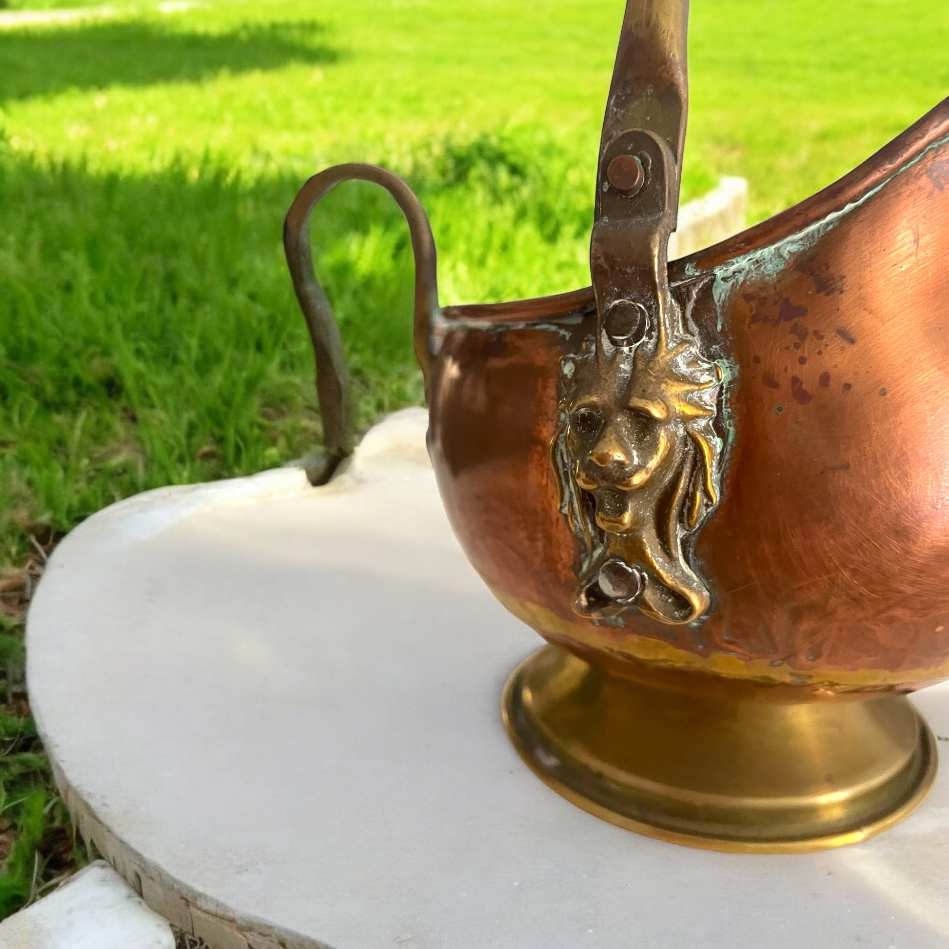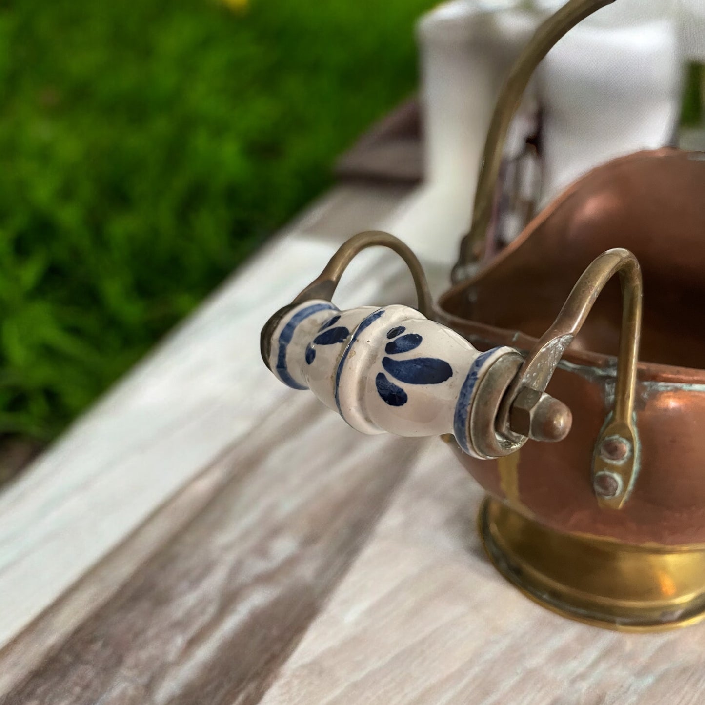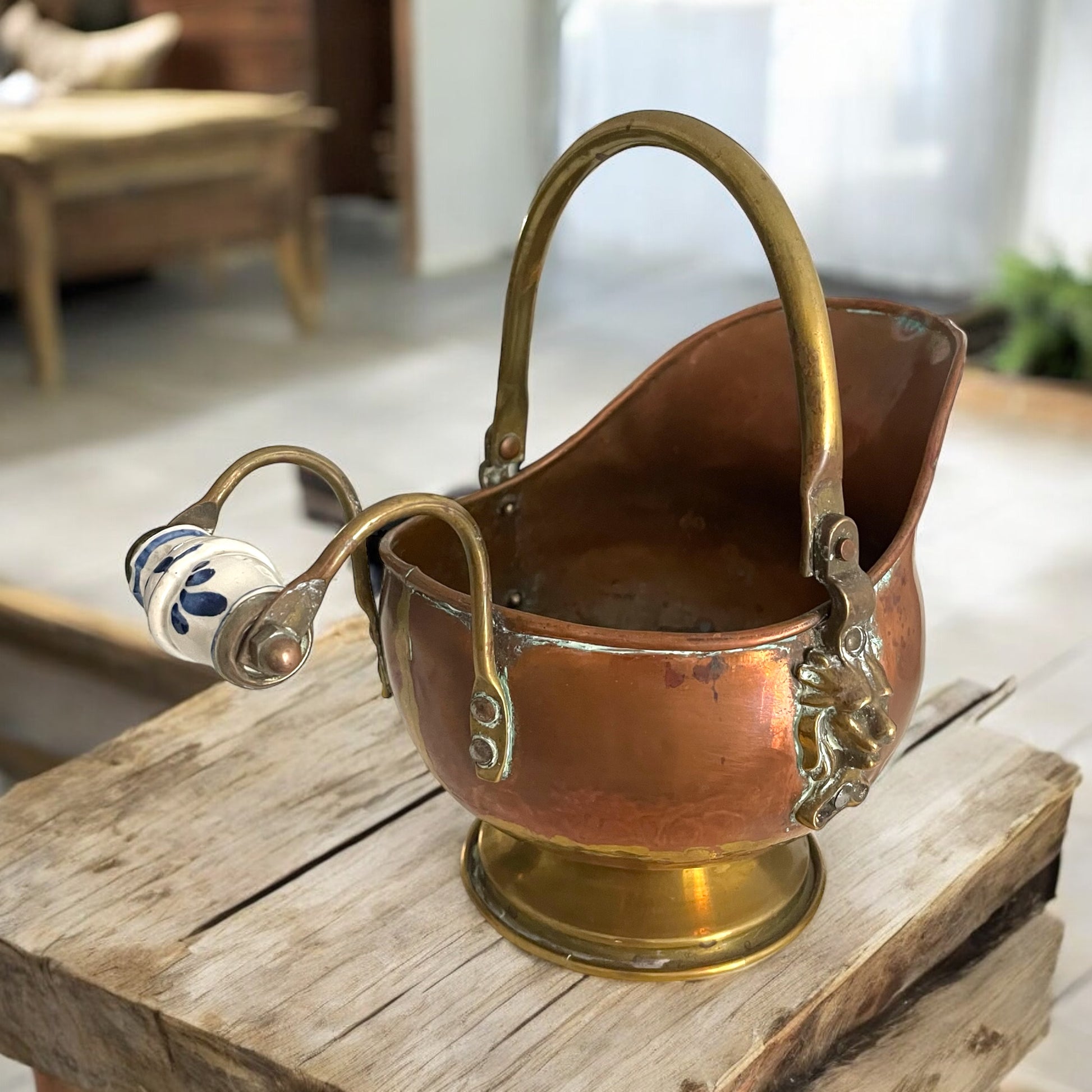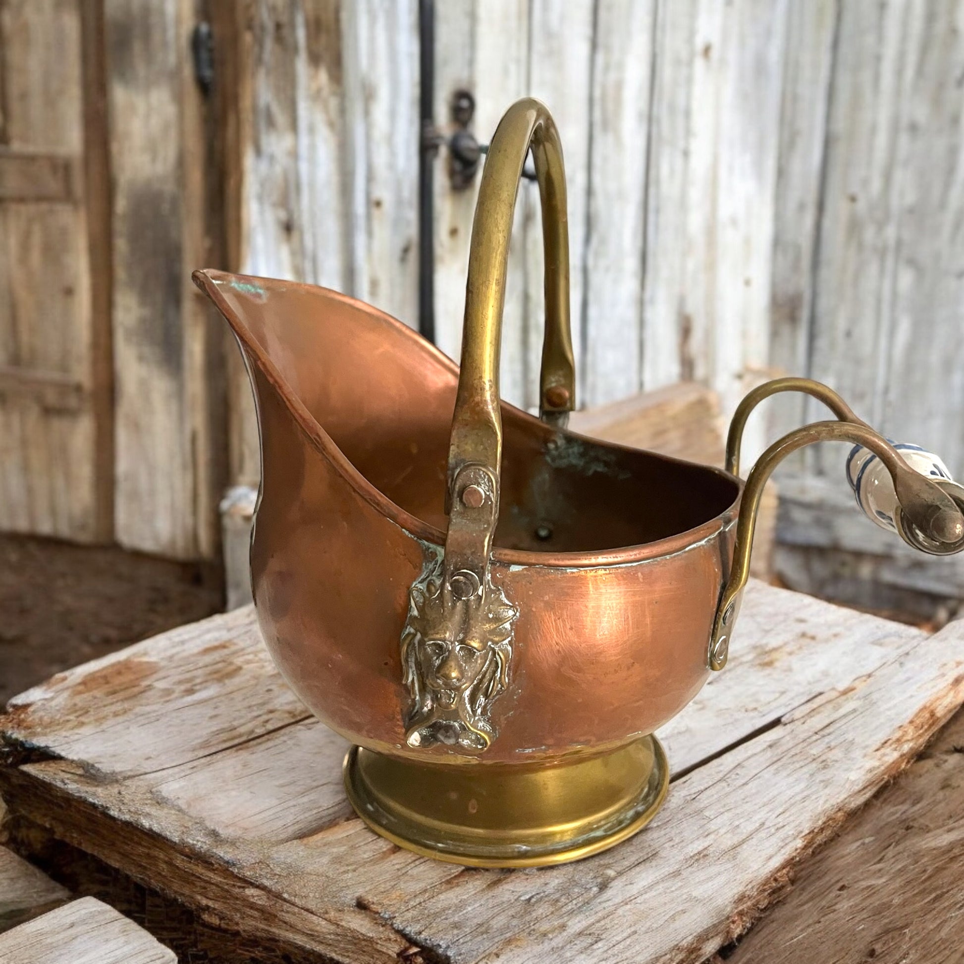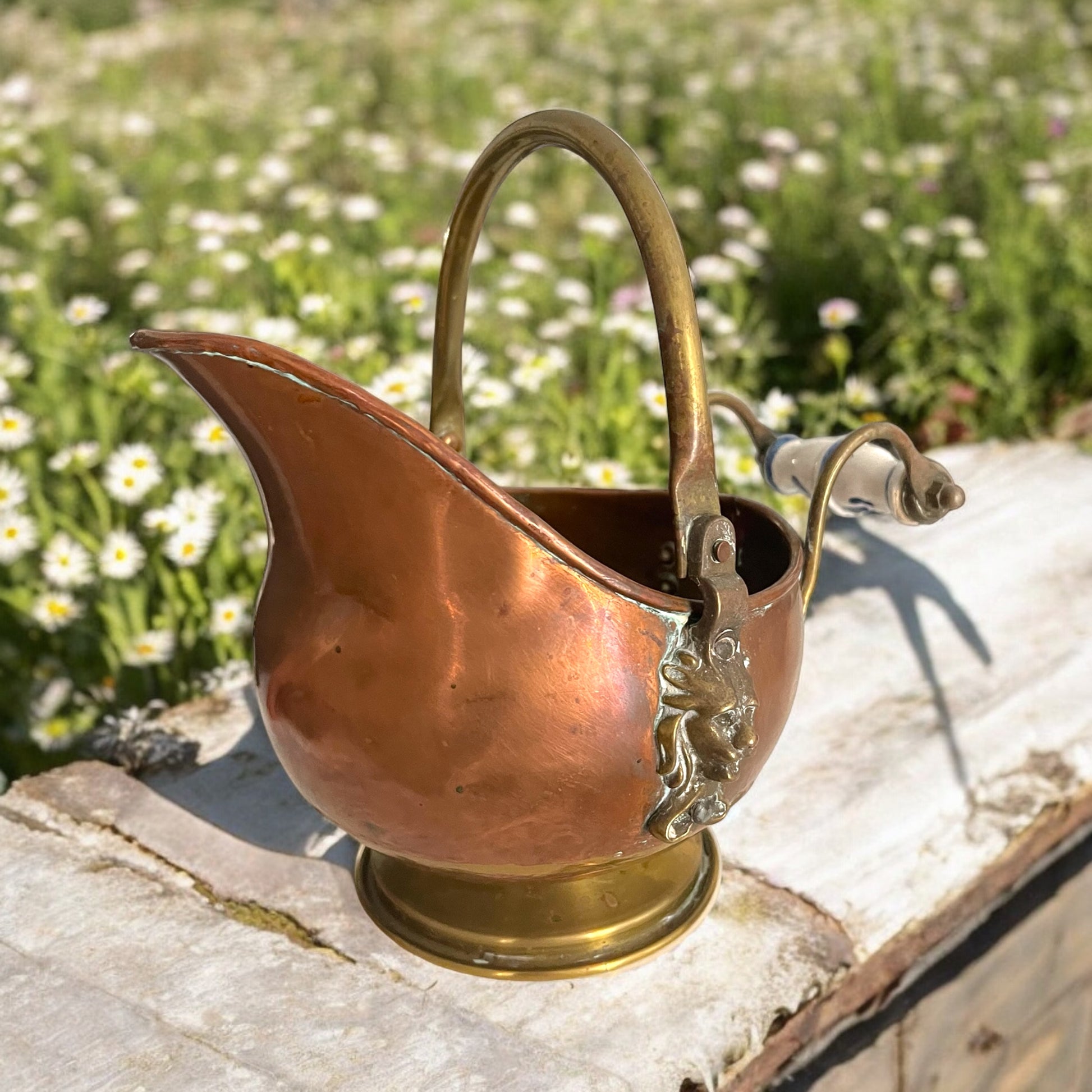 Vecchio prendi carbone in rame tipico della tradizione olandese, con bel manico in ceramica di Delft bianca e blu, ornato ai lati con due bei mascheroni leonini. Provvisto di manico e beccuccio, l’altezza è cm 19 ed è super versatile - può essere usato come vaso, porta piante, porta caramelle, o per metterci le lavette arrotolate per gli ospiti… solo per darvi qualche spunto tra i tanti.
