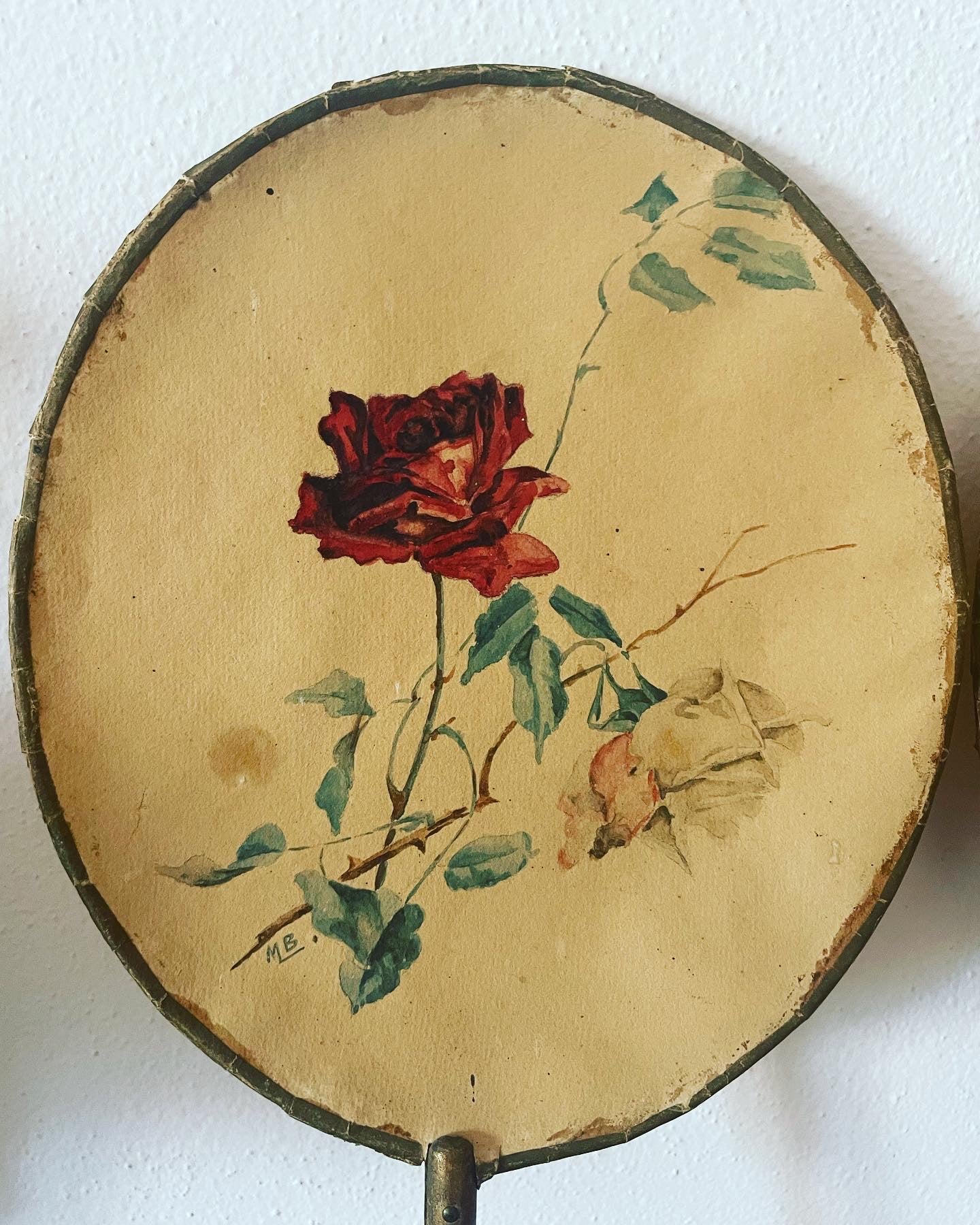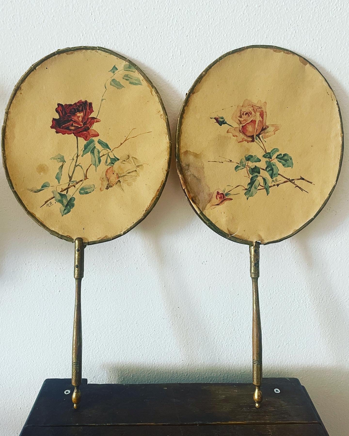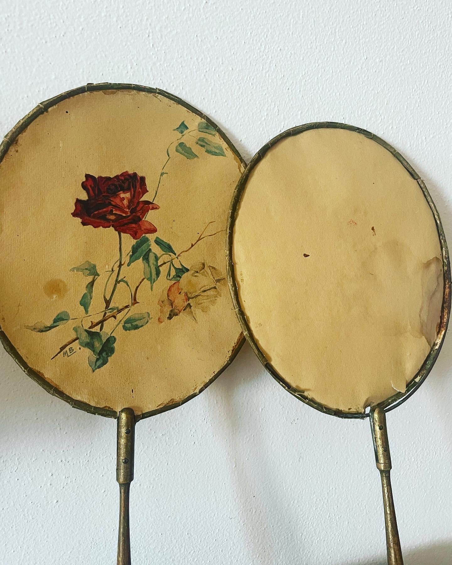 Eccola la #chicca ! Direttamente dall’ #inizionovecento due grandi #antichi #ventagli in #ottone e carta #dipintiamano con due #acquarelli #floreali firmati. Sono stupendi, #romantici , ideali come #decorazionevintage ma anche come regalo per una persona speciale. I disegni rivelano una mano aggraziata, esperta e delicata nei tratti.