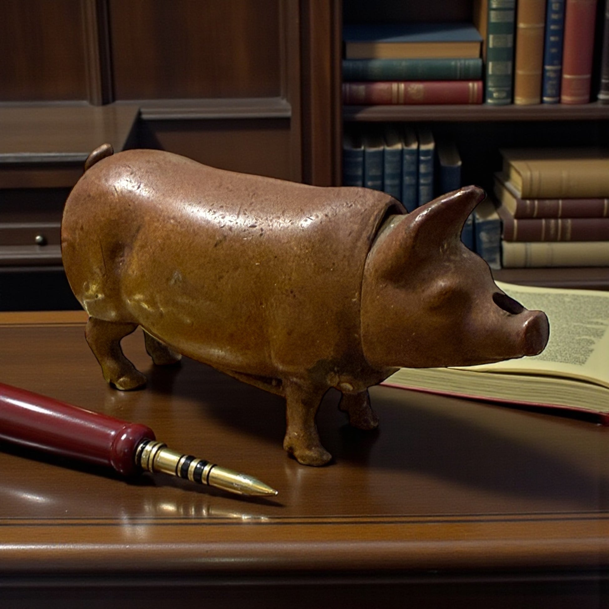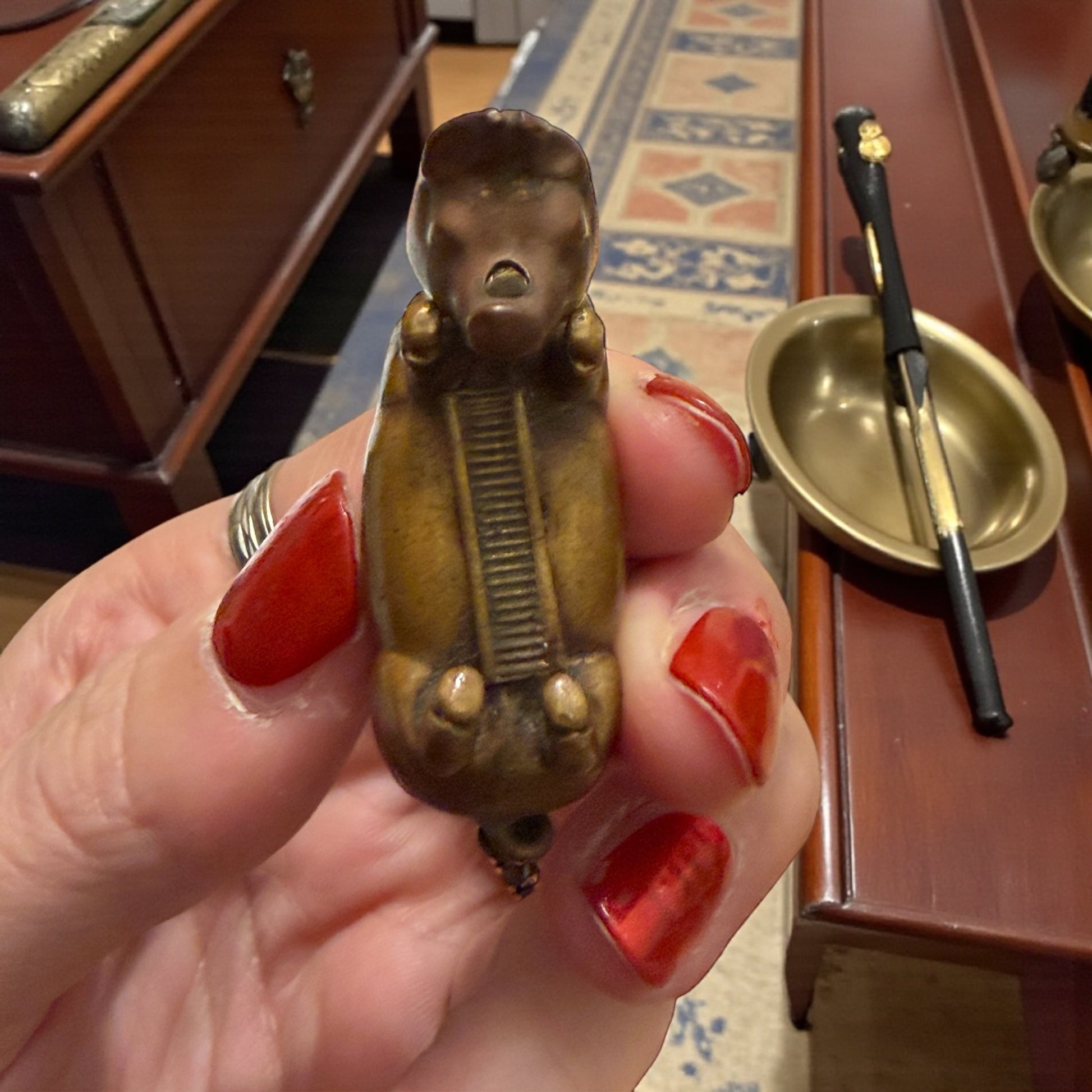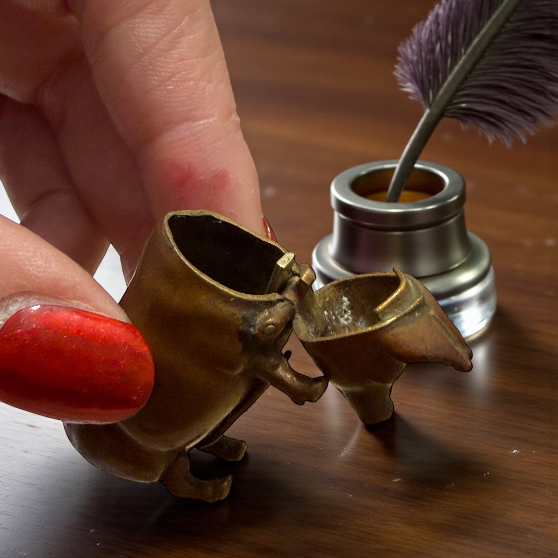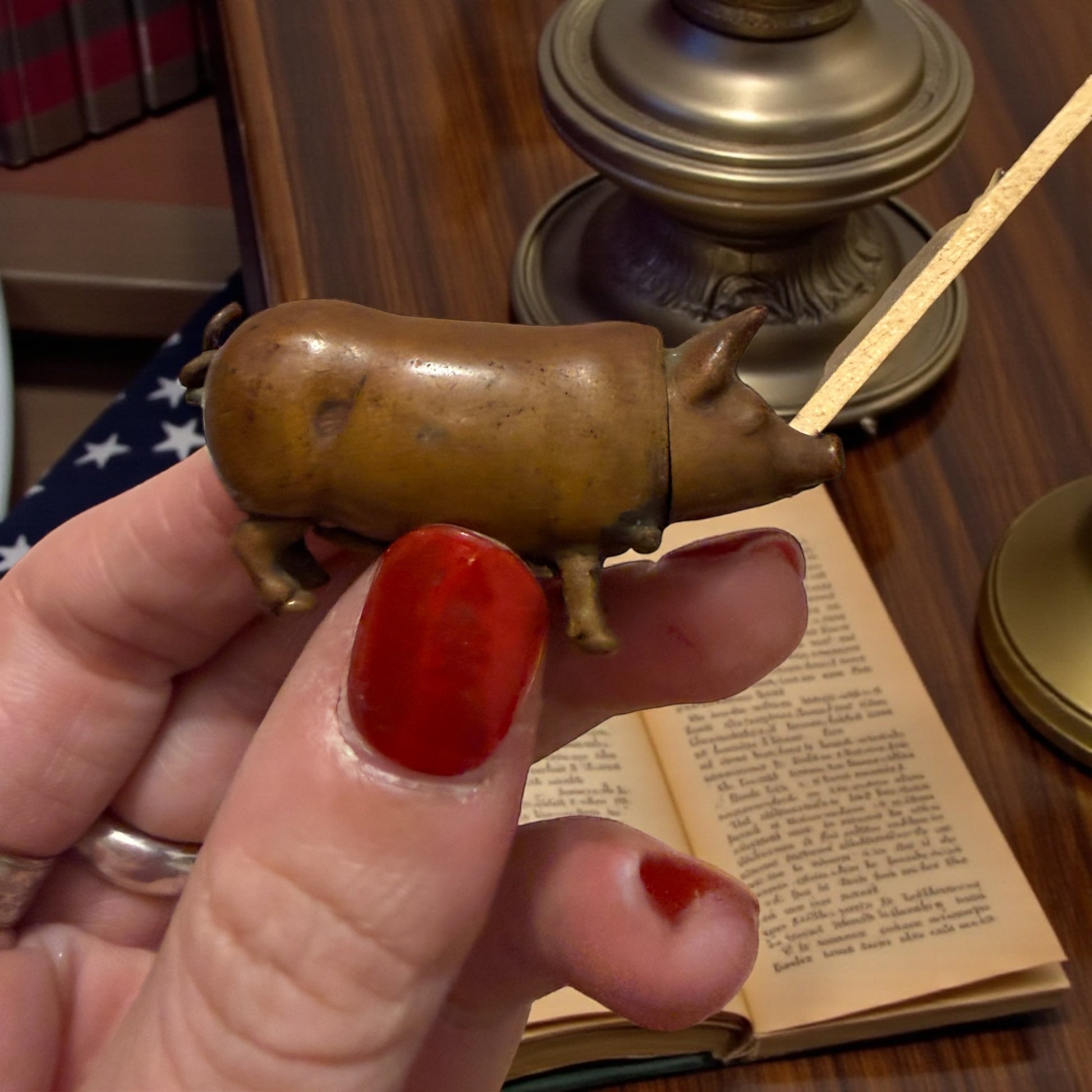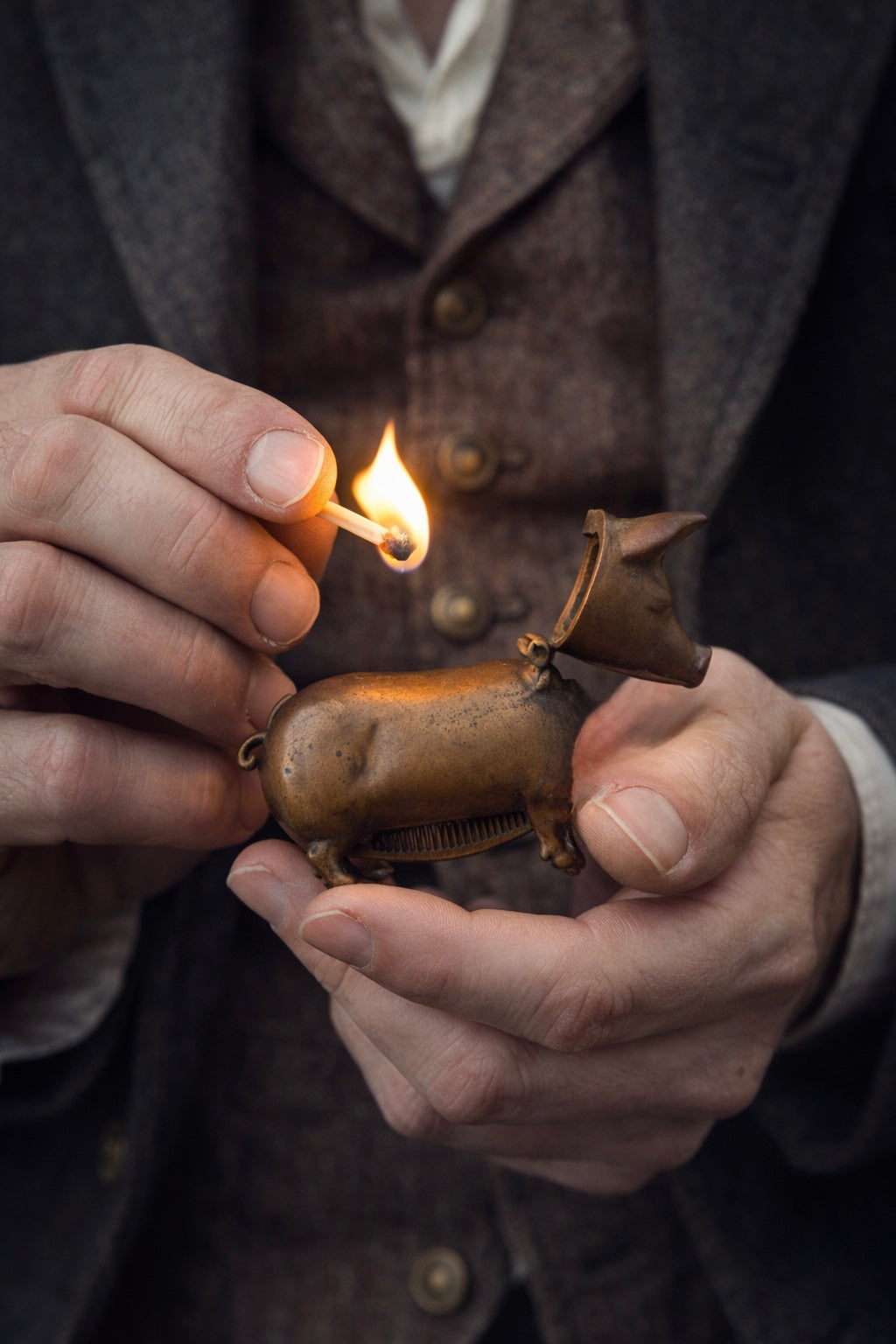 Sta in tasca, ma sembra appena uscito dalla magica mano di un orafo - sebbene non sia oro. Questo piccolo maialino in ottone non è un soprammobile: è un vesta case antico, nato quando il fuoco si portava addosso e ogni gesto quotidiano aveva un oggetto dedicato. La testa si apre con una cerniera discreta, rivelando lo spazio per i fiammiferi; sotto il ventre, quasi nascosto, corre lo striker zigrinato, pronto a far scoccare la scintilla. La fusione è morbida, piena, sorprendentemente espressiva: le pieghe del corpo, il muso appena schiacciato, la coda arrotolata raccontano una mano piu da vero artista che da artigiano. Il maiale — simbolo antico di abbondanza, fortuna e prosperità — diventa qui custode del fuoco, piccolo talismano domestico o da tasca. È uno di quegli oggetti che non possono non essere notati, collezionati, amati. E lo avevate visto a Cash or Trash? 👀