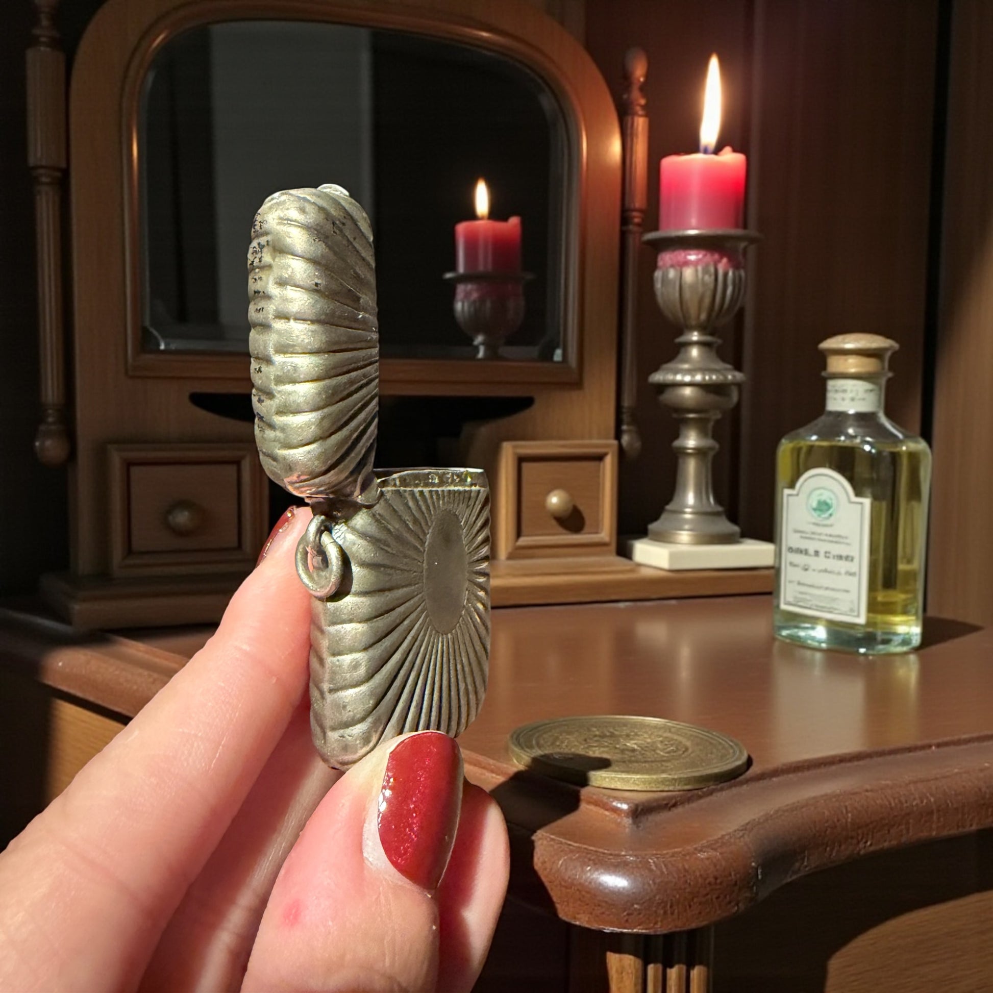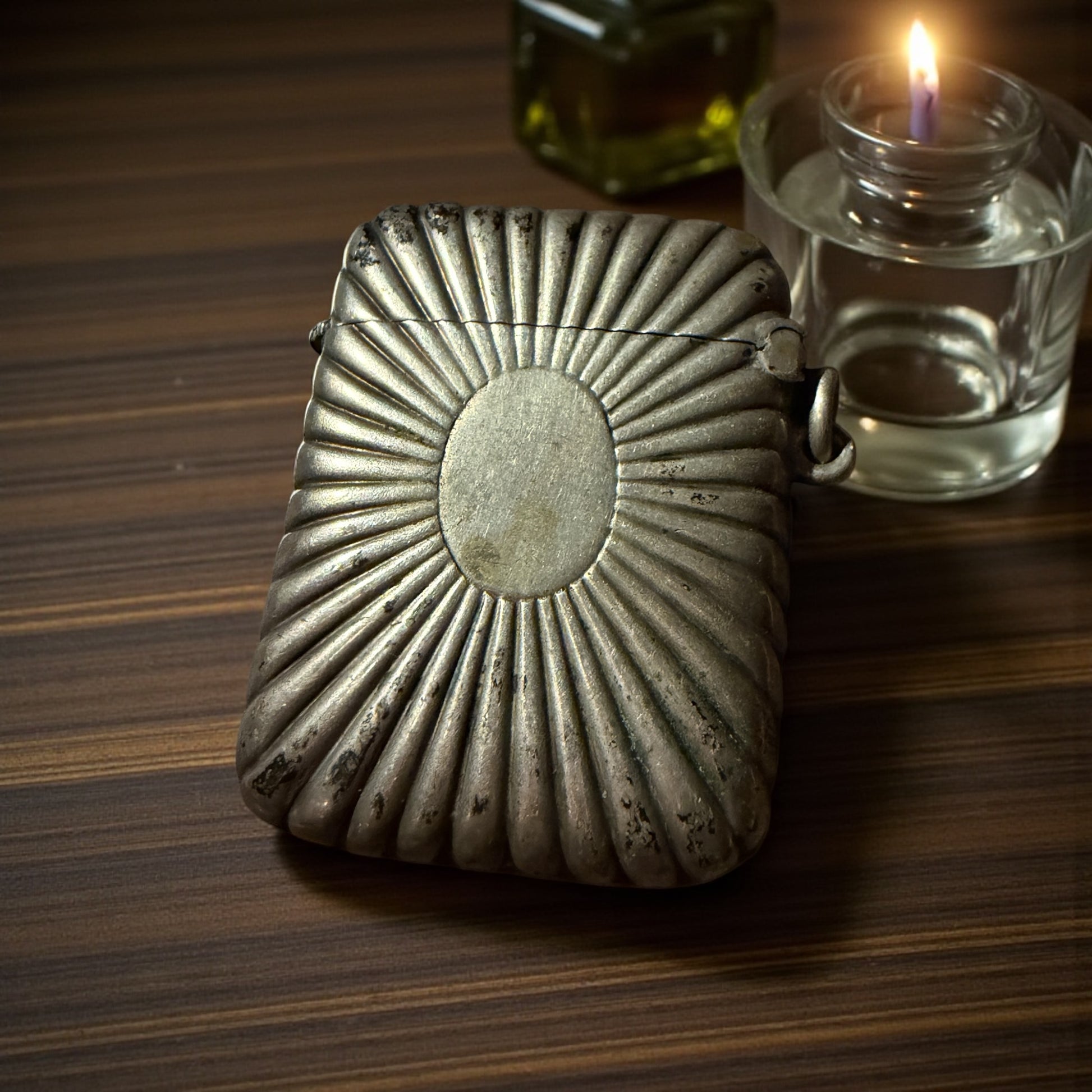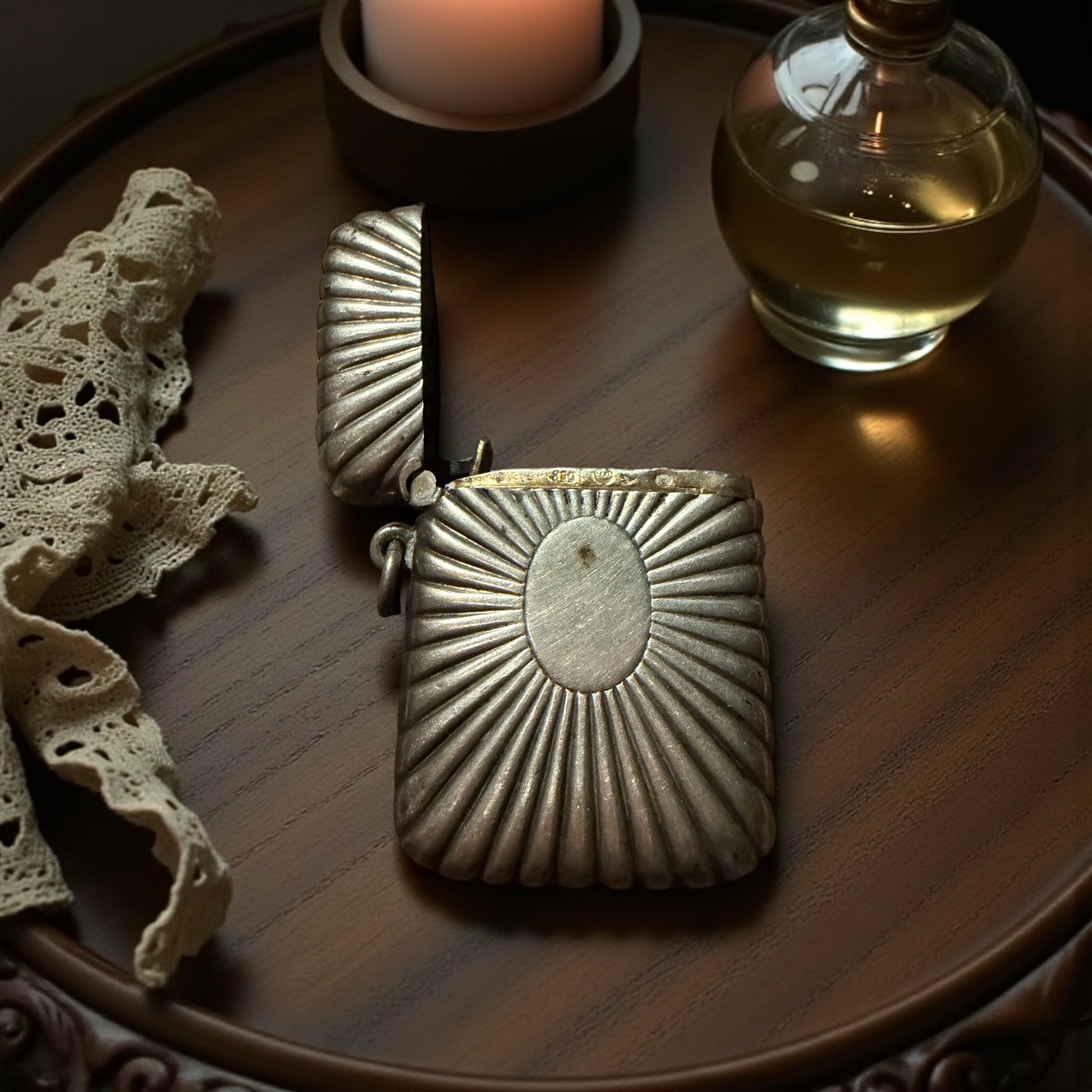 Quando l’ho preso in mano per la prima volta, ho sentito sotto il polpastrello quella raggiera che si apre come un piccolo sole antico. È un porta-fiammiferi che non stava in tasca: stava appeso alla chatelaine, quella catena che le donne dell’Ottocento portavano alla cintura come un mazzo di chiavi simbolico, fatto di piccoli strumenti preziosi. Immagino una donna elegante, in una città dell’Europa centrale, con i guanti di pelle fine e la gonna che sfiora il selciato. Questo piccolo oggetto d’argento seguiva ogni suo passo con un tintinnio soffice. Le righe a raggiera catturavano la luce dei lampioni a gas, mentre lei estraeva un fiammifero per accendere una candela, una lampada, o forse per scaldare un momento di intimità in una notte fredda. L’argento è vissuto, con quella patina che non si può imitare: si costruisce solo con oltre un secolo di vita. Il medaglione ovale è rimasto miracolosamente vuoto, mai inciso, come se nessuno avesse voluto imporre un nome a questo piccolo sole tascabile. È un frammento di quotidianità di un’altra epoca: oggi profuma ancora di quella vita portata in giro, appesa a una cintura, insieme ai segreti che le donne dell’Ottocento custodivano nella loro chatelaine.