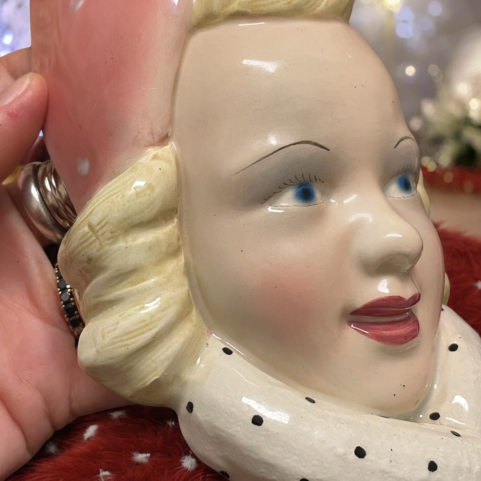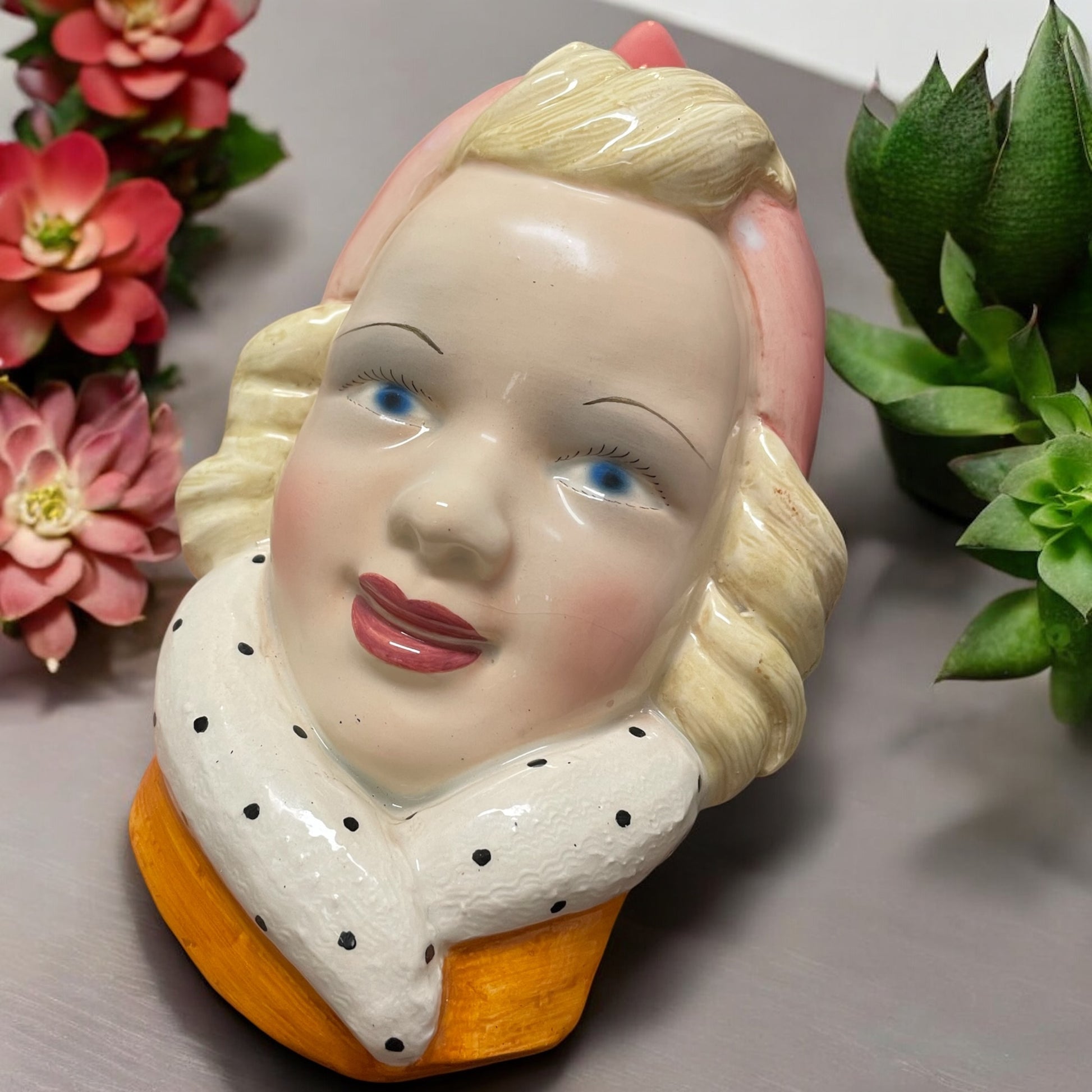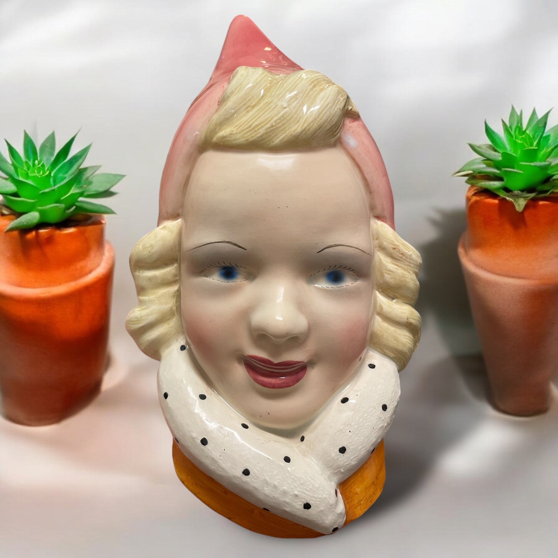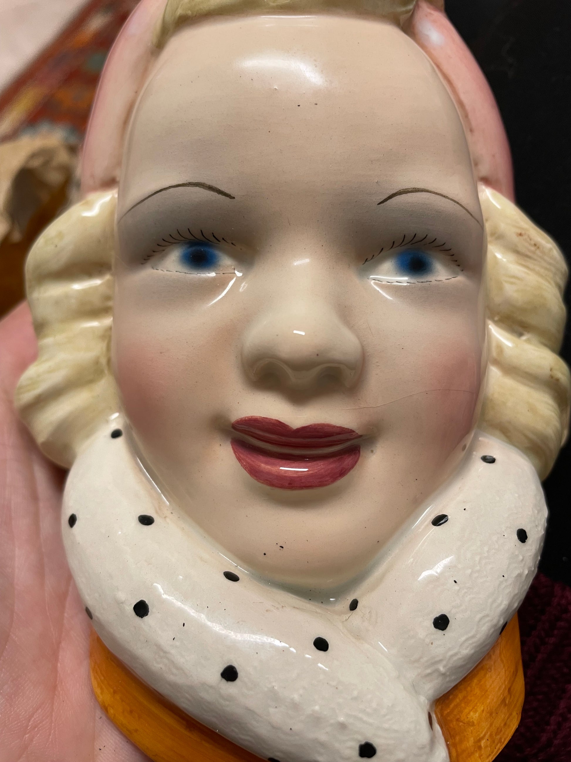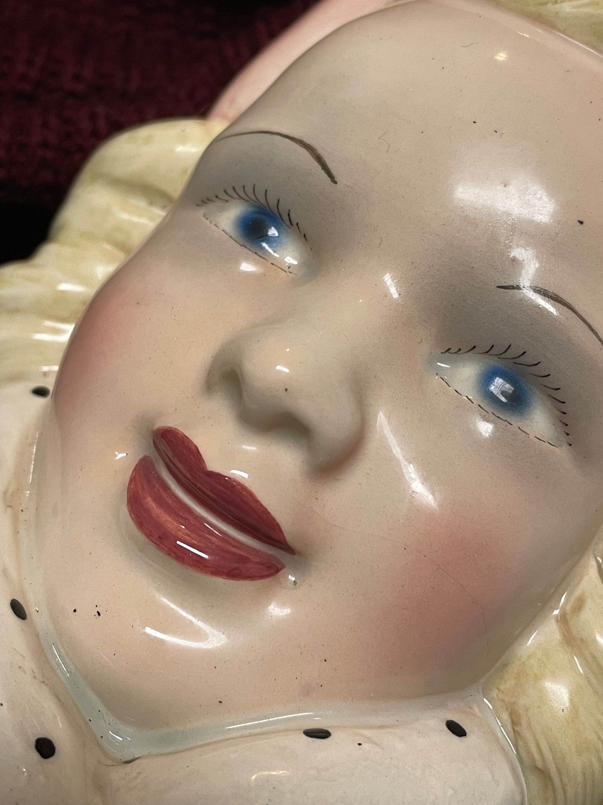 Un volto che incanta e racconta una storia di eleganza senza tempo. Questa ceramica, realizzata tra il 1958 e il 1960 dalla celebre manifattura Olimpia, affonda le sue radici nel prestigioso retaggio di Lenci, di cui è erede. Un’opera che incarna il fascino della metà del Novecento, con la sua delicatezza cromatica e l’inconfondibile cura dei dettagli. Il soggetto, una giovane donna dagli occhi sereni e dal sorriso enigmatico, richiama un’epoca in cui l’arte decorativa trovava espressione in forme armoniose e volti idealizzati. La morbidezza delle linee si sposa con la vivacità dei colori, dalle guance rosate al copricapo rosa che incornicia i capelli biondi con raffinata semplicità. A tergo la firma “Italy” e il numero di produzione. Una felure alla guancia sinistra, come da foto, non ne inficia la bellezza. Sono ceramiche difficili da trovare e difficili da attribuire; qui la caratteristica grafia ci fa risalire direttamente ai Tosin di Vicenza. Altezza cm 22.