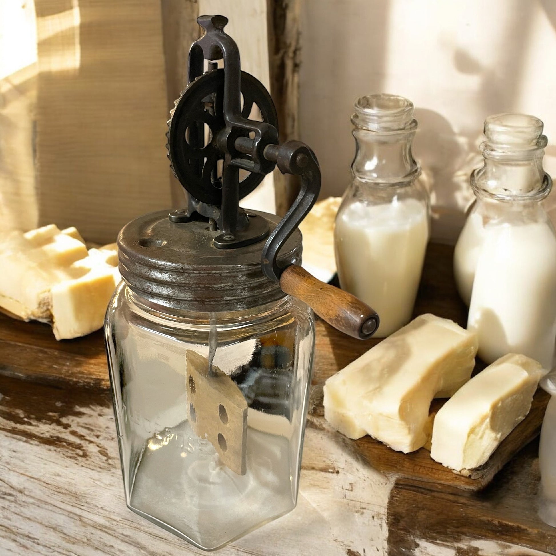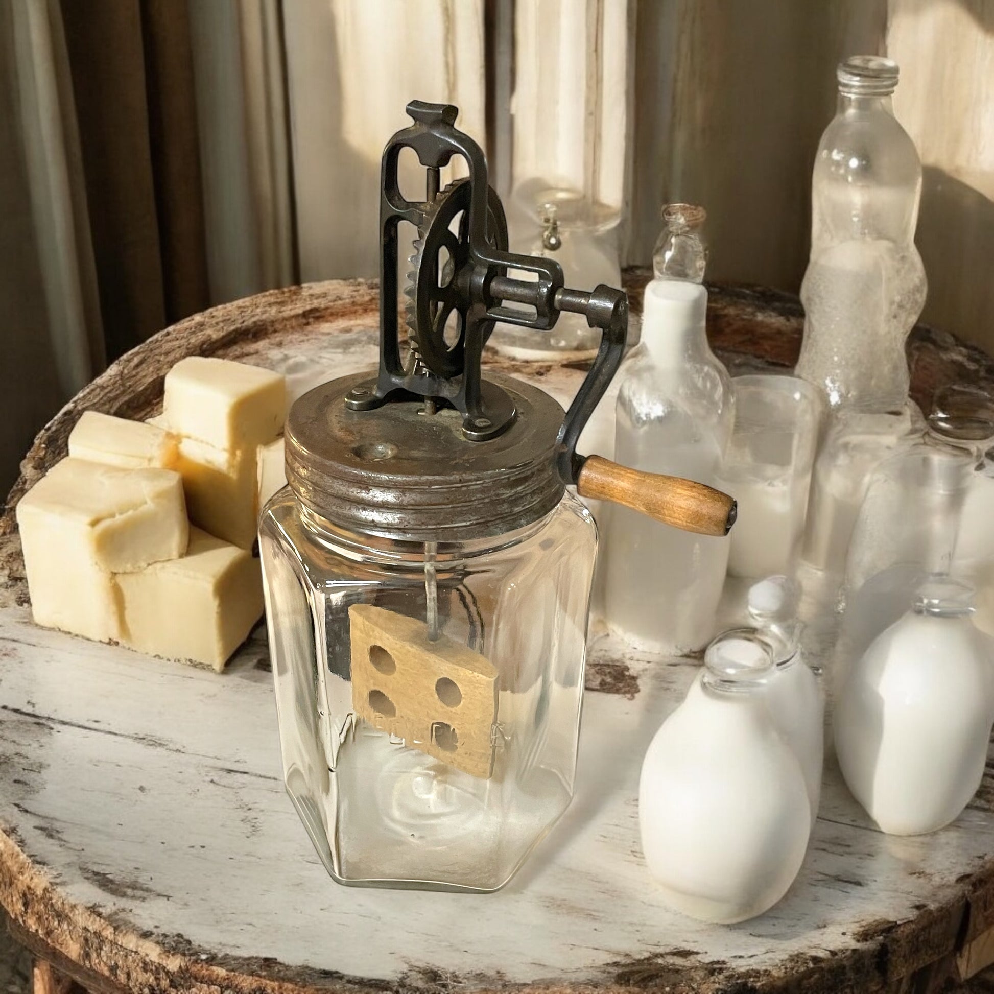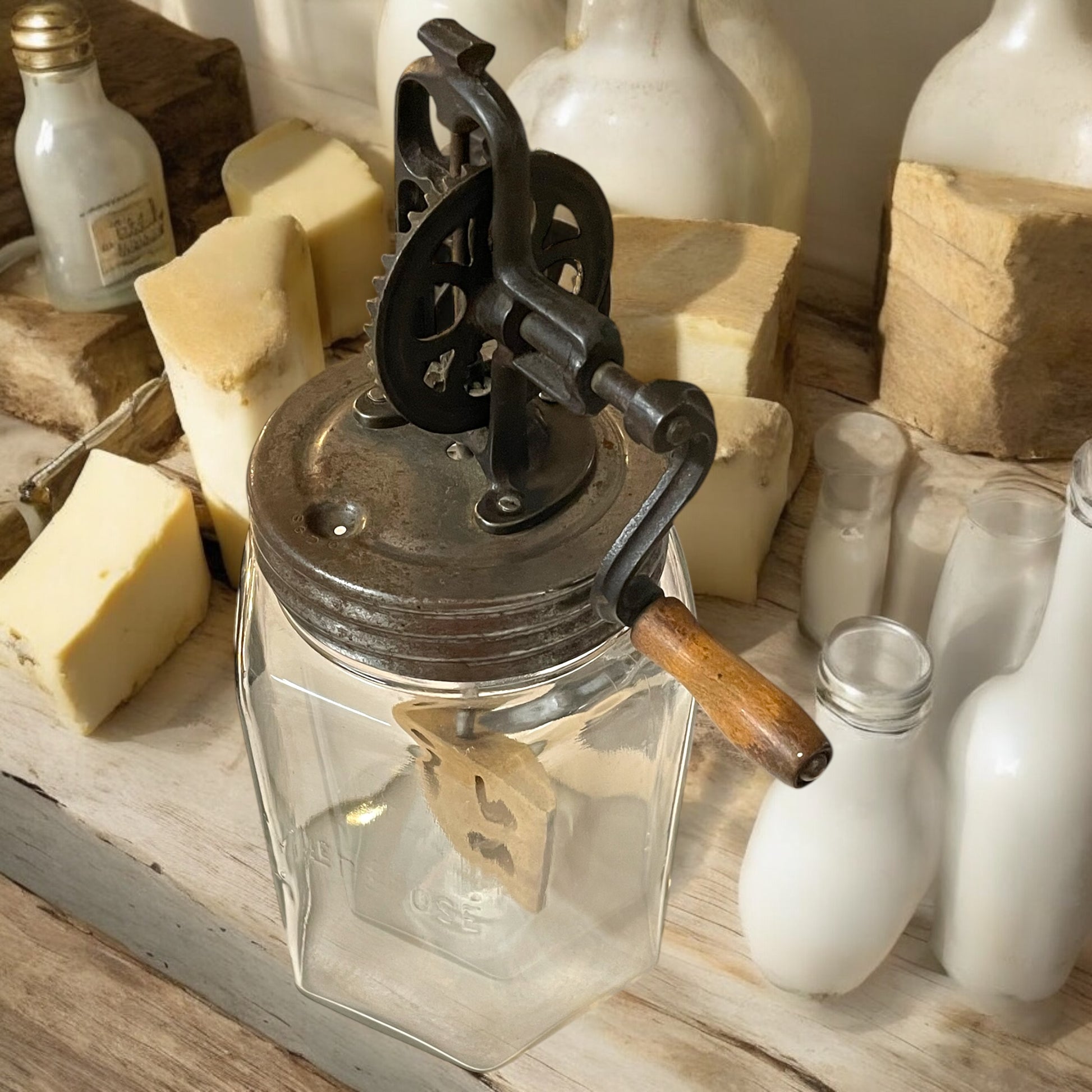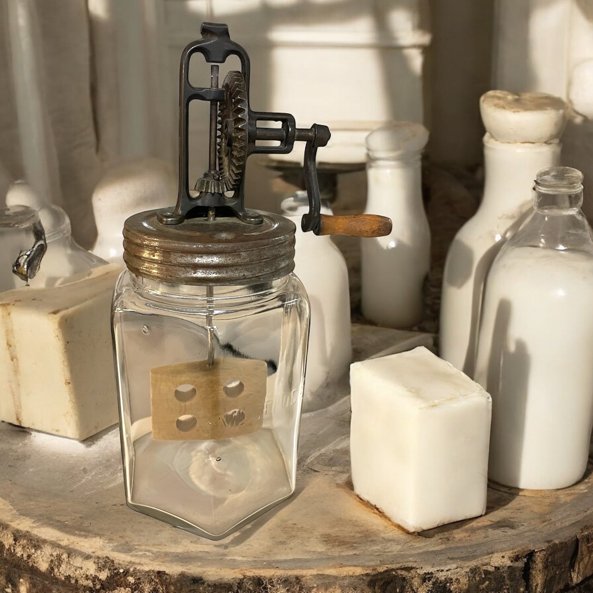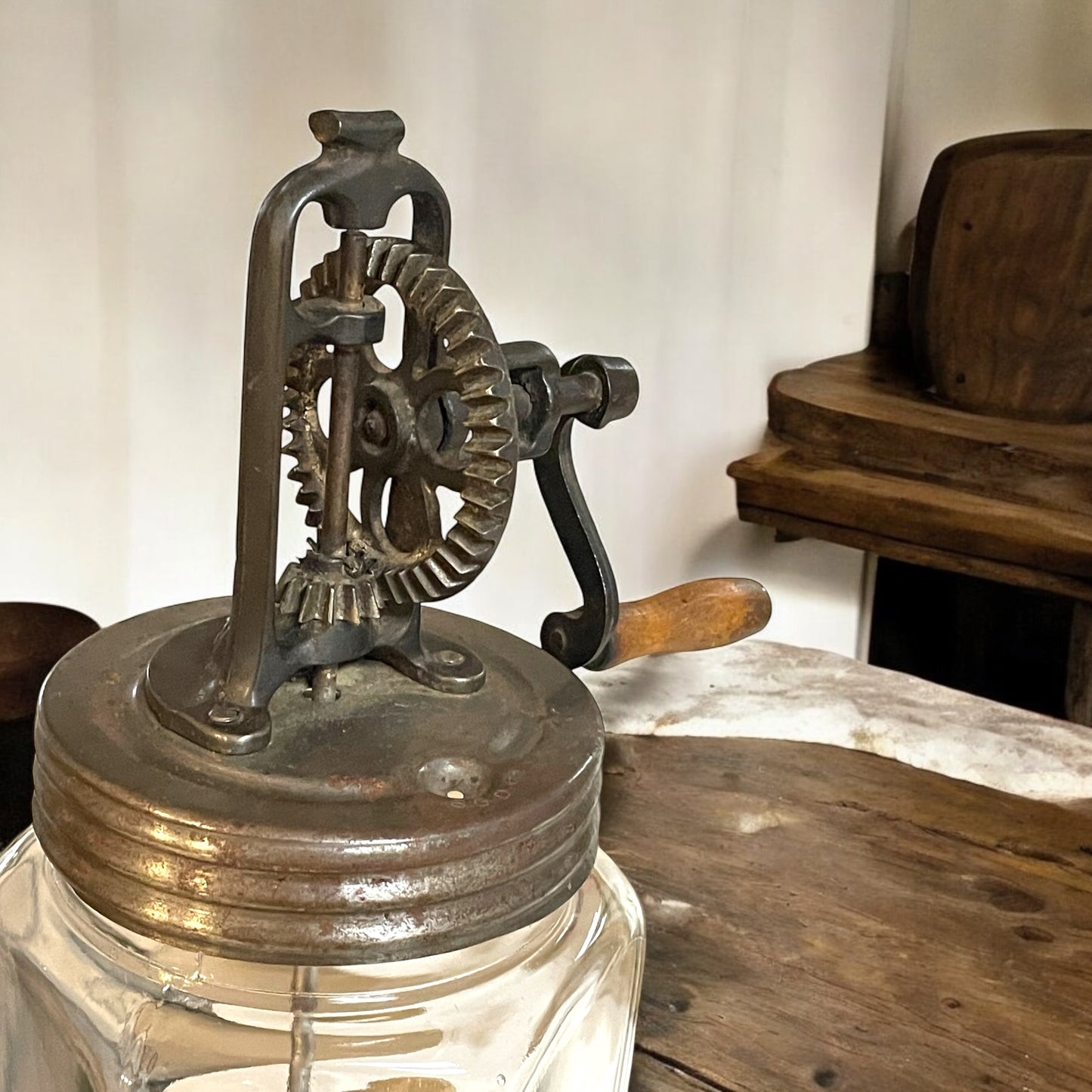 Questa zangola manuale in vetro marchiata Ceres è un ottimo esempio di eleganza e funzionalità domestica della prima metà del Novecento. Perfettamente conservata e funzionante, con il suo meccanismo in metallo e la manovella in legno originale, rappresenta un pezzo autentico proveniente da una antica cucina francese. La paletta interna, in legno, è stata progettata per mescolare la panna in modo uniforme: mentre la manovella gira, le sue aperture creano un movimento che rompe i globuli di grasso contenuti nella panna, favorendo la separazione del burro dal latticello. Questo processo manuale, oggi quasi dimenticato, era il cuore di una tradizione casalinga che trasformava ingredienti semplici in burro fresco e genuino. Le zangole con recipiente in vetro, come questa, sono oggi particolarmente ricercate; non solo dai collezionisti ma anche da chi desidera valorizzare contesti legati alla ristorazione, al turismo, al settore alimentare. Perfette come elemento decorativo, raccontano una storia di autenticità e cura per le tradizioni, aggiungendo un tocco di fascino senza tempo. Le condizioni di queste esemplari sono ottime, è marchiato sul vetro, ed è alto centimetri 33.